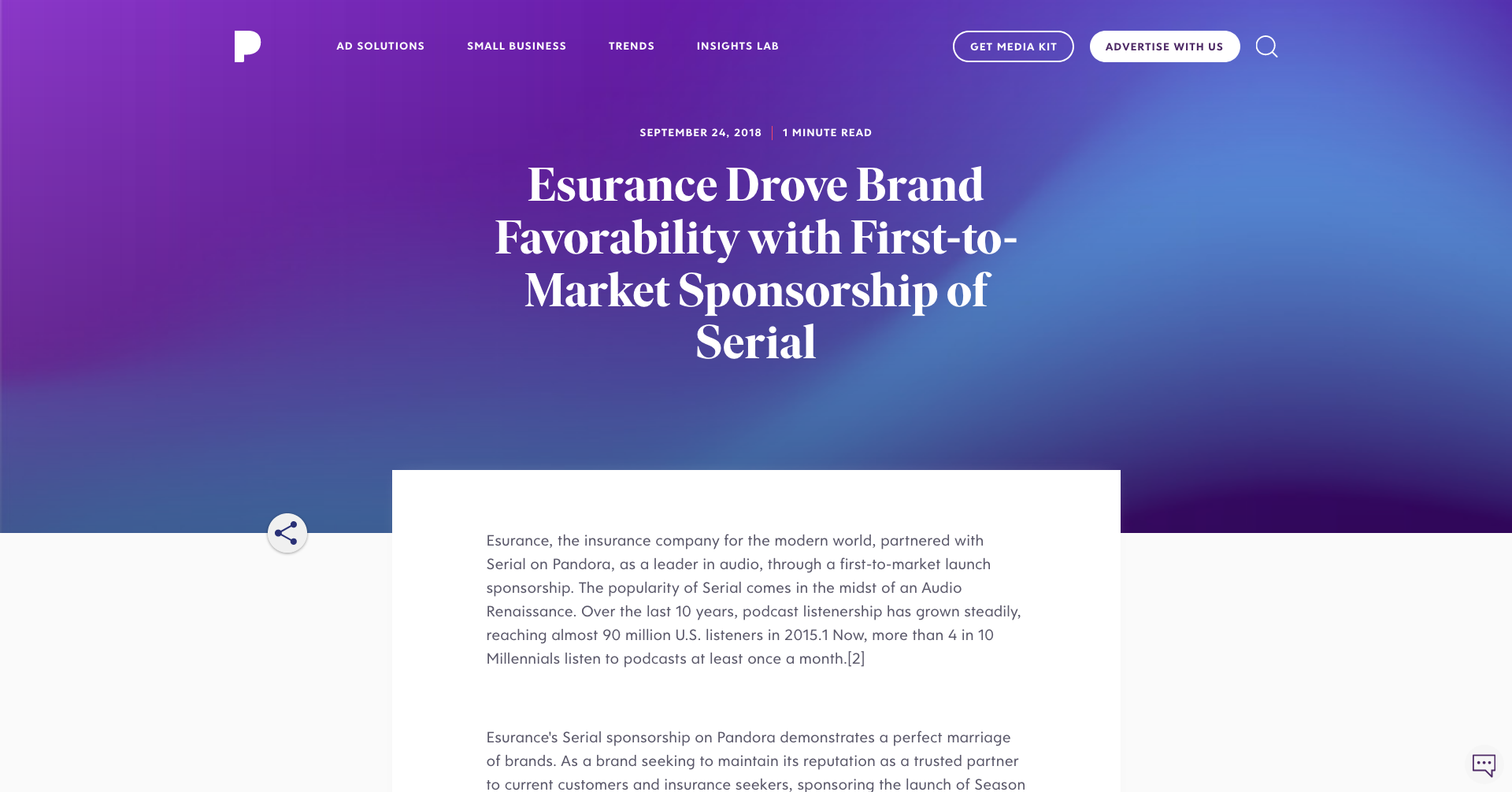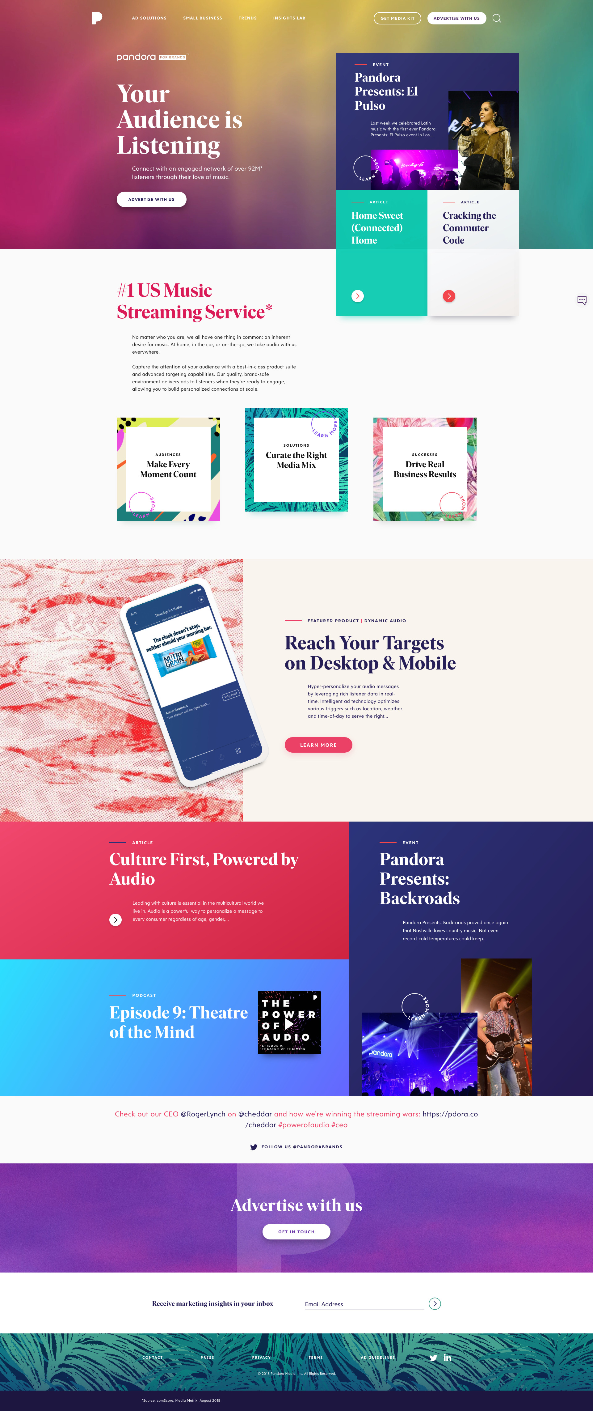 Capture the attention of your audience with a best-in-class product suite and advanced targeting capabilities. Our quality, brand-safe environment delivers ads to listeners when they’re ready to engage, allowing you to build personalized connections at scale. —Pandora