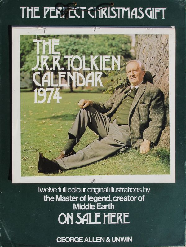 A store advertisement for the J.R.R. Tolkien calendar. Calendar attached to a heavy weight cardboard with fold-out stand on the back and black string for hanging.
