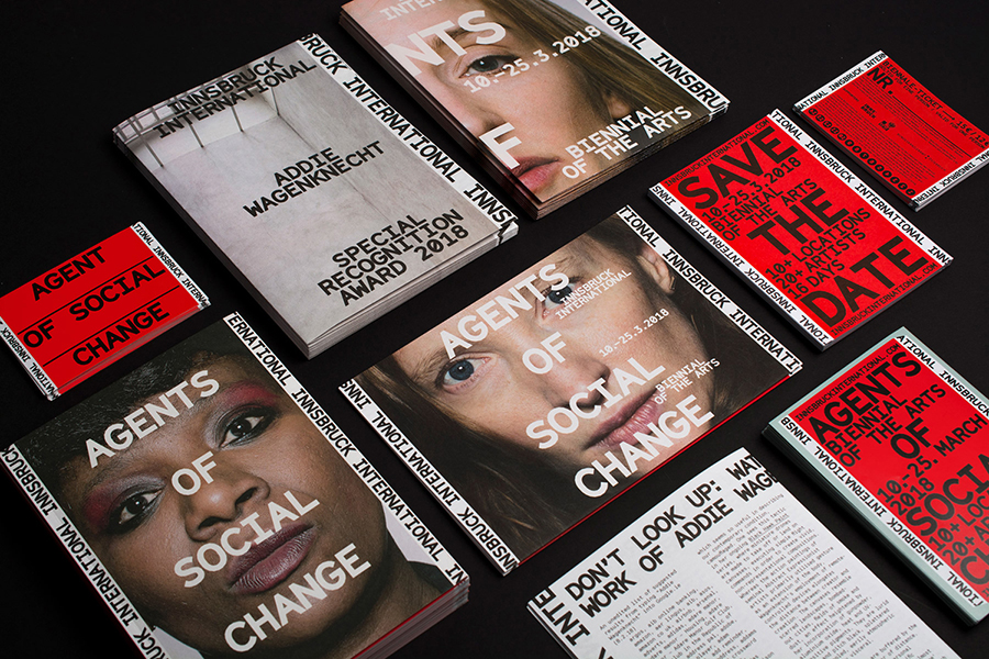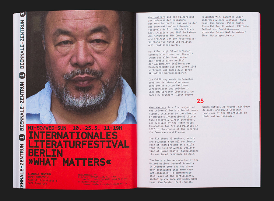 Capturing the spirit of this Italian Studio Mut developed a graphic identity for the 2018 Biennial that included posters, advertising, programmes, brochures and website. This is marked by a visual language of both the personable and mechanical, motion and pause, yet, united by an immediacy and urgency. These qualities are achieved in the intersection of Grilli Type’s Cinetype (in different weights, including a beefed up Mono), portraiture and a bright red ink.