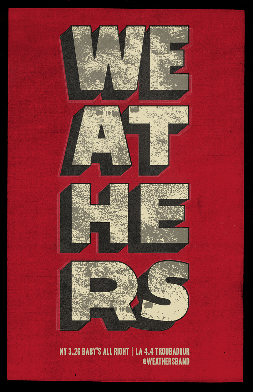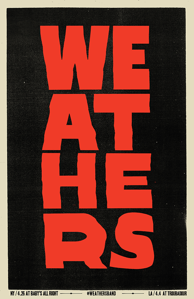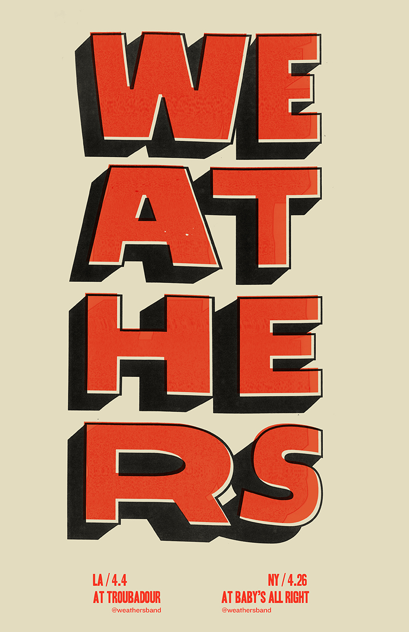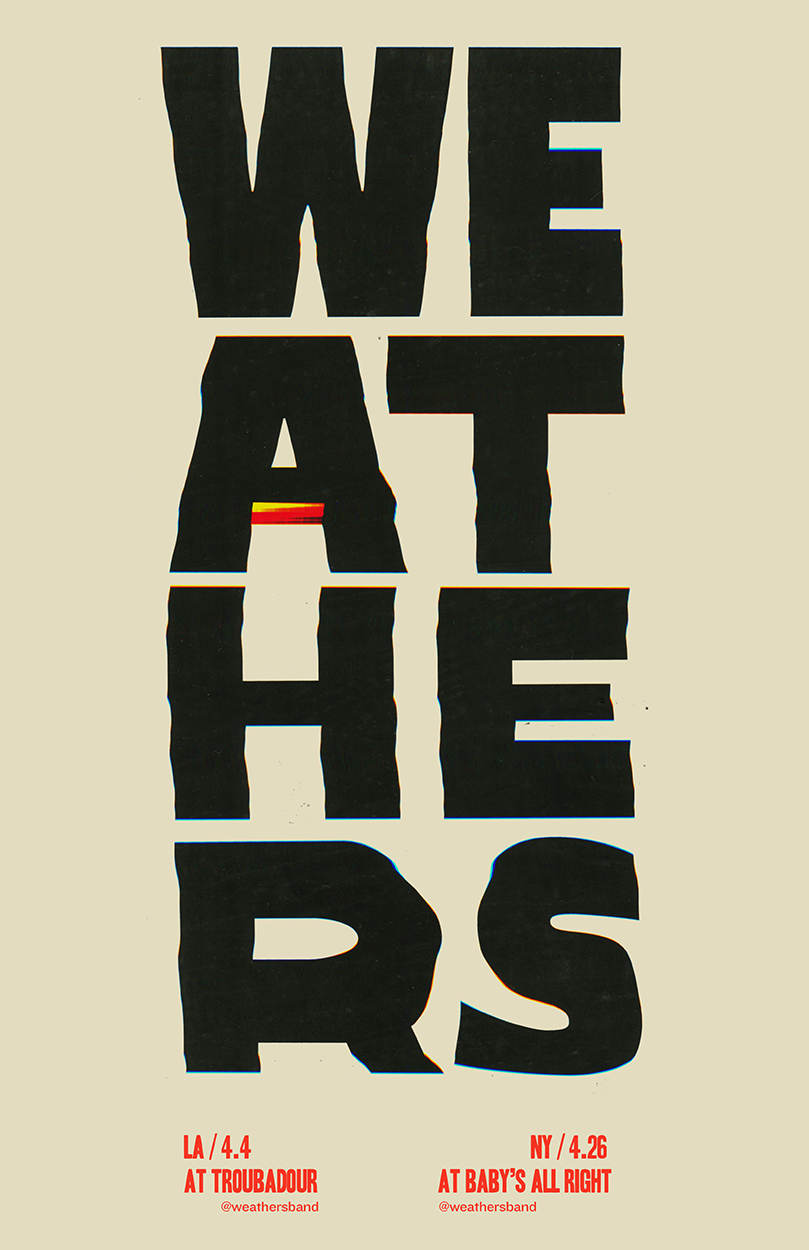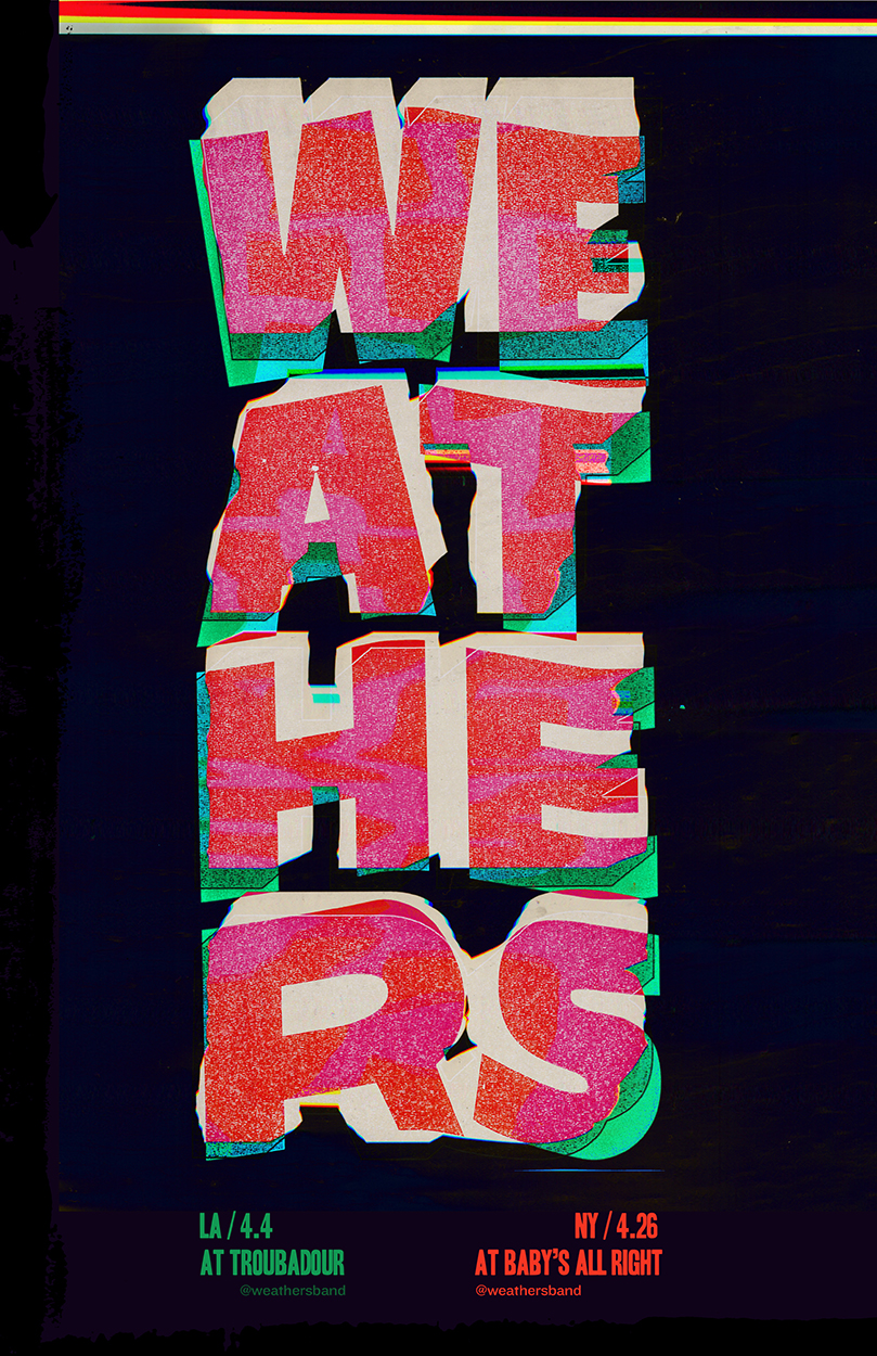 Weathers gig posters Contributed by Annie Stoll on Jan 4th, 2019. Artwork published in circa 2018. Photo: Annie Stoll. License: All Rights Reserved. A poster series for LA rock band Weathers on the occasion of their first gigs at RCA Communication Arts Typography Annual 2019. Designed/directed by Annie Stoll, made with Xerox, sweat and gunk from the street. 11×17″, silkscreen. Photo: Annie Stoll. License: All Rights Reserved. Photo: Annie Stoll. License: All Rights Reserved. Photo: Annie Stoll. License: All Rights Reserved. License: All Rights Reserved. Typefaces More about MorlGet MorlMore about Toronto GothicGet Toronto Gothic Formats Posters/Flyers (5875) Topics Music (6457) Designers/Agencies Annie Stoll (6) Tagged withWeathers (1)poster series (879)concert & gig posters (525)posters (1446)music (92)screen printed (353)photocopied (15)distortion (368)stretched type (559)modified typeface (1776)chromatic (777)outlined type (1275)red and black (1153)mid-word linebreaks (775) Artwork location United States (10072) New York City (2980) Los Angeles (573) In SetsCOOL (Annie Stoll) (199)Neat (Donovan Reeves) (41)FYM RJ (Anton Goddard) (10)Designs by Women (Fonts In Use Staff) (3712) Post a comment Name Email – will not be published Website Your response Submit Comment More in Music The Birchwood Pops Orchestra – Themes from Star Wars, New York, New York, The Deep & Other Great Movie Hits album art1977unknownContributed by Rob Hudson Jan DeGaetani & Gilbert Kalish – Mussorgsky: Nursery Cycle / Tchaikovsky: Songs album art1985Henrietta CondakContributed by Florian Hardwig Staff Pick 2016 Monkees Tour Book2016John Sellards DesignContributed by John Sellards Sponsor More in Posters/Flyers System Olympia – M3 Opera EP cover and posterc. 2025Emmanuel CrivelliDual RoomContributed by Anna Kovalenko (Kyiv Type Foundry) Escape at Dannemora TV series2018CHIPSTeddy BlanksGreg ZadroznyContributed by Braden Froese Staff Pick “The First Australian Tour of Bob Dylan” poster1966unknownContributed by Bryson Stohr Swiss Confederation Covid-19 information campaign2020unknownContributed by Andreas Kofler More Fonts In Use Abstinence Paris2021AbmoContributed by Production Type Staff Pick Internationale Situationniste1958unknownContributed by jipjam Staff Pick Theater Aan Het Spui 2013–20172013Since TodayContributed by Matthijs Sluiter Staff Pick W magazine #12017Violaine & JérémyContributed by Love Lagerkvist Staff Pick A *New* Program for Graphic Design – David Reinfurt2019Inventory Form & ContentContributed by Forgotten Shapes Staff Pick Le Bulletin des Belles Lettres n°5, “Cuisines Cultes”2024Julienne RichardContributed by Lucas Le Bihan Staff Pick Kazakh New Wave by Gulnara Abikeeva2022Kirill GluschenkoContributed by Kirill Gluschenko Staff Pick Mercè Rodoreda, Mirror of Languages Exhibition Catalogue2009Astrid Stavro StudioContributed by Tânia Raposo Staff Pick
