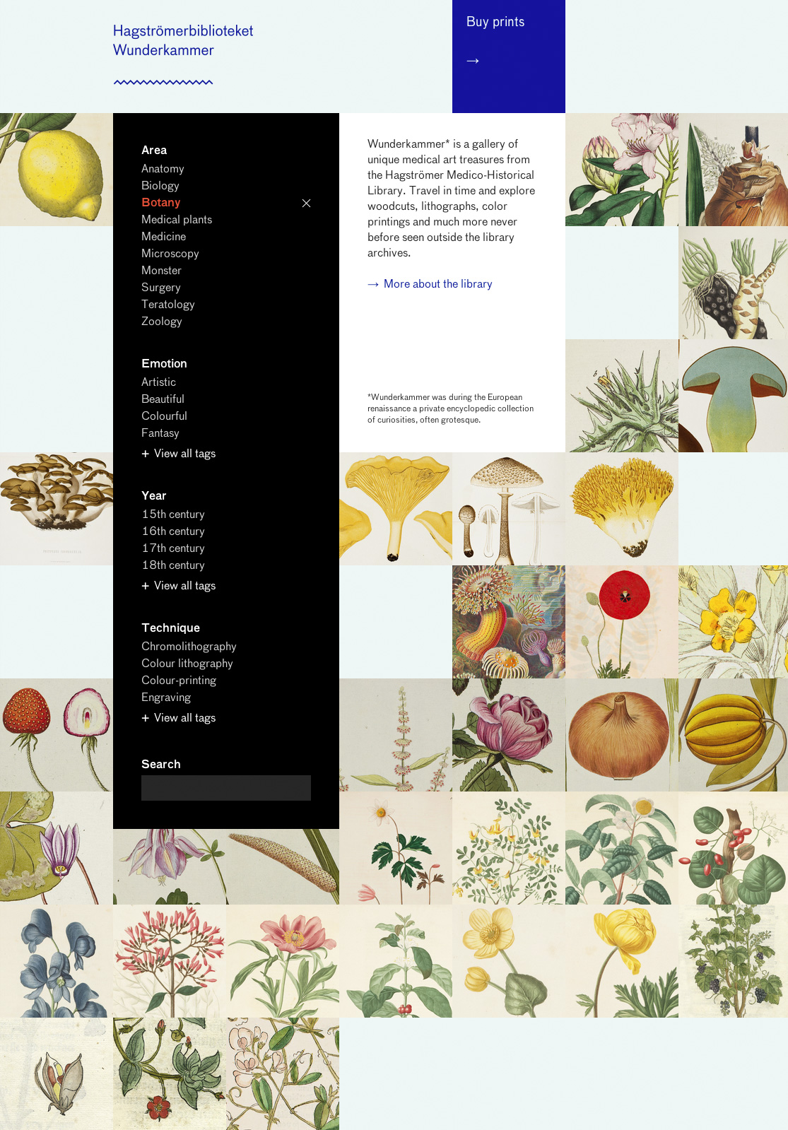 Wunderkammer is a gallery of unique medical art treasures from the Hagströmer Medico-Historical Library. Travel in time and explore woodcuts, lithographs, color printings and much more never before seen outside the library archives.