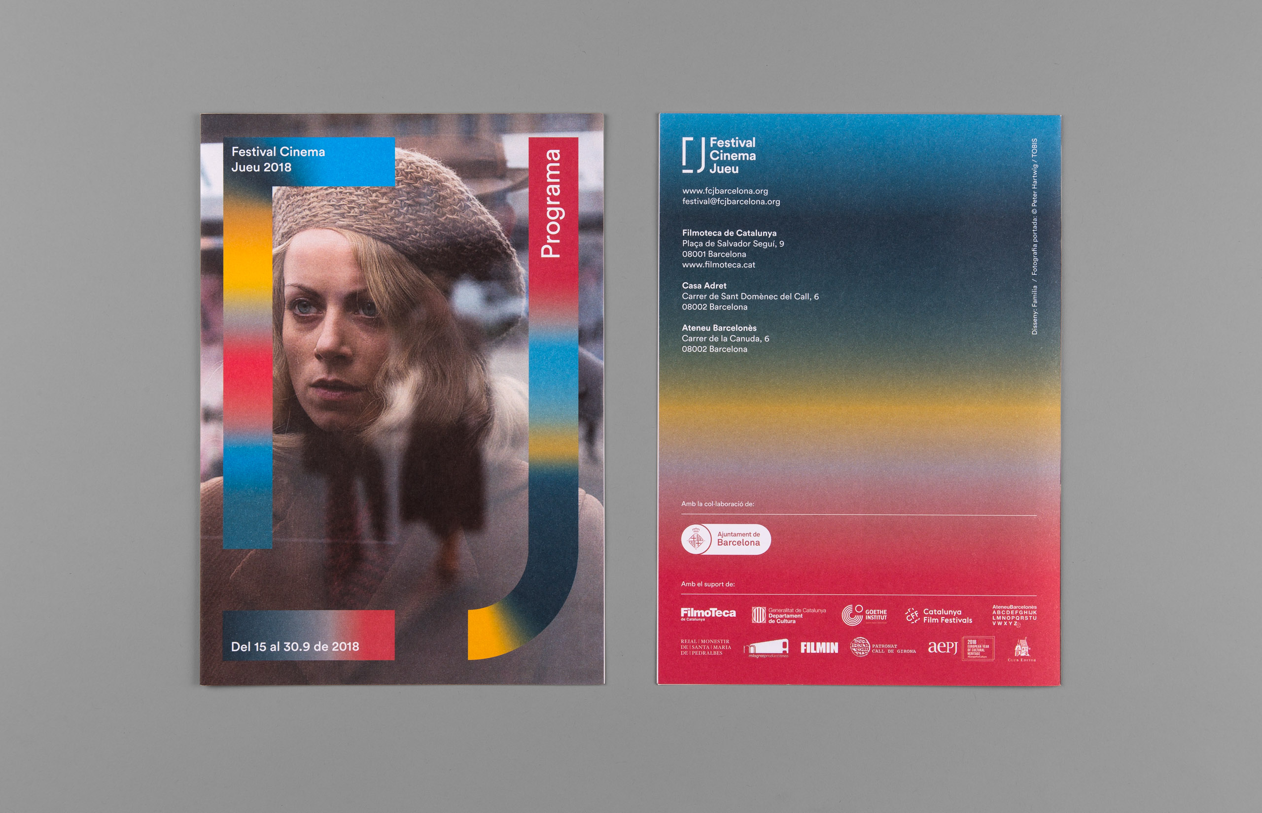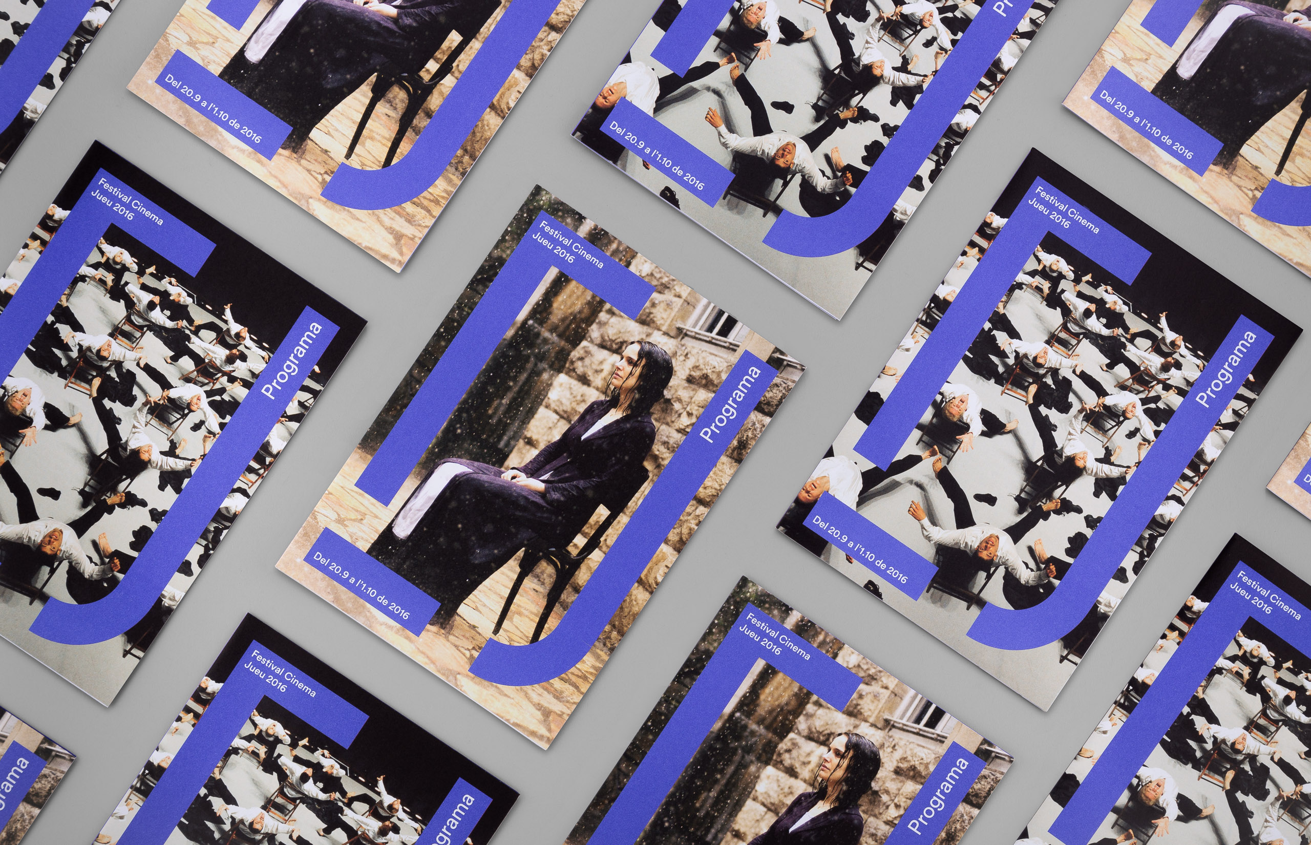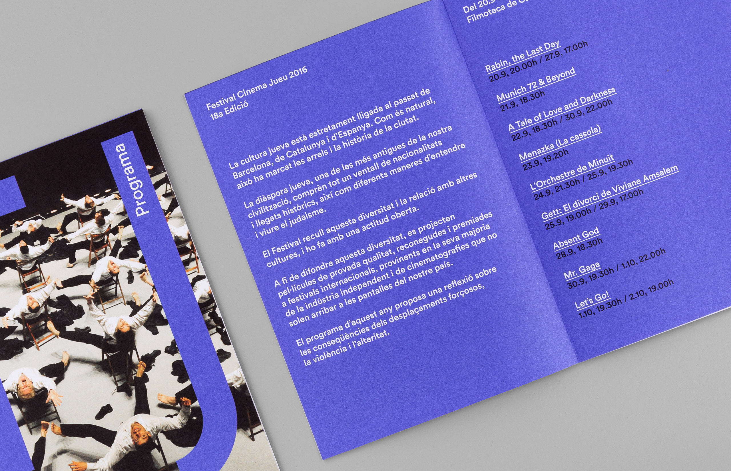 The initials C and J (Jewish Film, or “Cinema Jueu” in Catalan), with its abstract and geometric shapes, are inspired by the Hebrew alphabet and compose the frame of the festival’s films. These two typographic forms become flexible elements that unify all the communication pieces within the graphic space.