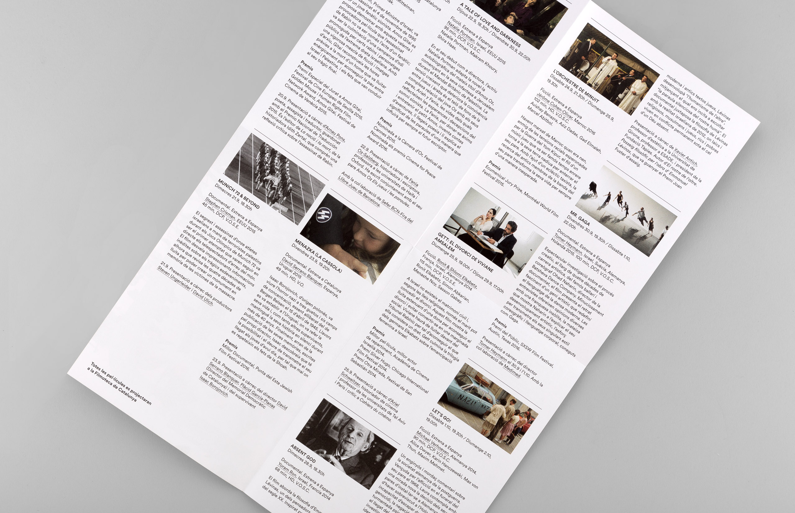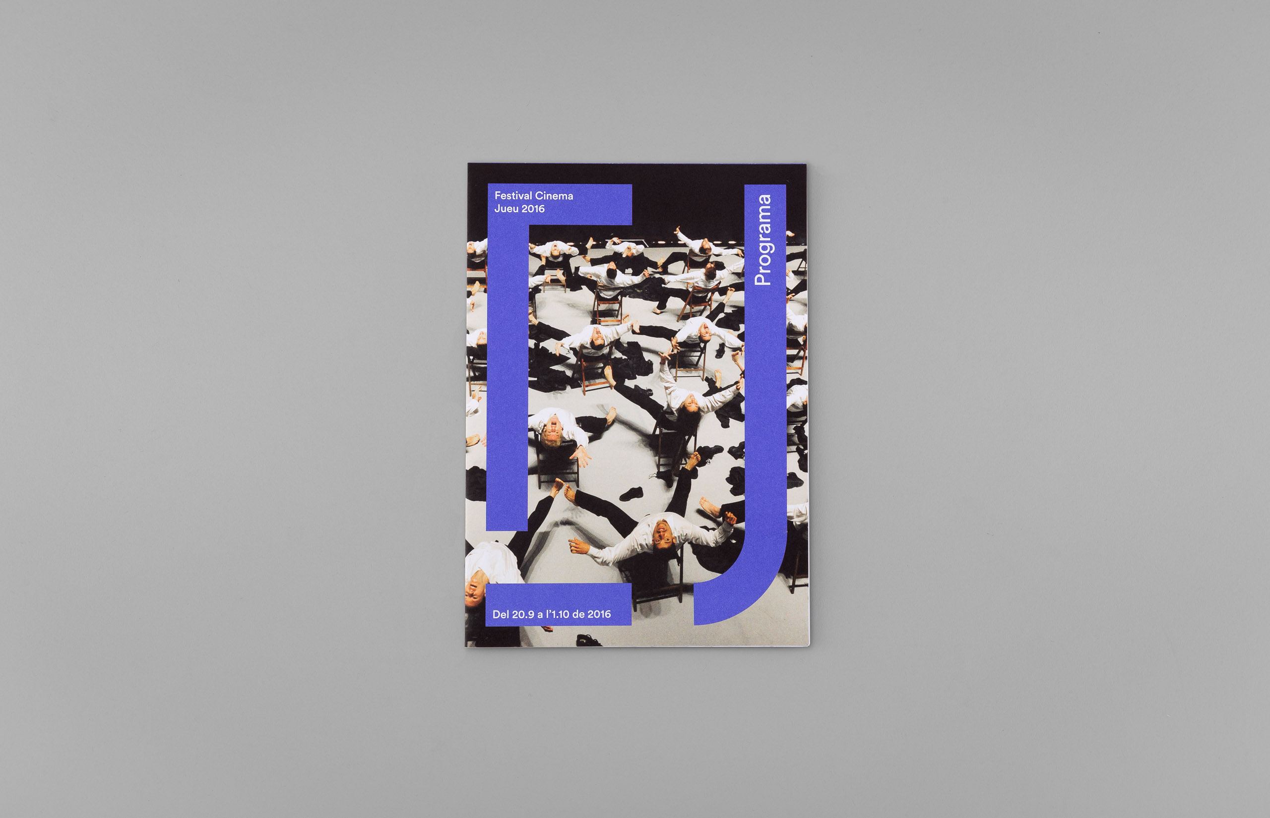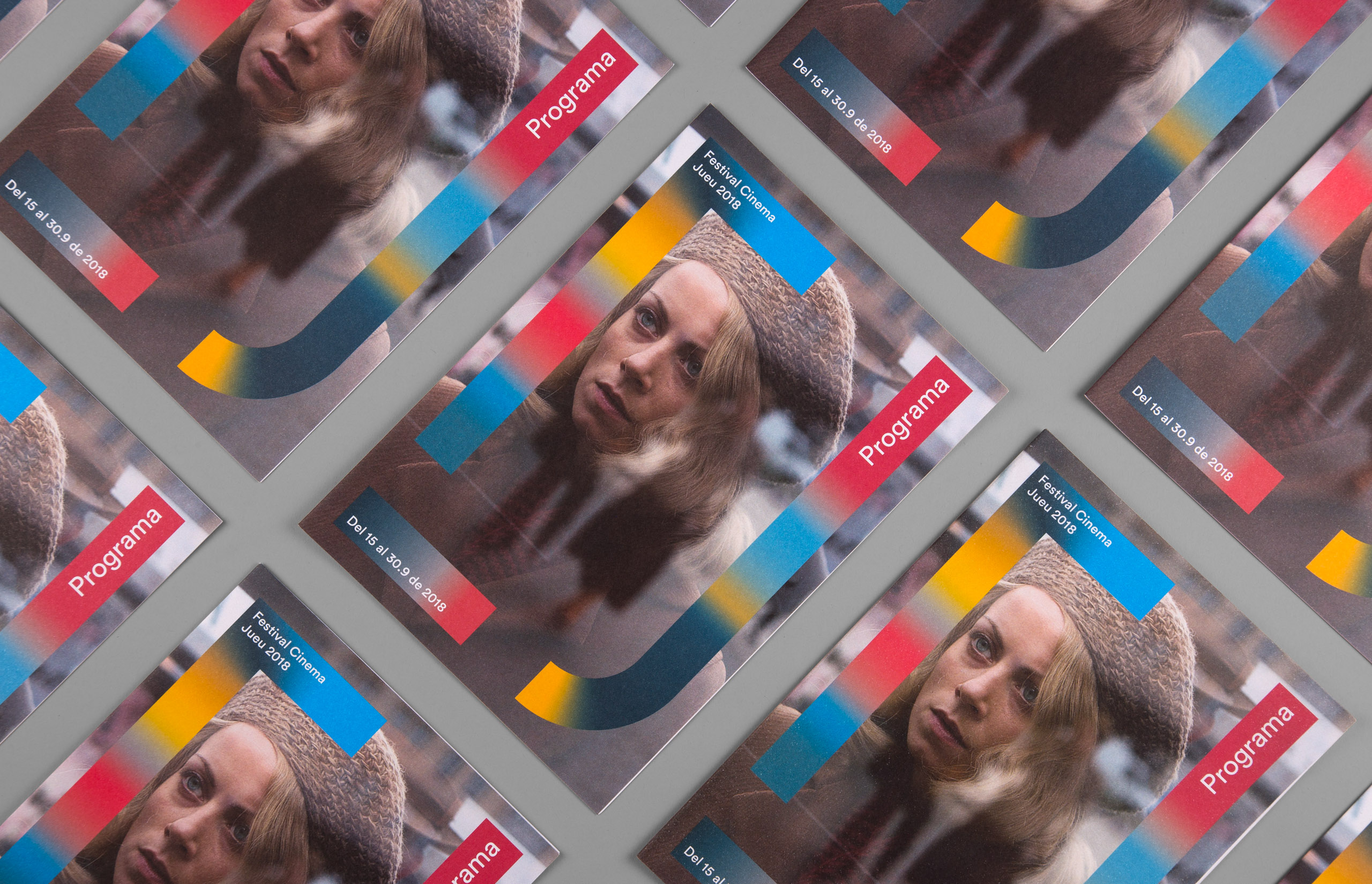 The initials C and J (Jewish Film, or “Cinema Jueu” in Catalan), with its abstract and geometric shapes, are inspired by the Hebrew alphabet and compose the frame of the festival’s films. These two typographic forms become flexible elements that unify all the communication pieces within the graphic space.