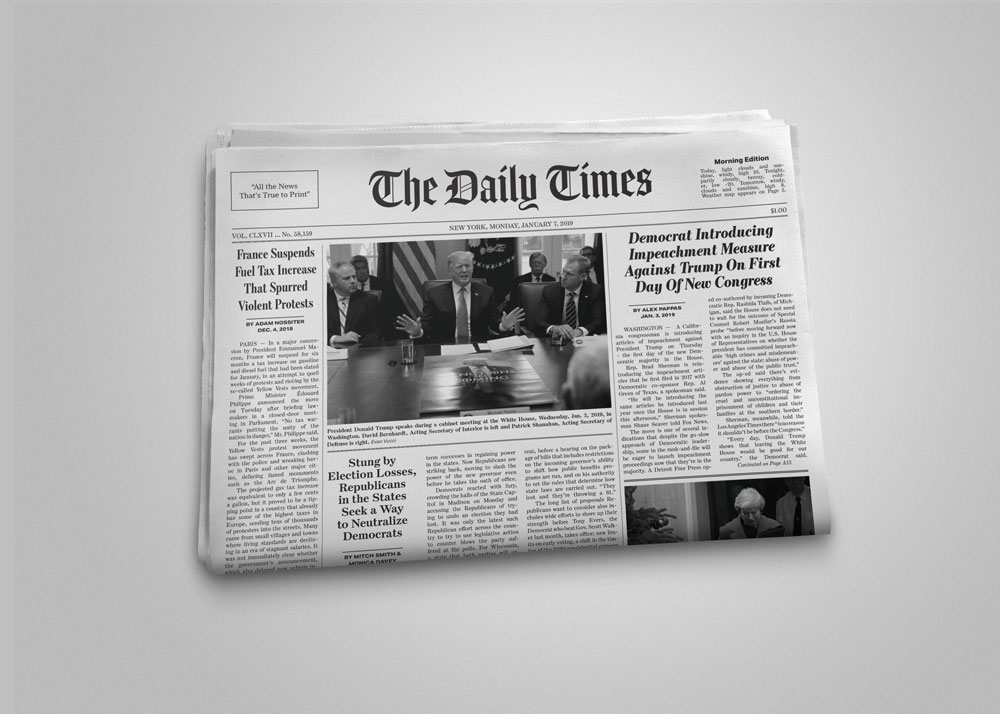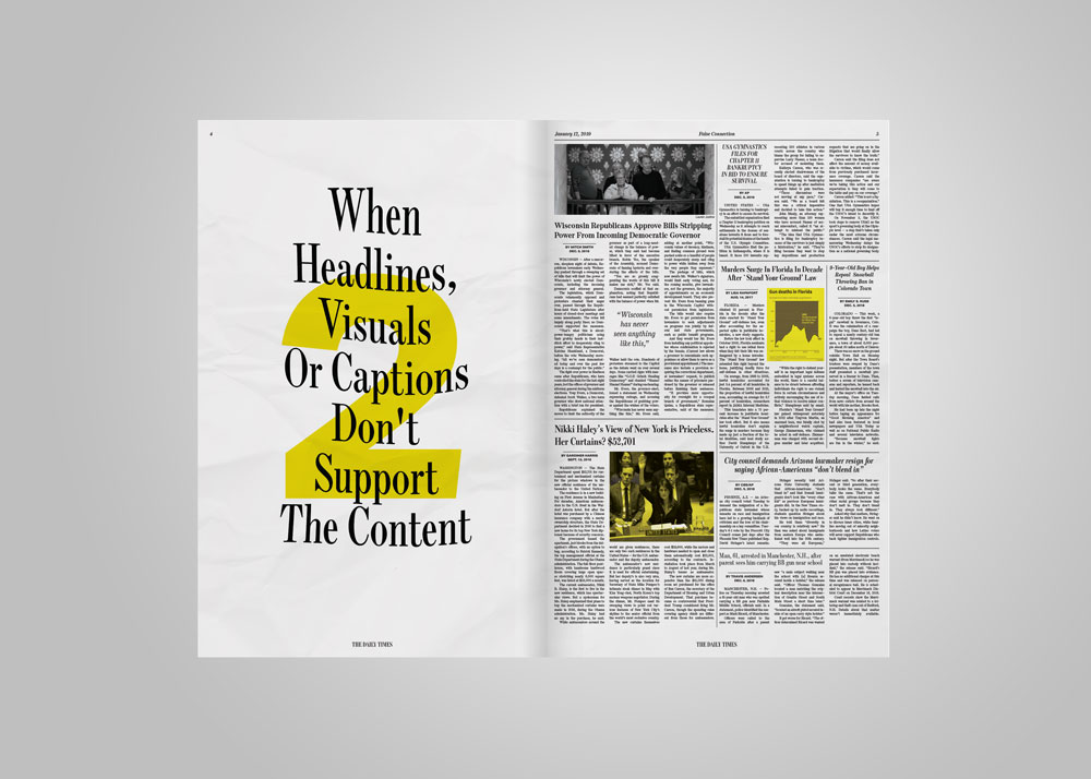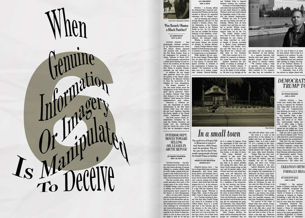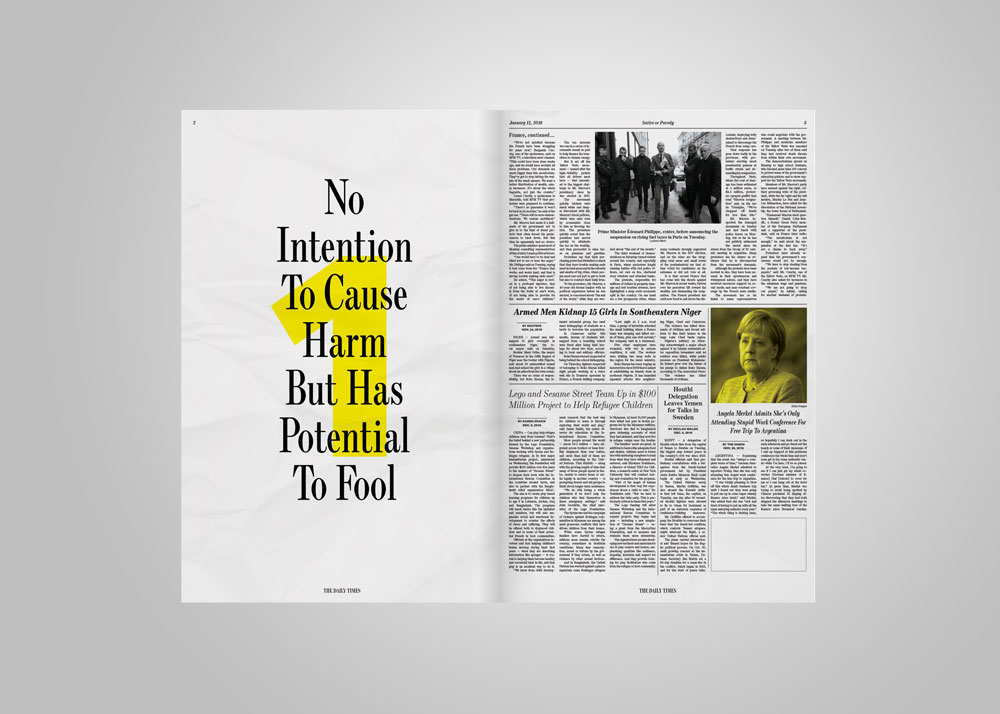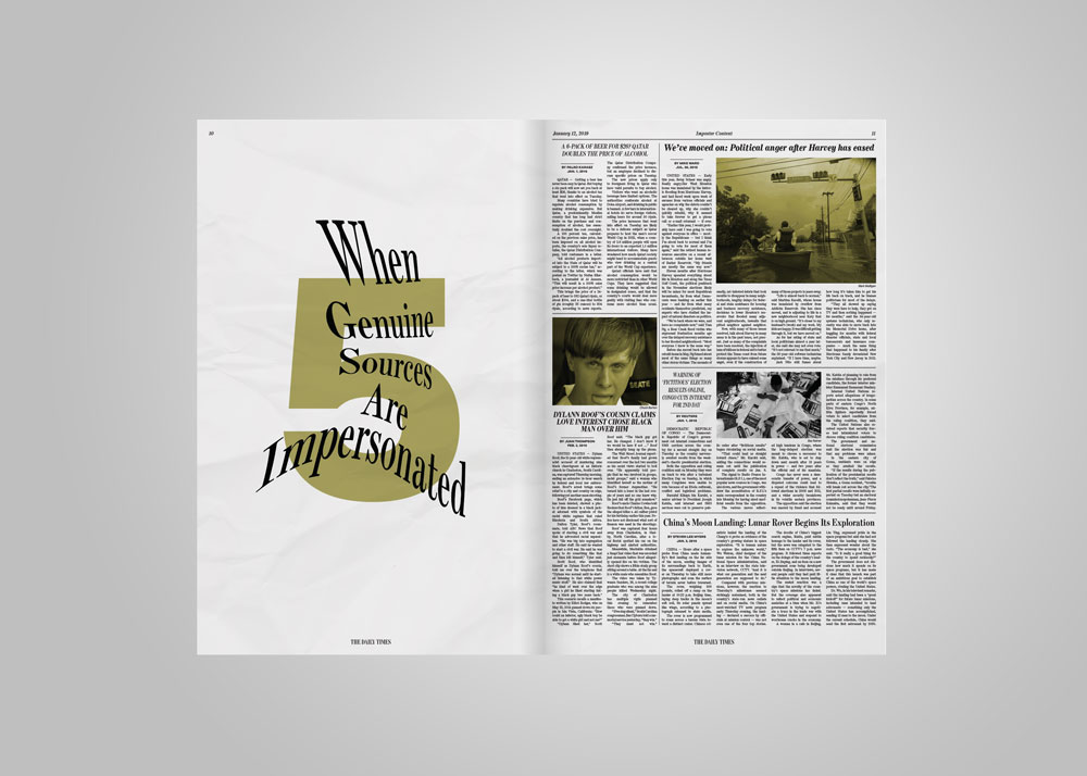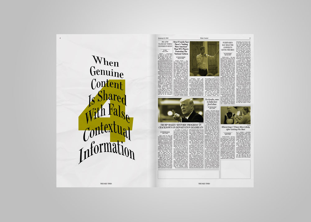 The Daily Times is a study of the buzzword fake news. The newspaper showcases real and fake news stories across the political spectrum over the past 10 years. With the 7 Different Types Of Mis And Disinformation defined by Claire Wardle at First Draft as a lens to view these articles, The Daily Times is a commentary on how we can often be blind to when fake news bleeds into our media diet.