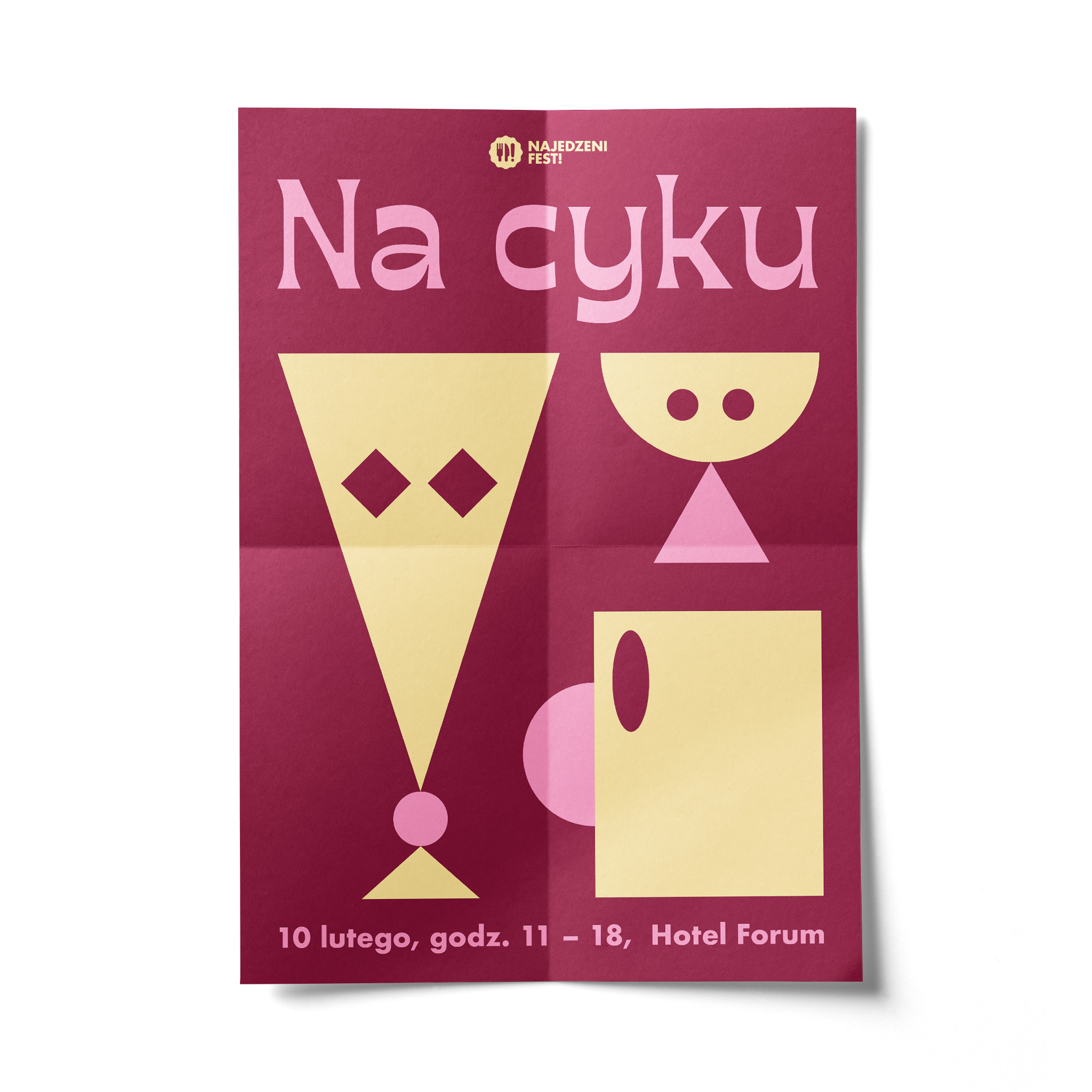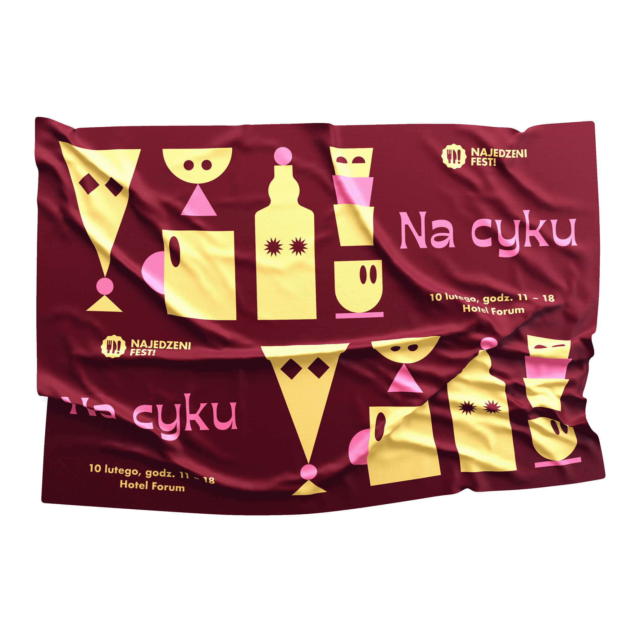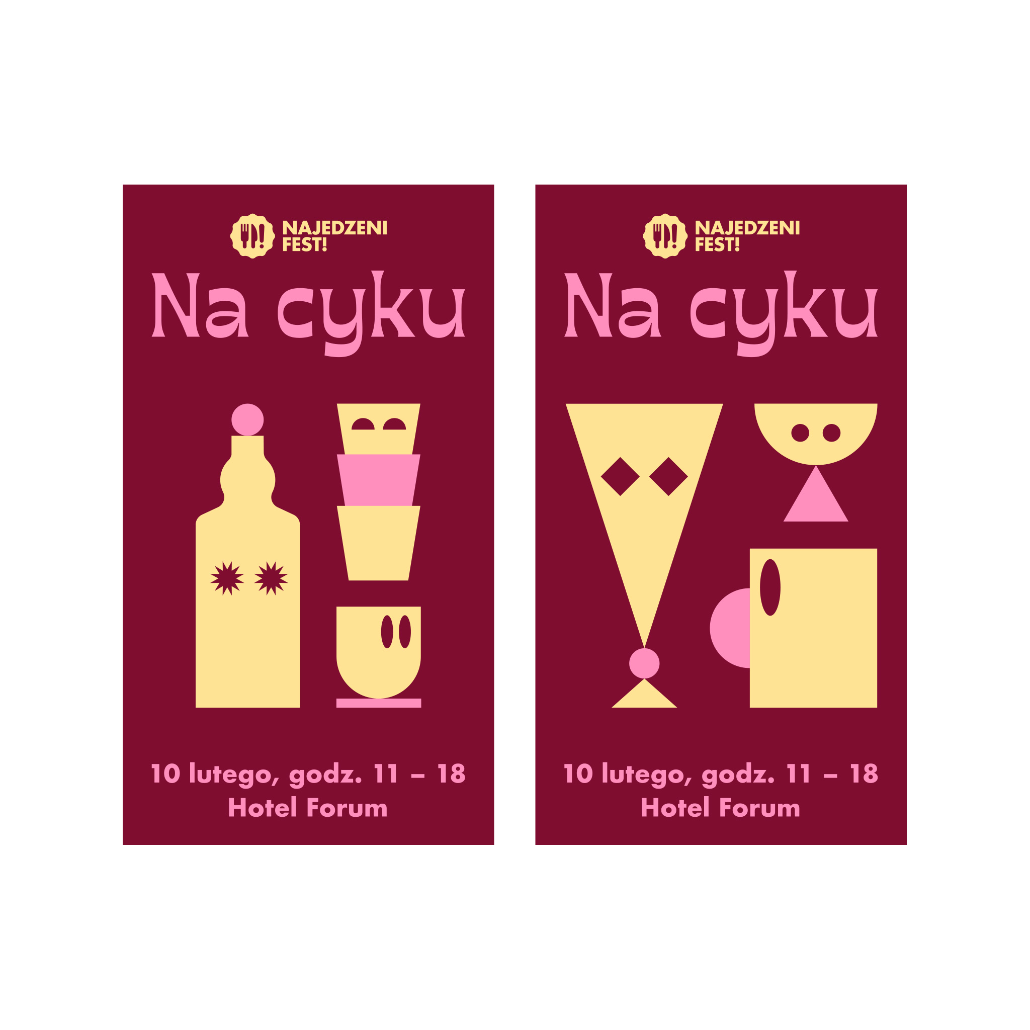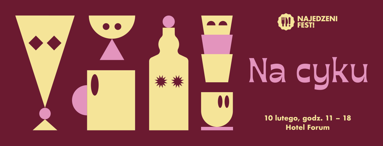 Visual identity designed by Jacek Rudzki (Znajomy Grafik) for this year’s first edition of the Najedzeni Fest, a food festival in Kraków, Poland. In 2019, the festival will focus on beverages. The motto Na cyku means “to be under influence”.