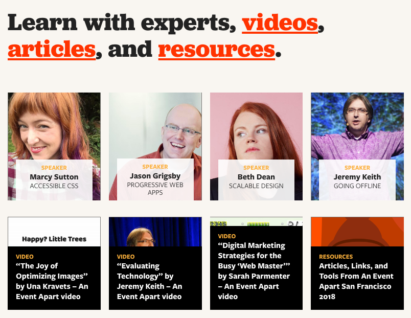 Two typefaces by Joshua Darden are paired for the identity of An Event Apart. Headings are in Jubilat Bold. Smaller text is rendered in several styles from Freight, using the Freight Sans subfamily in contrast to the serif family Jubilat.