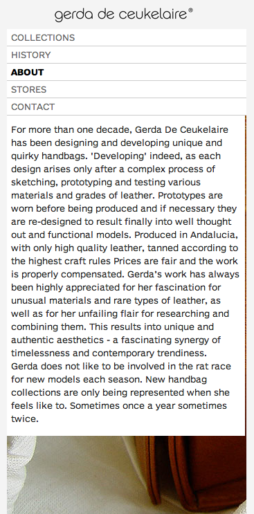 Gerda De Ceukelaire website Contributed by Webtype on Nov 25th, 2012. Artwork published in 2011. License: All Rights Reserved. The website of Belgian bag designer Gerda de Beukelaire is a great example for a clear, responsive design. It uses Benton Sans RE in just two styles, which contribute to the simple, sophisticated athmosphere of the site. License: All Rights Reserved. License: All Rights Reserved. License: All Rights Reserved. Source: www.gerda.be License: All Rights Reserved. Typefaces More about Benton Sans REGet Benton Sans RE Formats Web (5722) Topics Fashion/Apparel (1581) Retail/Shopping (1132) Tagged withbags (115)luggage (6)webfonts (449)Webtype (73)responsive (166)RWD (11)stores (68) In SetsWebtype (Webtype) (241)Sans Serif (obr yoon) (203) Post a comment Name Email – will not be published Website Your response Submit Comment More Benton Sans RE in use Shared Voices2012RISD MediaSkolos/WedellMicah BarretContributed by Indra Kupferschmid Staff Pick Realosophy website2011Elsted CommunicationContributed by Webtype Staff Pick Type@Cooper2011Nick ShermanContributed by Webtype Sponsor More in Fashion/Apparel “Let the Beat Drop” Shirt2013Brandon RikeContributed by Stephen Coles De factoc. 2019Chase HostlerContributed by Florian Hardwig Staff Pick schöne Handlung, Regensburgc. 2025Miriam KönigContributed by Miriam König Watson Morgan2017Vencho MiloshevskiContributed by Matthijs Sluiter More in Web Philip Stemann portfolio website2021Known As StudioContributed by KNOWN AS STUDIO Ceramicah2022Present StudioContributed by Present Studio Staff Pick Institute for Industrial Productivity Website2012MSDSContributed by Webtype Arctic Paper, Surface N° 22021JUNOContributed by Juno Hamburg More Fonts In Use Stay Connected: Navigating the Cloud at Tai Kwun Contemporary2025Studio Pianpian He and Max HarveyXuechun WangContributed by Xiaoyuan Gao Staff Pick Gesellschaft und Wirtschaft1930IsotypeOtto NeurathMarie ReidemeisterContributed by Stéphane Darricau Staff Pick “Oh, Softscapes” flyer2019Lauren Traugott-CampbellContributed by Lauren Traugott-Campbell Staff Pick Paustian website2016e-TypesContributed by Stephen Coles Staff Pick