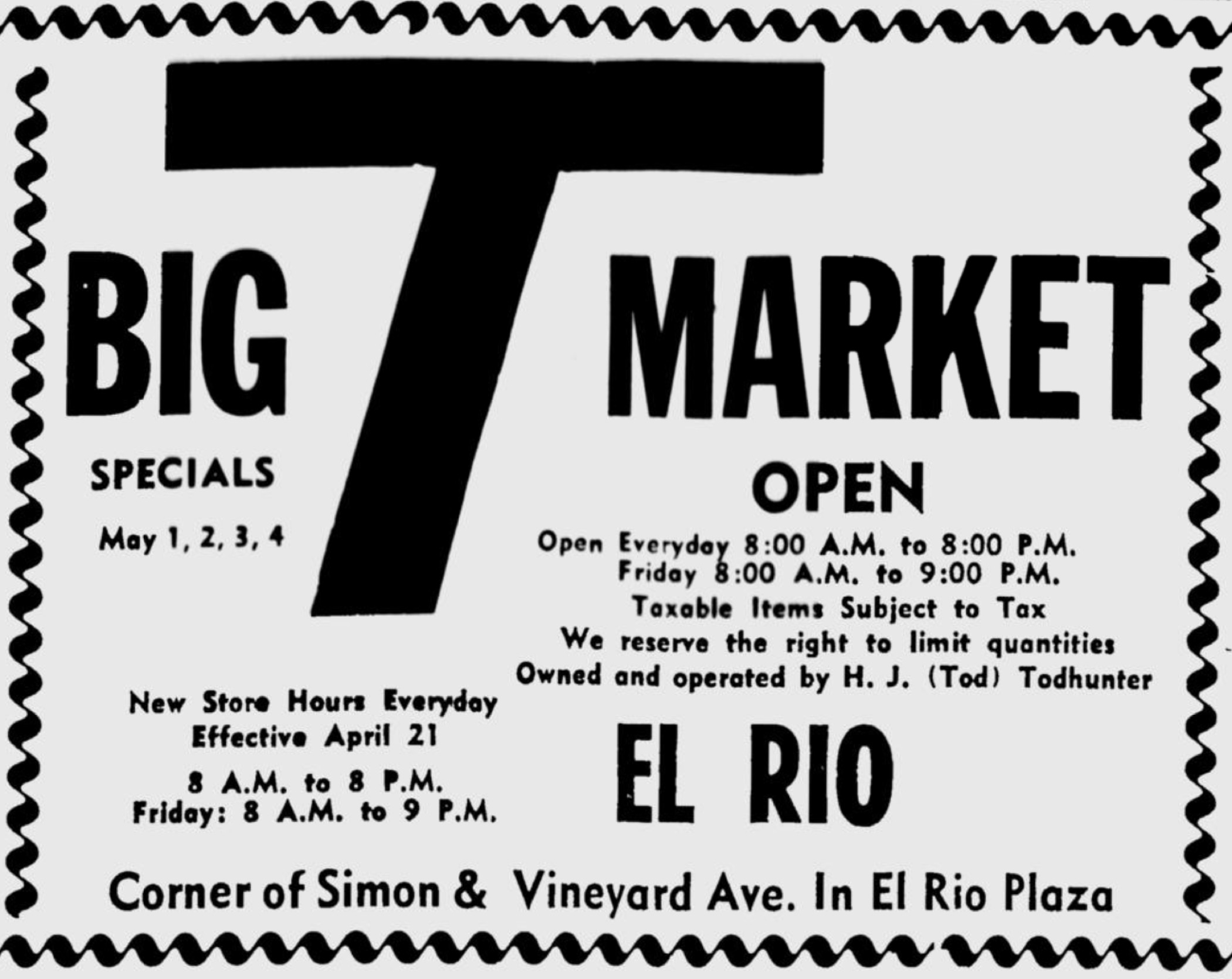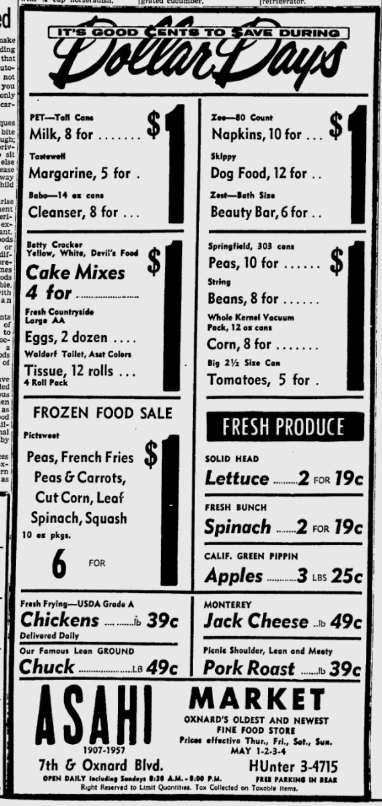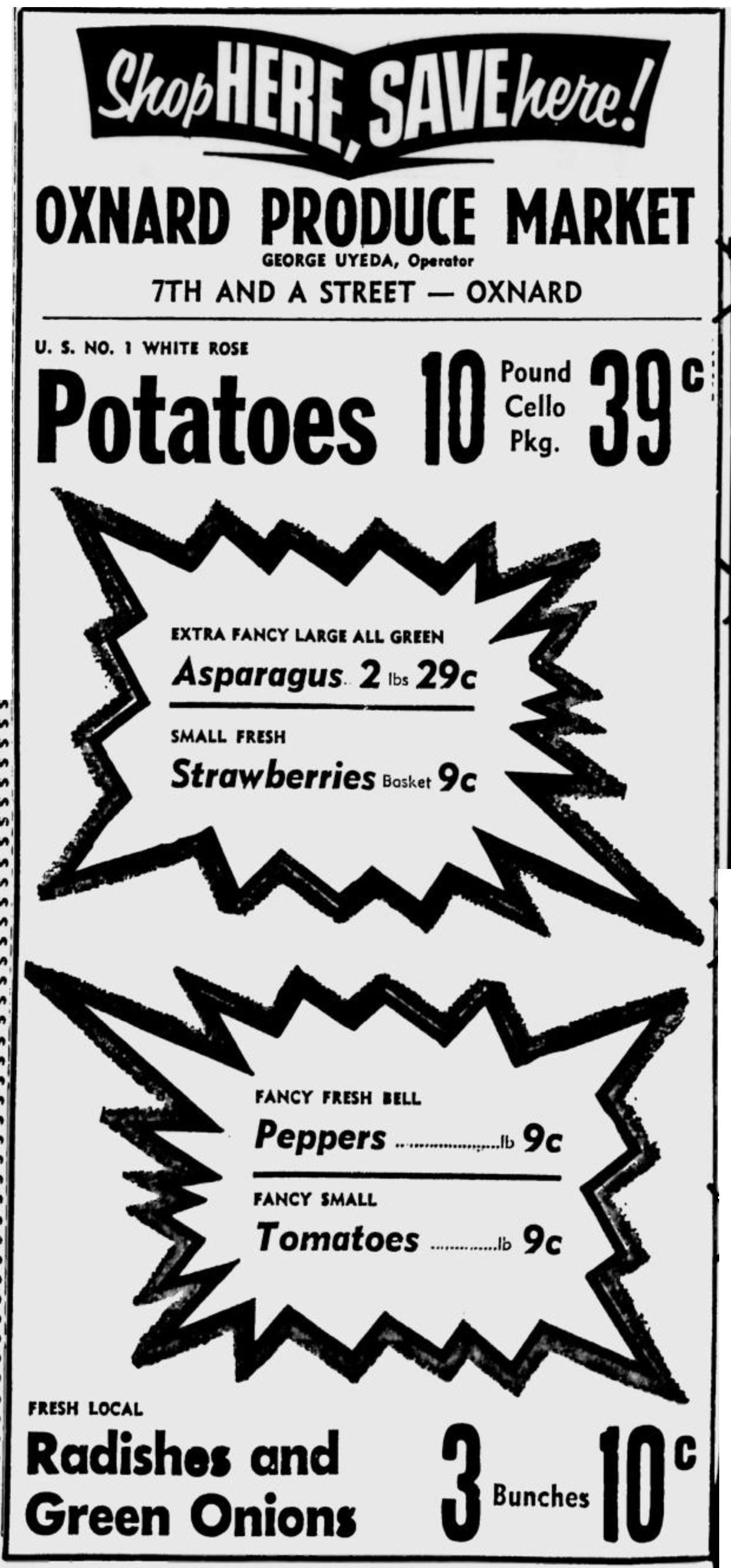 I salute the anonymous typesetter(s) at work here. They employ a variety of low-fi methods for grabbing attention and organizing information. Note the liberal use of rules and squiggly borders, the giant ‘1’ for Big T and Asahi Markets, the huge size contrast between numbers and units (lbs, cans, bunches), and the bursts for the Oxnard Produce Market.
