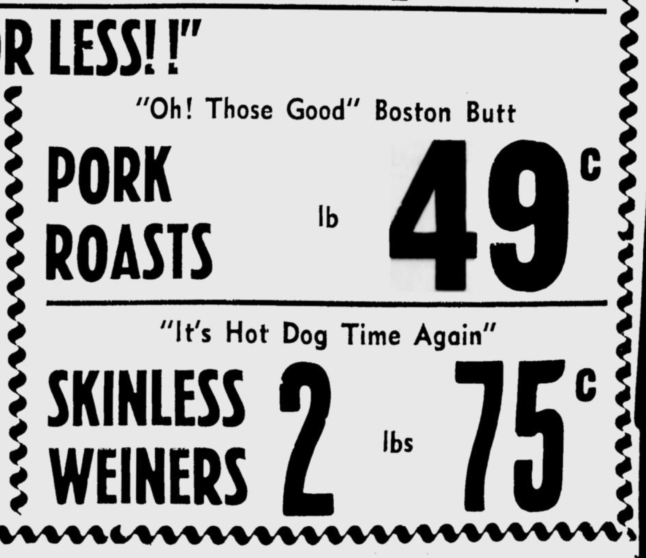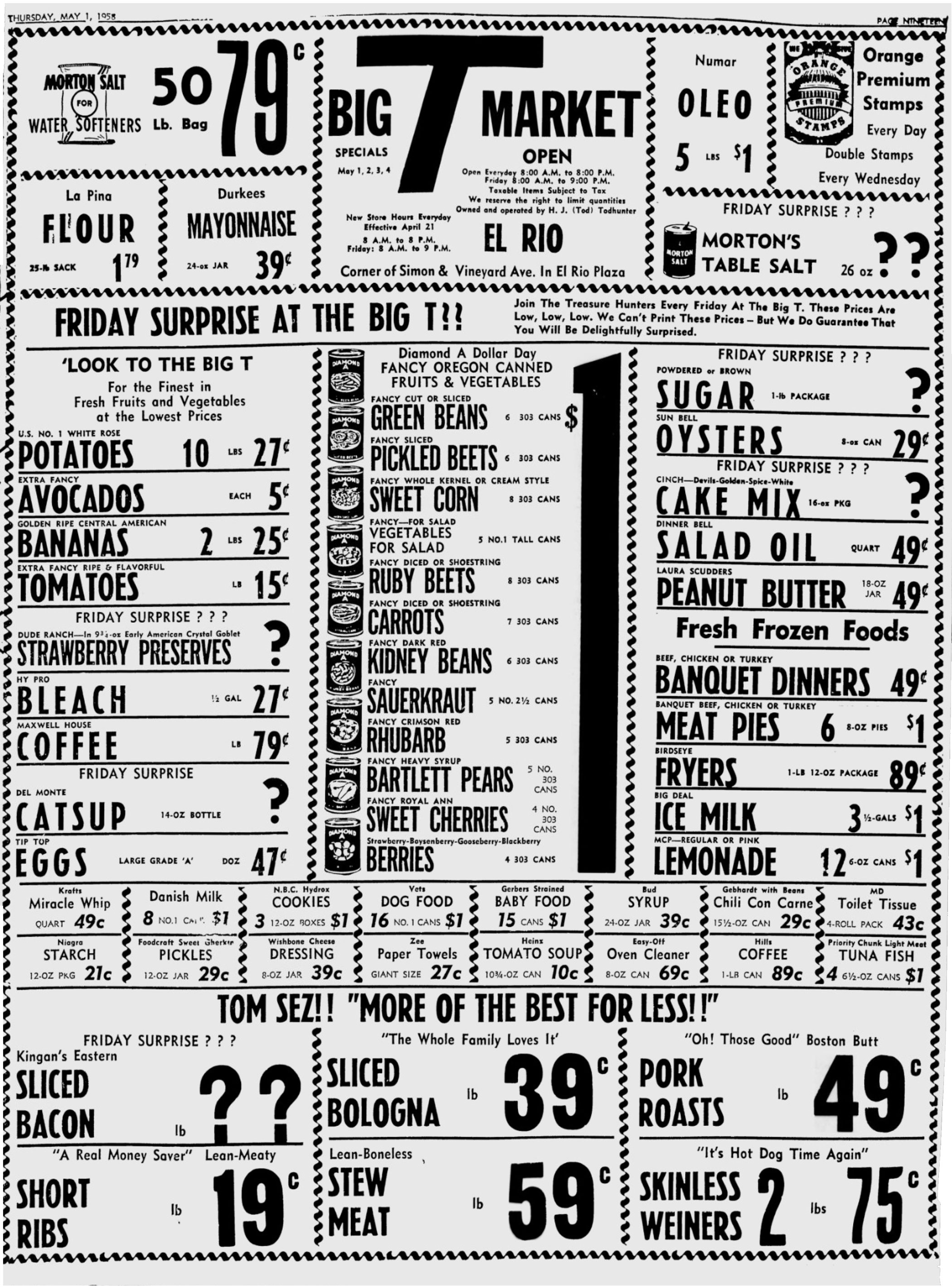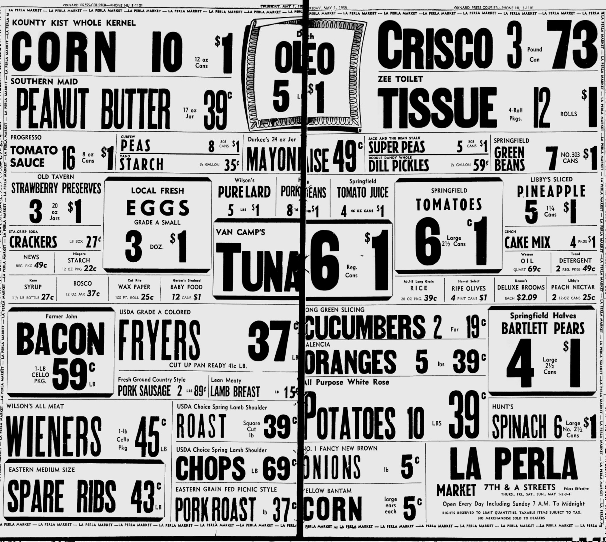 The May 1, 1958 issue of the Oxnard Press-Courier includes these ads for four supermarkets in Ventura County, California. The ads use many of the same fonts, suggesting they were produced at the same printer, probably the newspaper itself. This was common practice in the pre-digital era, especially for small businesses in small towns.