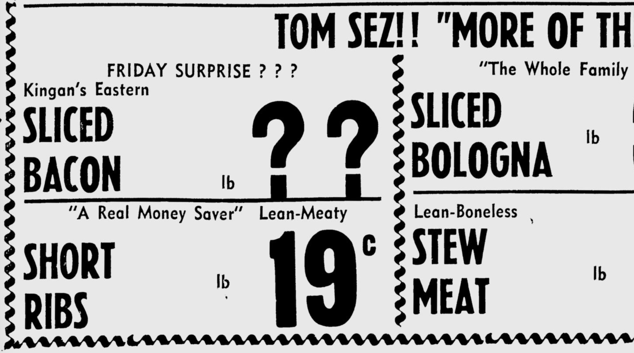 Some of the typefaces used throughout the newspaper (and these ads) are Franklin Gothic Condensed, Metro No. 2, and Erbar-Grotesk Bold Condensed. Tempo, a very common choice for mid-century American newspapers, appears in the La Perla ad (e.g. “EGGS”). The largest type, used for many of the figures, is likely wood type and difficult to identify. Hamilton’s Plain Gothic No. 6243 appears to be one of them.