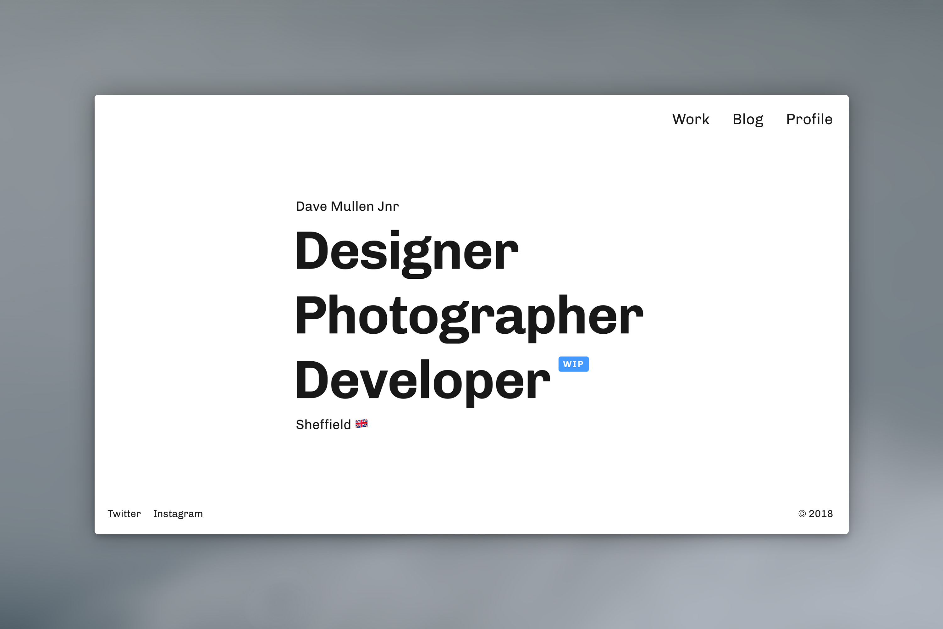 Dave Mullen Jnr portfolio website Contributed by Dave Mullen on Feb 12th, 2019. Artwork published in circa November 2018. Source: davemullenjnr.co.uk License: All Rights Reserved. I’m a designer living in Sheffield. For my portfolio website, I’ve used Chivo (Omnibus-Type, 2011) for the landing page and for headlines. Chivo is paired with Graphik (Commercial Type, 2009) for text. Source: davemullenjnr.co.uk License: All Rights Reserved. Detail: Chivo for headline, Graphik for text. Typefaces More about ChivoGet ChivoMore about GraphikGet Graphik Formats Web (5721) Topics Graphic Design (3046) Designers/Agencies Dave Mullen Jnr (4) Tagged withportfolios (781)personal websites (264)contrasting sizes (681)typeface combinations (4033) Artwork location United Kingdom (3339) Sheffield (26) In SetsSans serif (Graphic Feed) (14) Post a comment Name Email – will not be published Website Your response Submit Comment More Chivo in use Stan’s Grill2023Social FixationContributed by Mirko Bonm Colégio Decisão2015Estúdio ArnoldContributed by Lucas Pinto All in Space2023Bureau BarbaraContributed by Laure-Anaïs Michelot Sponsor More in Graphic Design Type Directors Club website2013Nick ShermanJessica HischeContributed by Indra Kupferschmid Pact website2022PactContributed by Jan Maack Gridset2012Mark Boulton DesignContributed by Stephen Coles Modern Typography. An Essay in Critical History by Robin Kinross2004Françoise BerserikContributed by Matthijs Sluiter More in Web Garota Prendadac. 2011Mauro VenturaContributed by Stephen Coles New York Review of Architecturec. 2023Seth ThompsonA Lot of Moving PartsLaura CoombsContributed by Peiran Tan Belvedere Agency identity & website2021Antton UgarteClara Briones VediaContributed by Antton Ugarte Neupitzc. 2024Lisa MehleContributed by Andrej Sevcik More Fonts In Use Quarter Gin identity and websitec. 2021Duzi StudioContributed by Jamie Otelsberg (OH no Type Co.) Staff Pick RN13BIS Art contemporain en Normandie2021PiloteContributed by Pilote Paris Staff Pick Future Shock by Alvin Toffler, Random House edition (and subsequent uses)1970S. Neil FujitaContributed by Michael Bilsborough Staff Pick Fragments d’une famille ordinaire poster and flyer2025Jules TirillyContributed by Jules Tirilly Staff Pick