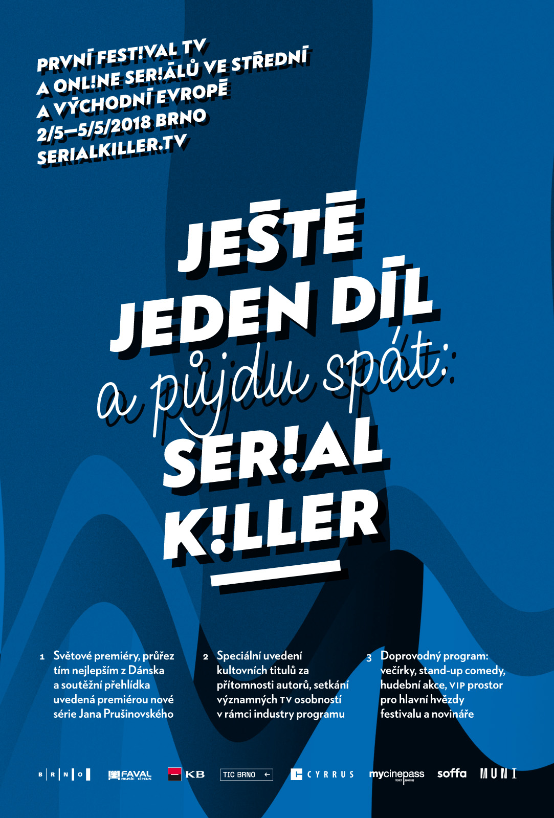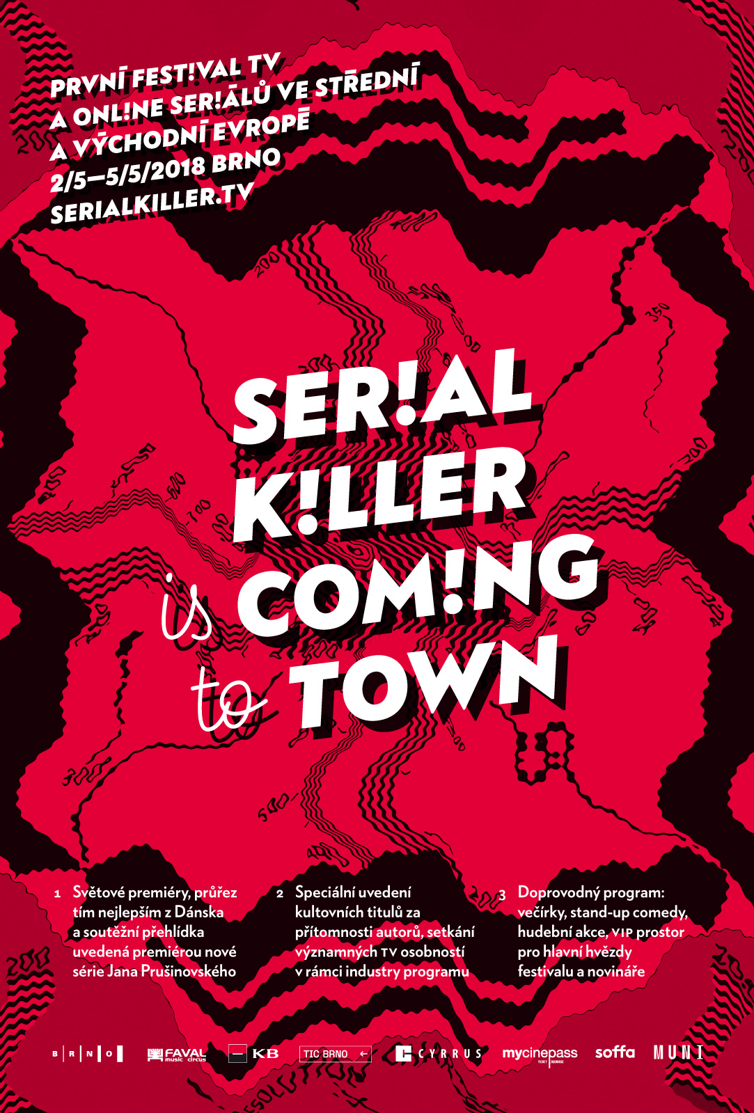 Serial Killer is the first festival for TV / online series taking place in Brno, Czech Republic. Its visual style, designed by Martin Pecina, was strongly inspired by horror and monster movies of the 1940s and 1950s as well as some ‘film noir’ titles of the same era. That was the reason why TV monoscopes and distortions are accompanied with heavy negative type in diagonal composition, drop shadows and bold underlines.