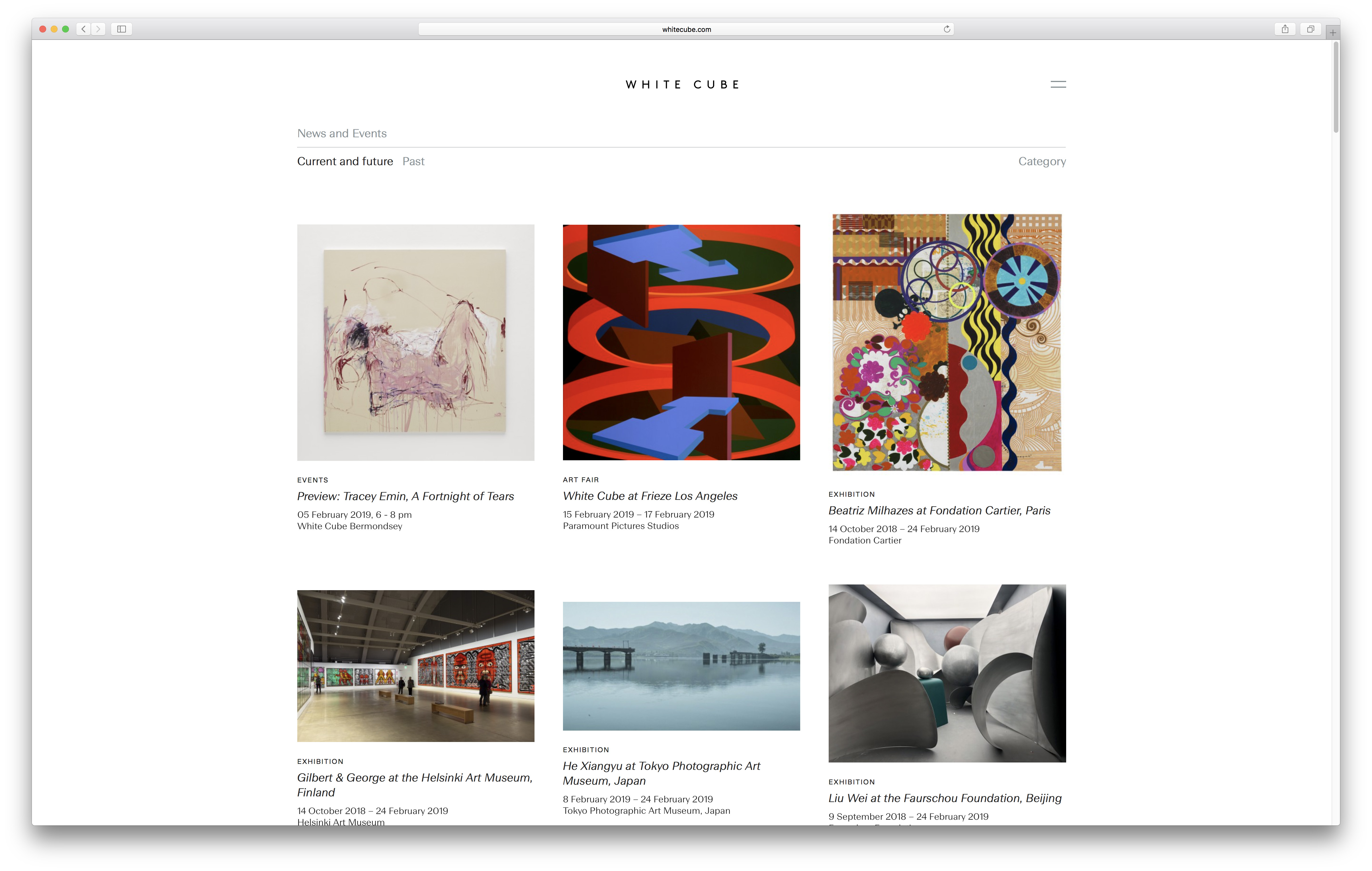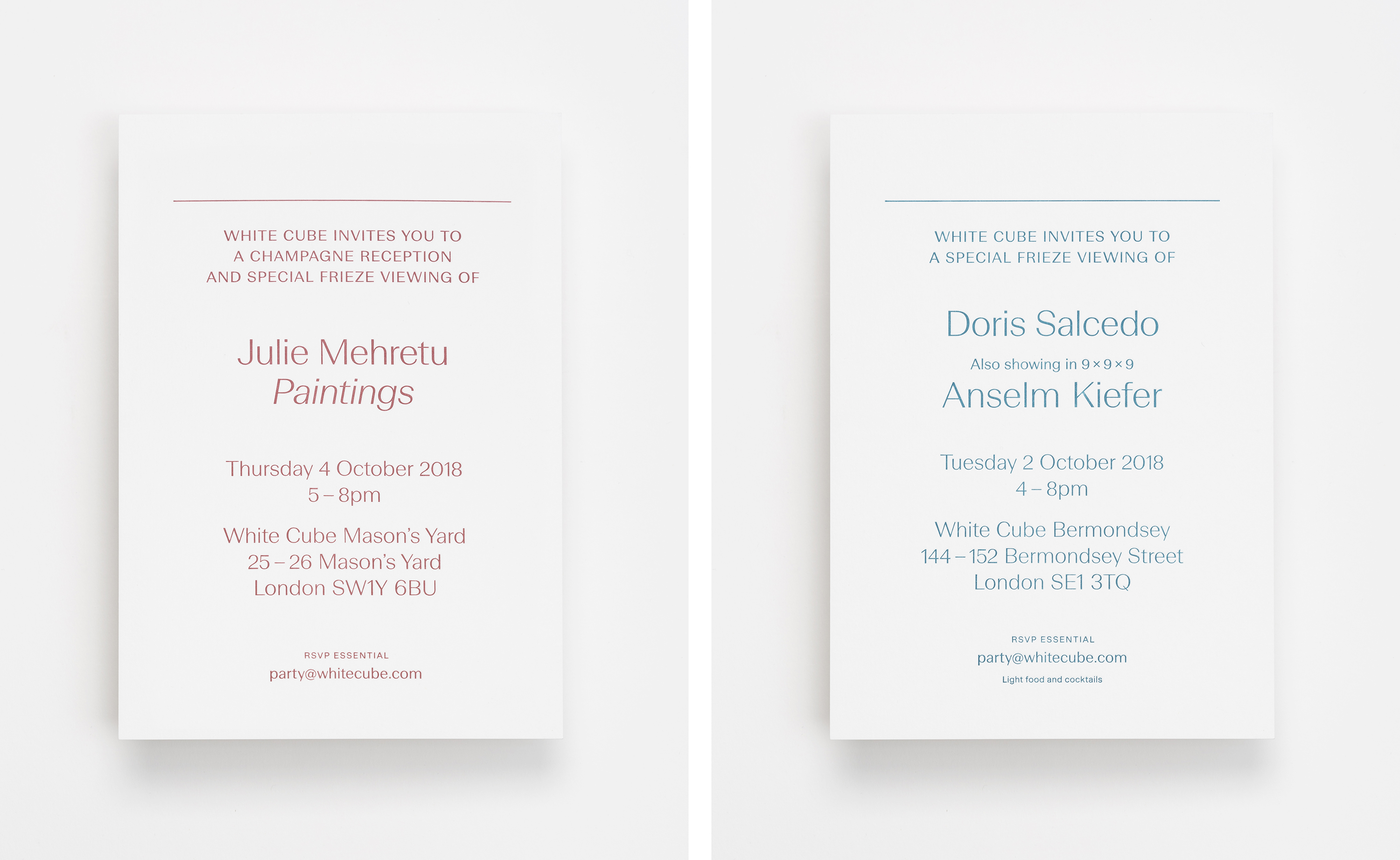For White Cube, the gallery home to contemporary artists such as Gilbert & George, Damien Hirst and Andreas Gursky, a complete new visual identity and rebrand was designed by B.A.M. Everything from invites and signage through to website and marketing communications has been reimagined. The new graphic identity embraces the migration of a print-based to a digital-first identity.