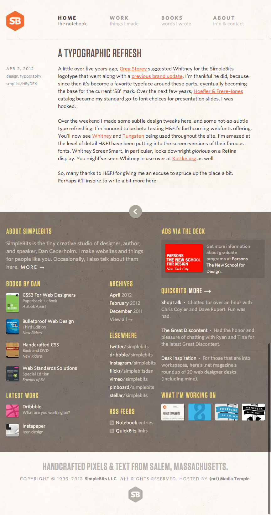 Simple Bits Contributed by Patch Hofweber on Nov 25th, 2012. Artwork published in 2012. Source: simplebits.com ©1999–2012 SimpleBits LLC. License: All Rights Reserved. The craftsman himself, Dan Cederholm did a lovely redesign of his site using H&FJ webfonts. Typefaces More about TungstenGet TungstenMore about WhitneyGet Whitney Formats Web (5513) Topics Graphic Design (2952) Technology (1458) Designers/Agencies Dan Cederholm (1) Tagged withweb design (18)websites (3468)webfonts (449)blogs (120) In Sets Post a comment Name Email – will not be published Website Your response Submit Comment More Tungsten in use Men’s Health (UK): 2012 Weight-Loss Supplement2012Luke LucasContributed by Stephen Coles Festival Dragons et Lanternes2023unknownContributed by Production Type The Power of Creativity poster2012Johnson BanksMichael JohnsonContributed by Nick Sherman Sponsor More in Technology Nintendo Entertainment System consoles and components1985NintendoContributed by Stephen Coles Staff Pick SCRIB3 websitec. 2024SCRIB3Contributed by Bloom Type Staff Pick Avidc. 2018AvidJohn BennettContributed by Darden Studio Zagc. 2013TRÜFContributed by Rodrigo Saiani More in Web Yelle Maillé Architectesc. 2024Emmanuelle CharneauContributed by Giulia Boggio Real Culture2023Frida HaggstromJohanna LundbergContributed by Giulia Boggio UH Fest (2014–)c. 2016Márton BertókContributed by Swiss Typefaces Path2011Dustin MierauContributed by Stephen Coles More Fonts In Use The Bluest Eye by Toni Morrison (Holt, Rinehart and Winston)1970Herb LubalinJay TribichContributed by Florian Hardwig Staff Pick Canção das Iluminuras: Concertos Renascentistas2019Moscou DesignContributed by Moscou Design Staff Pick “Happy New Year 1982” ident, WPIX1981unknownContributed by Florian Hardwig Staff Pick American Psycho titles and business cards2000Marlene McCartyContributed by Sasha Mikhedov Staff Pick