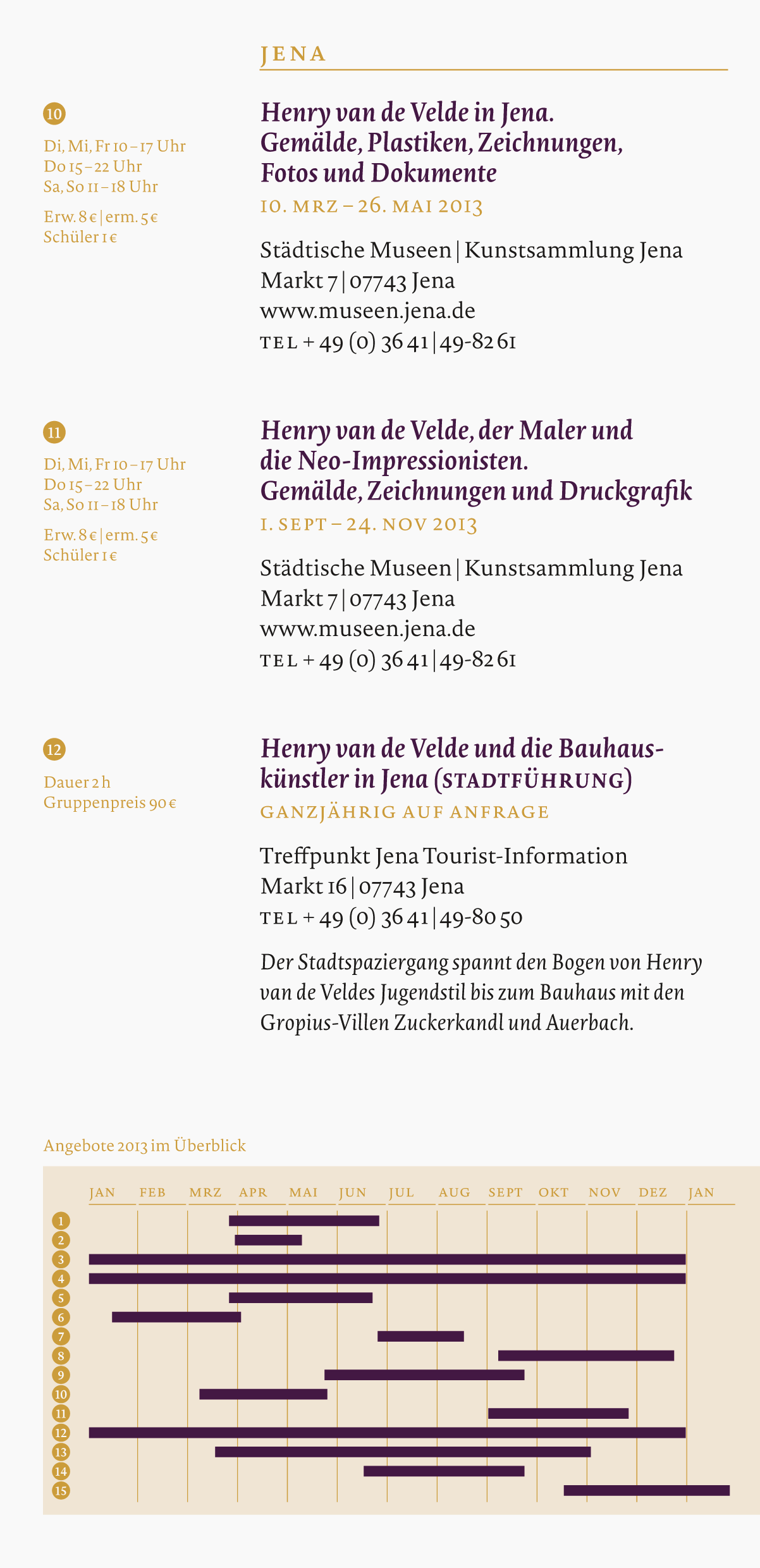 Commissioned by the Weimar tourist office, design studio Goldwiege conceived a brochure and a website for the Van de Velde year 2013. They employed two strong colors – dark purple and golden yellow – and a beautiful typeface. Novel was drawn by Christoph Dunst in 2008. In the following year it was amongst the TDC² winners – presumably not least for its adorable italics.