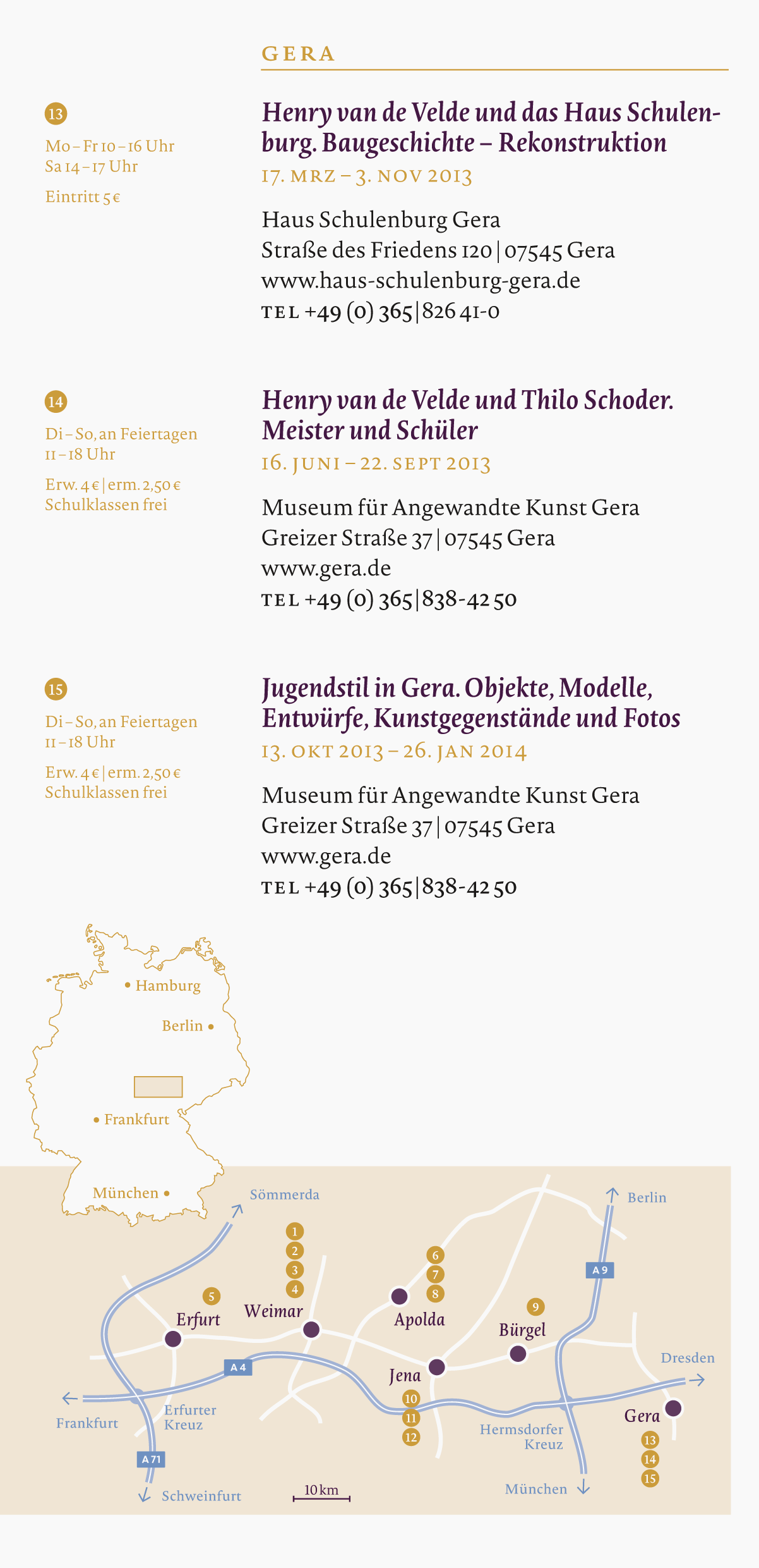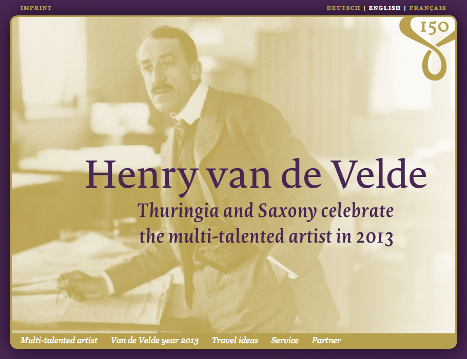 From 1902 to 1917, van de Velde was based in Weimar but was engaged throughout Europe, and it was during his time in Weimar that he created some of his greatest works. The dynamic Erfurt-Weimar-Jena region is celebrating the 150th anniversary of Henry van de Velde’s birth in 2013 by highlighting his achievements and those of his associates. Visitors will have the opportunity to acquaint themselves with all aspects of early modern art at a whole series of exhibitions and other events.