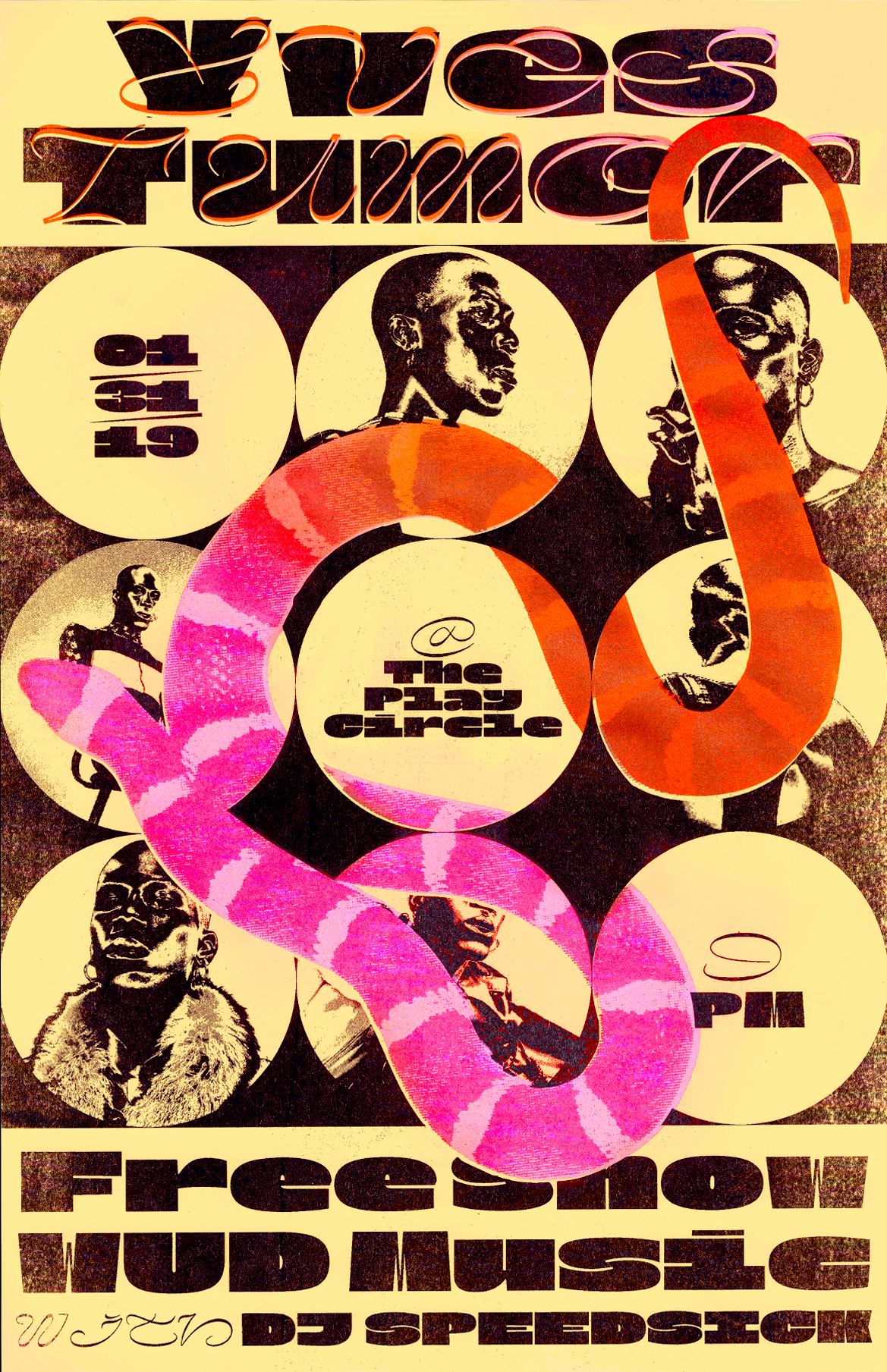 Concert poster for Yves Tumor at the Play Circle in Madison. Serpents are a common theme in his music. I used Nostra Stream with its snake-like qualities, overlapping the bolder Nostra Sett underneath. This contrasting type is meant to mimic the main serpent compositional element of the poster. Risograph printed by Bad Press.