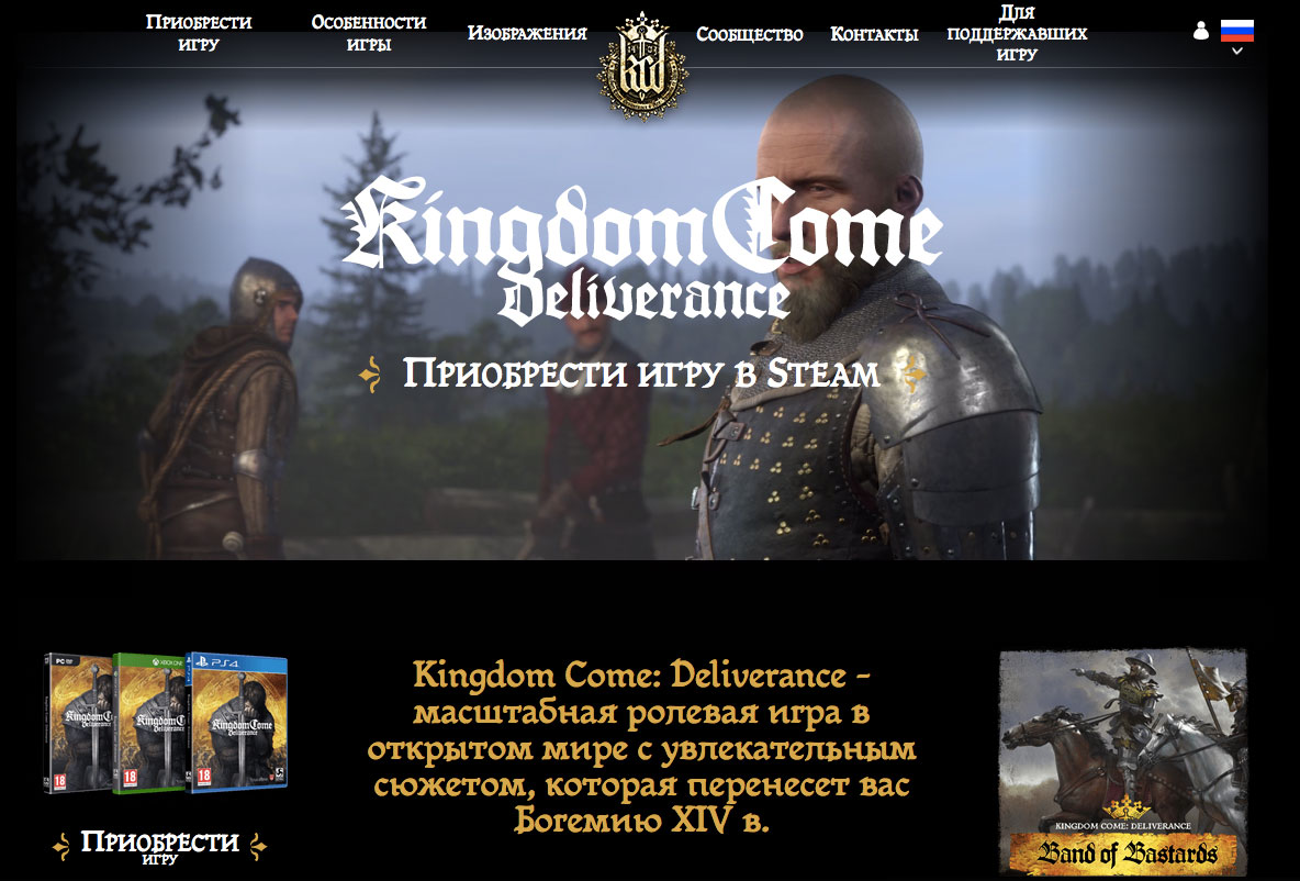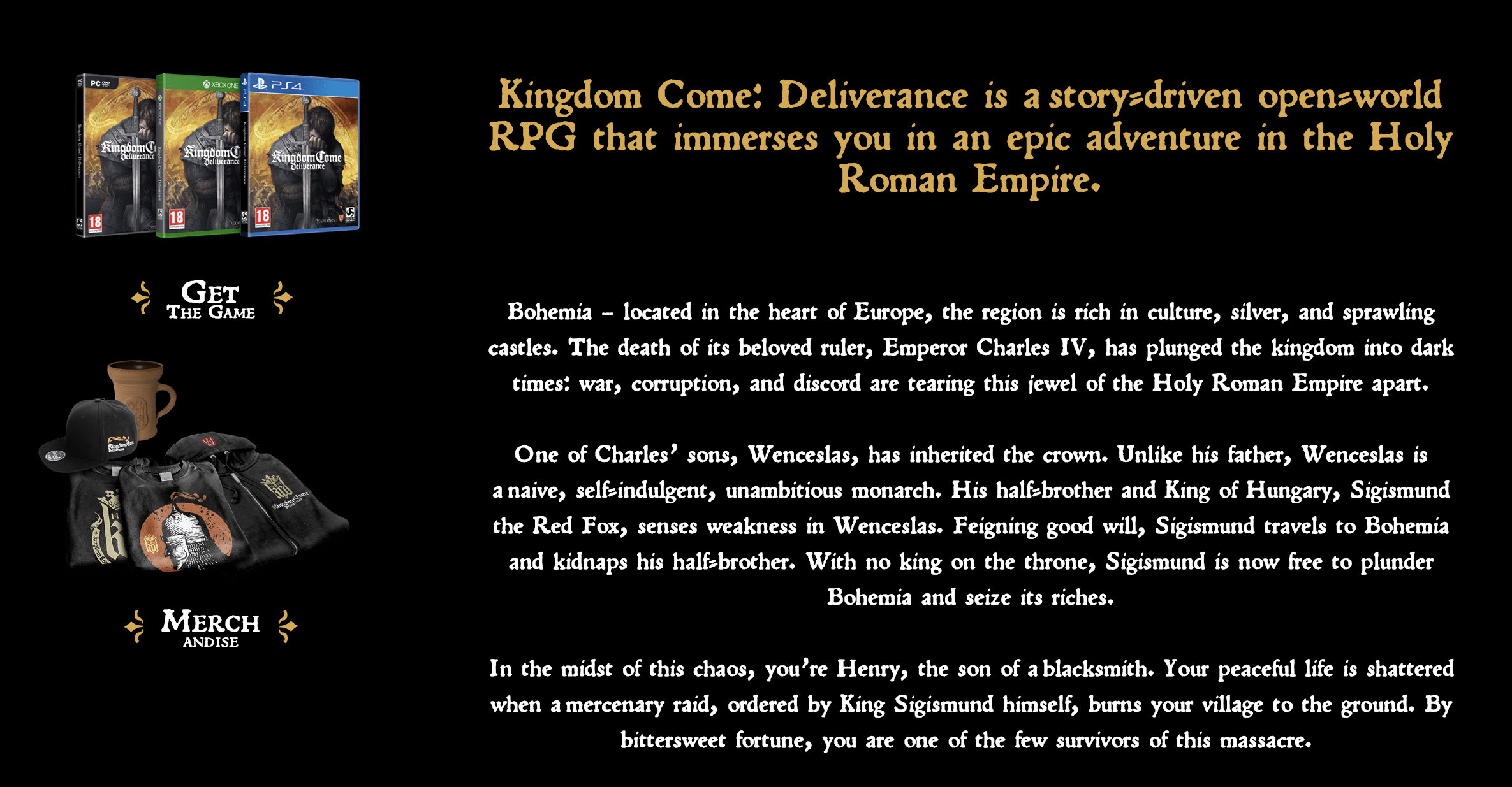 Kingdom Come: Deliverance is an action role-playing video game developed by Warhorse Studios and published by Deep Silver for Microsoft Windows, PlayStation 4 and Xbox One. It is set in the medieval Kingdom of Bohemia, an Imperial State of the Holy Roman Empire, with a focus on historically accurate content. It was released worldwide on 13 February 2018. — Wikipedia