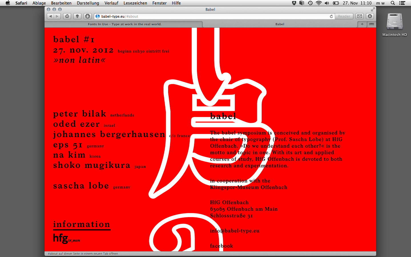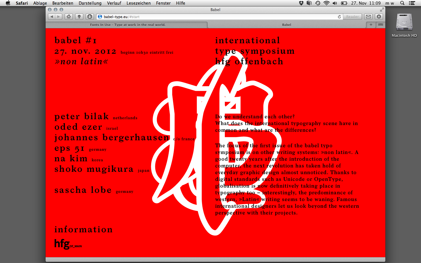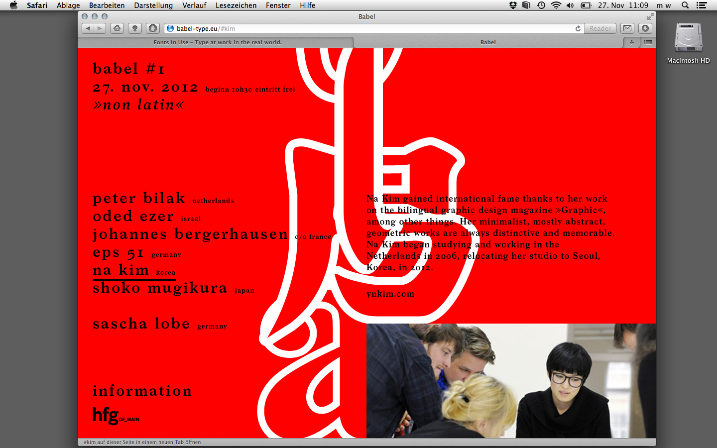 Babel #1 is an international type symposium held right now (the 27th of November) at the Hochschule für Gestaltung in Offenbach am Main. Apart from Offenbach’s other delights (among them Äppelwoi and others), the symposium scores with speakers like Peter Biľak (typotheque) and Na Kim, who art-directed the renowned Korean Graphic magazine.