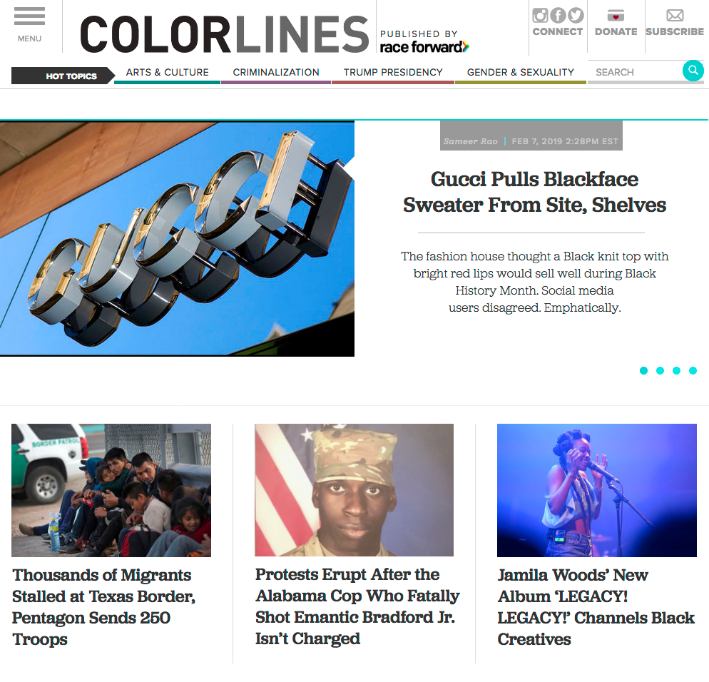 Published by Race Forward, a national organization that advances racial justice through research, media and practice, the daily news website uses Jubilat for both headlines and text, in a range of styles and sizes. The slab serif was conceived primarily as a display face, but with its large x-height, it works reasonably well for medium-sized text on screen as well. It here is contrasted with the sans-serif Proxima Nova for menus and captions. The Colorlines logo is in FF DIN.