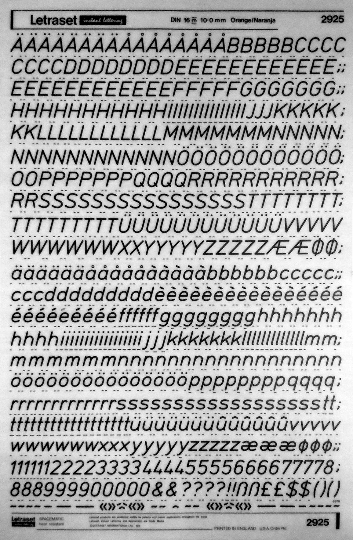 These 9 line widths were color-coded for easier use (Violet, Red, White, Yellow, Brown, Blue, Orange, Green, Gray), on technical pens like the Rapidograph and elsewhere. The depicted Letraset sheet has “orange” glyphs, i.e. their size is 10 mm, with 1.0 mm line thickness. See also the Wikipedia entry on ISO 216 which mentions the technical drawing line widths specified in ISO 128, and the matching technical pen widths as specified in ISO 9175–1.