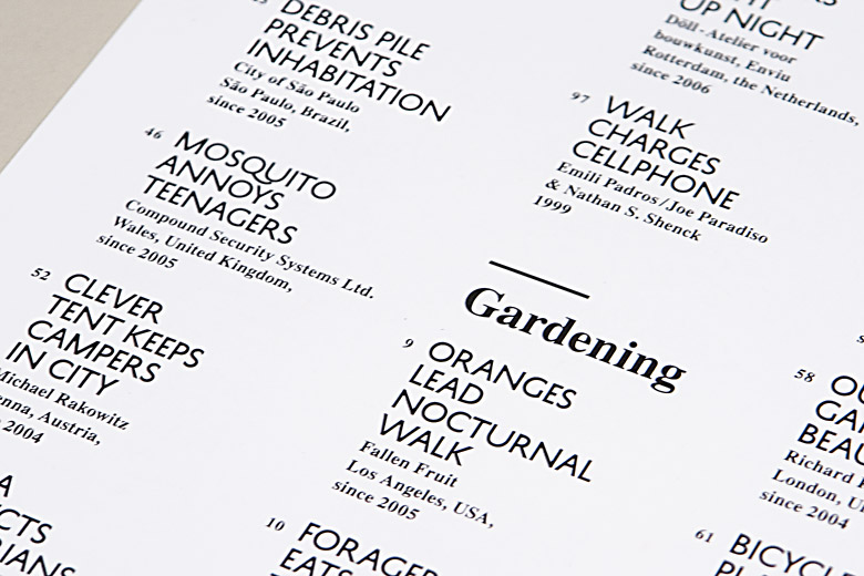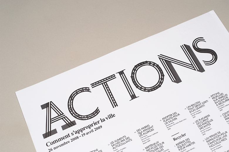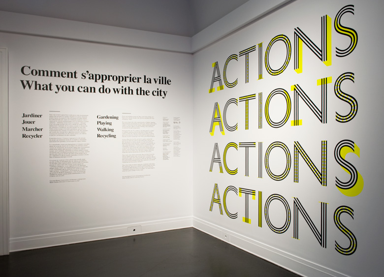 Actions, an exhibition at the Canadian Centre for Architecture in Montreal, explores how everyday human efforts can instigate positive change in contemporary cities. Activities such as gardening, recycling, playing, and walking are pushed beyond their usual definition by the 99 international architects, artists, and collectives featured in the exhibition. These experimental interactions with the urban environment show the potential for new forms of participation by city residents. Project Projects collaborated with the CCA on the exhibition design, which includes a large number of print pieces intended to provide a material form for documentation of ephemeral urban activities.