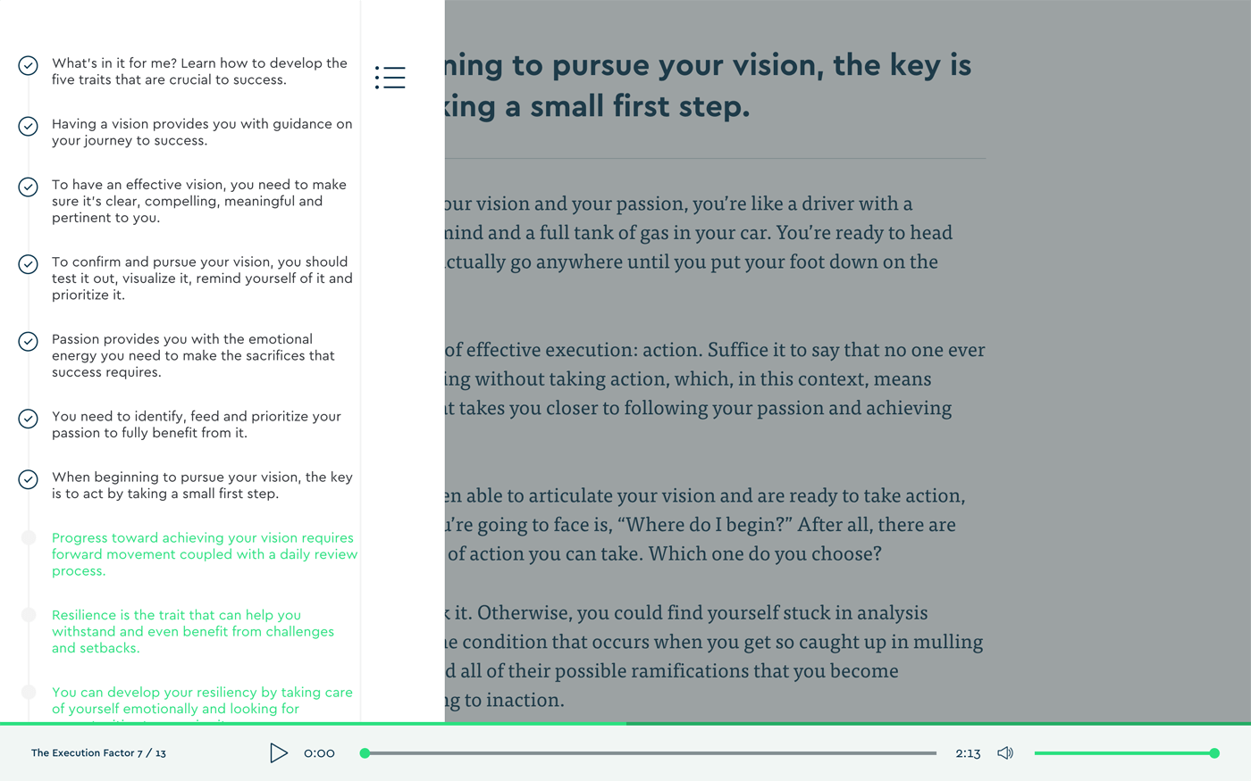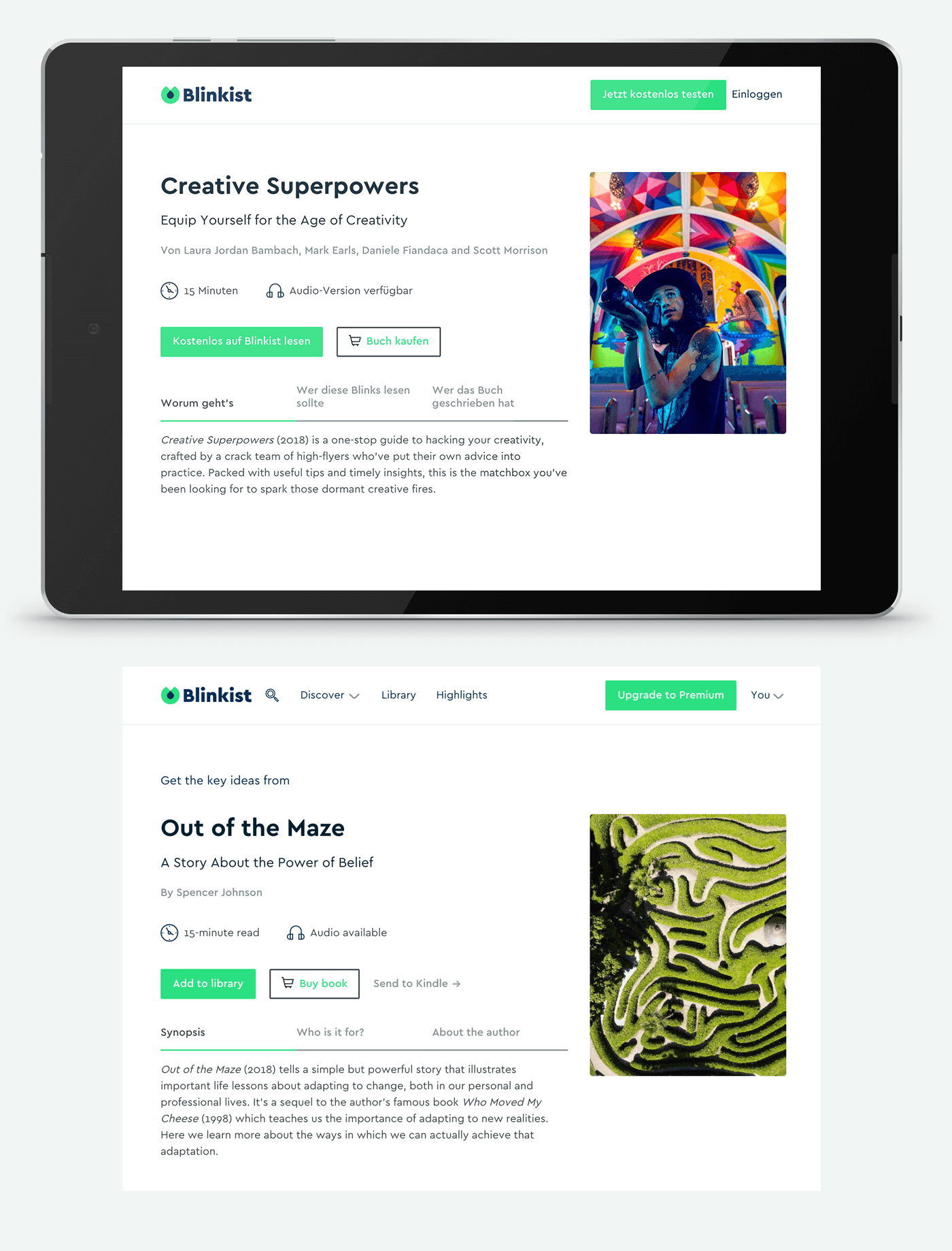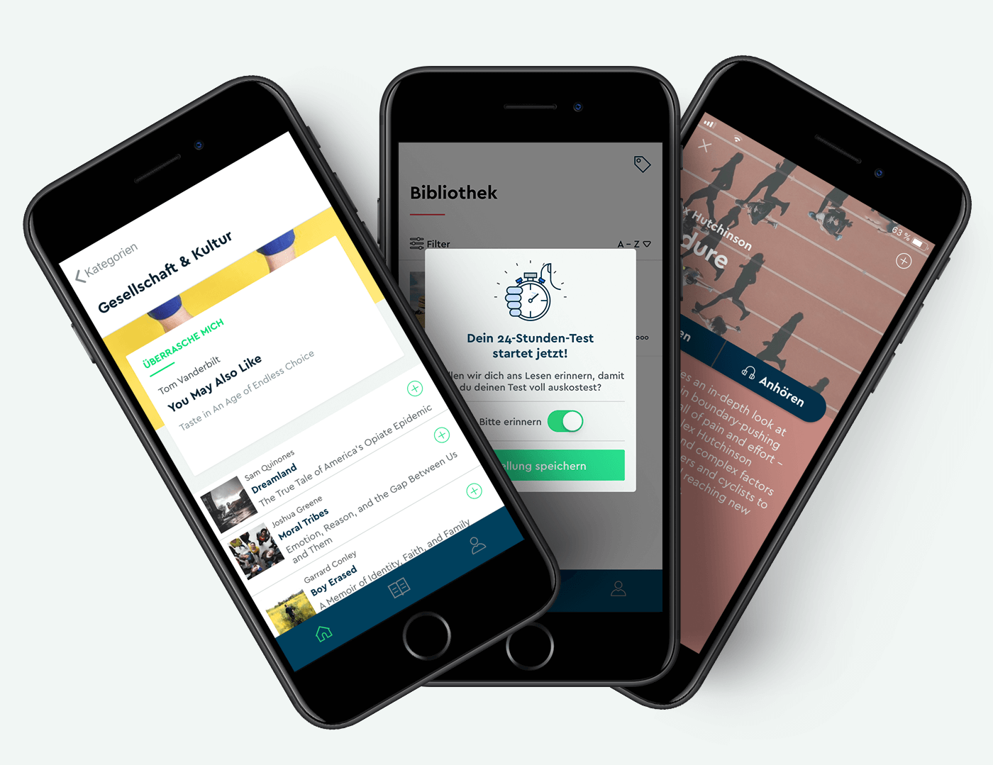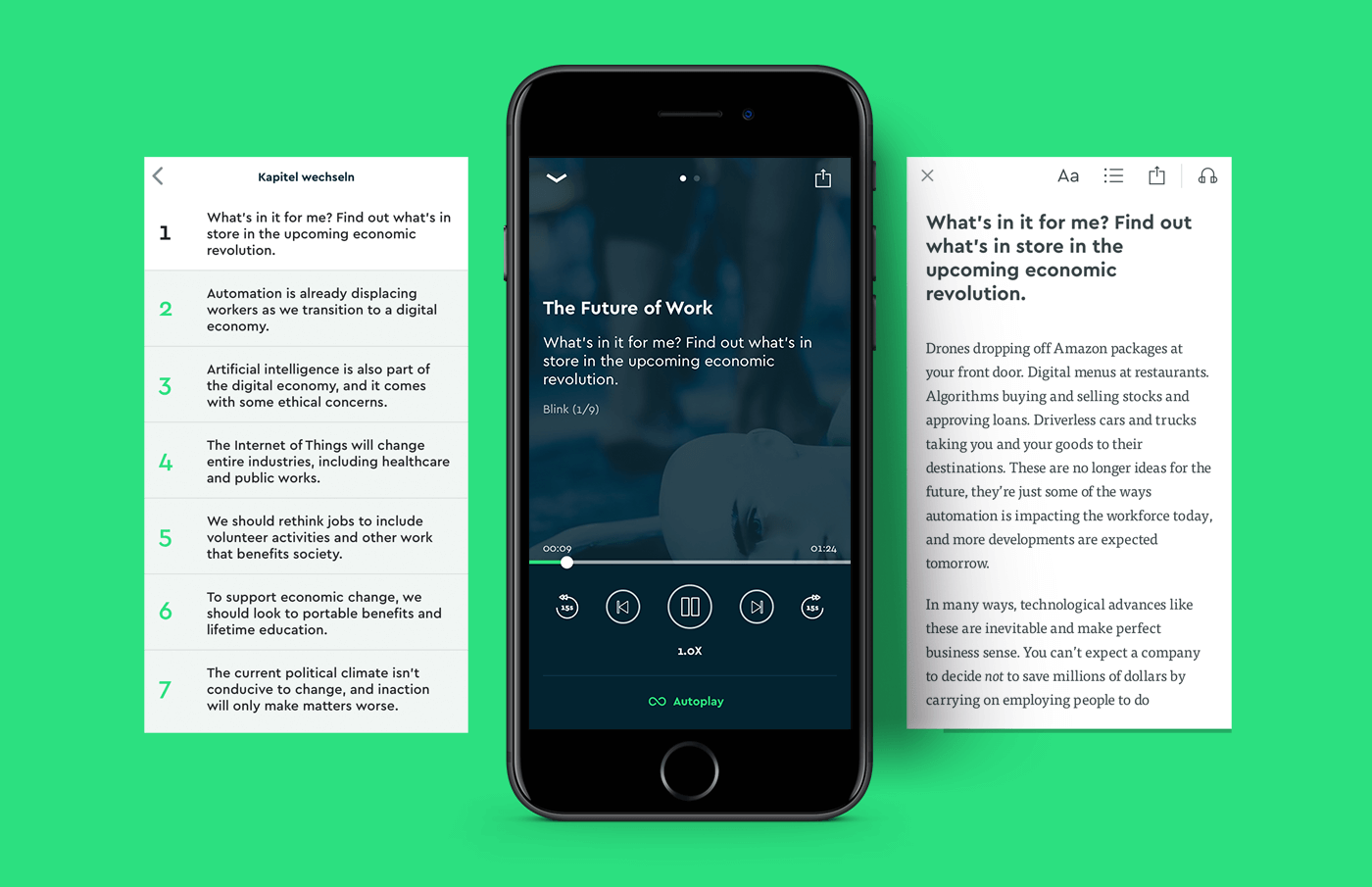 It remains to be seen whether the depth of the non-fiction books — either read and heard on a smartphone, tablet or computer — can be compressed this much without losing essential content. However, FF Tisa, which is used in the continuous text, reads well in any case. Everything else is set in the Cera Pro — headlines, short info texts as well as the complete user interface.