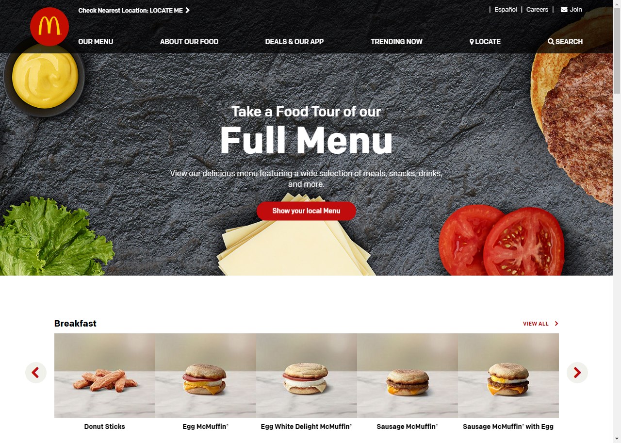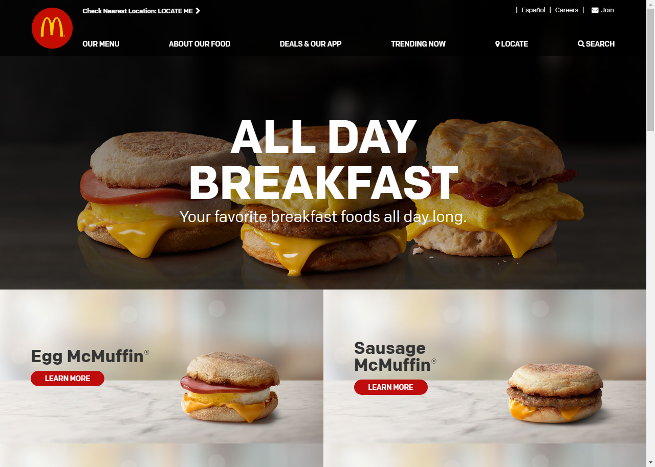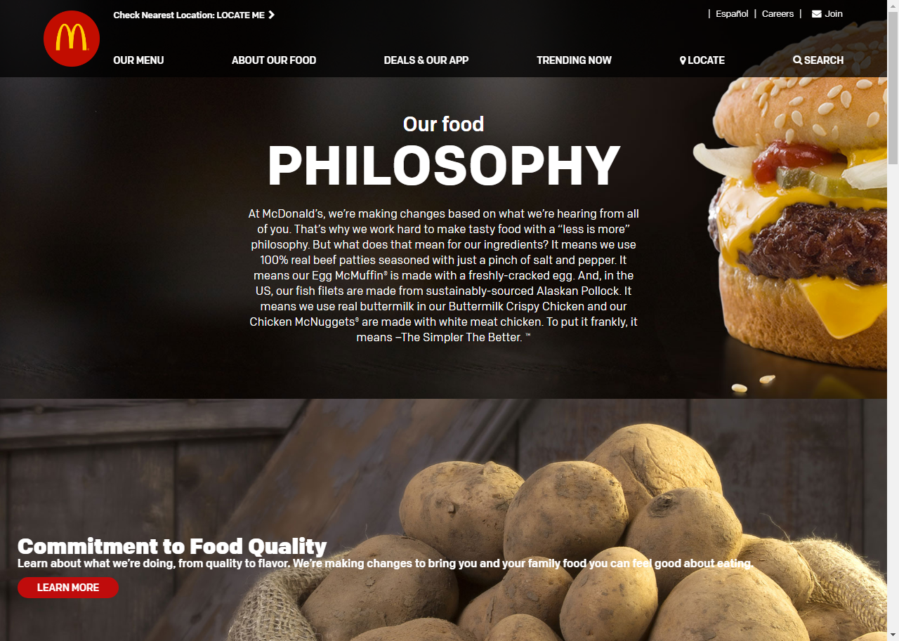 The McDonald’s website uses the corporate typeface Lovin’ Sans for all typography. Lovin’ Sans is a customized version of Process Type Foundry’s Colfax. It was adapted at Leo Burnett (a long-term communication partner of McDonald’s) with Brian Loehr’s involvement.