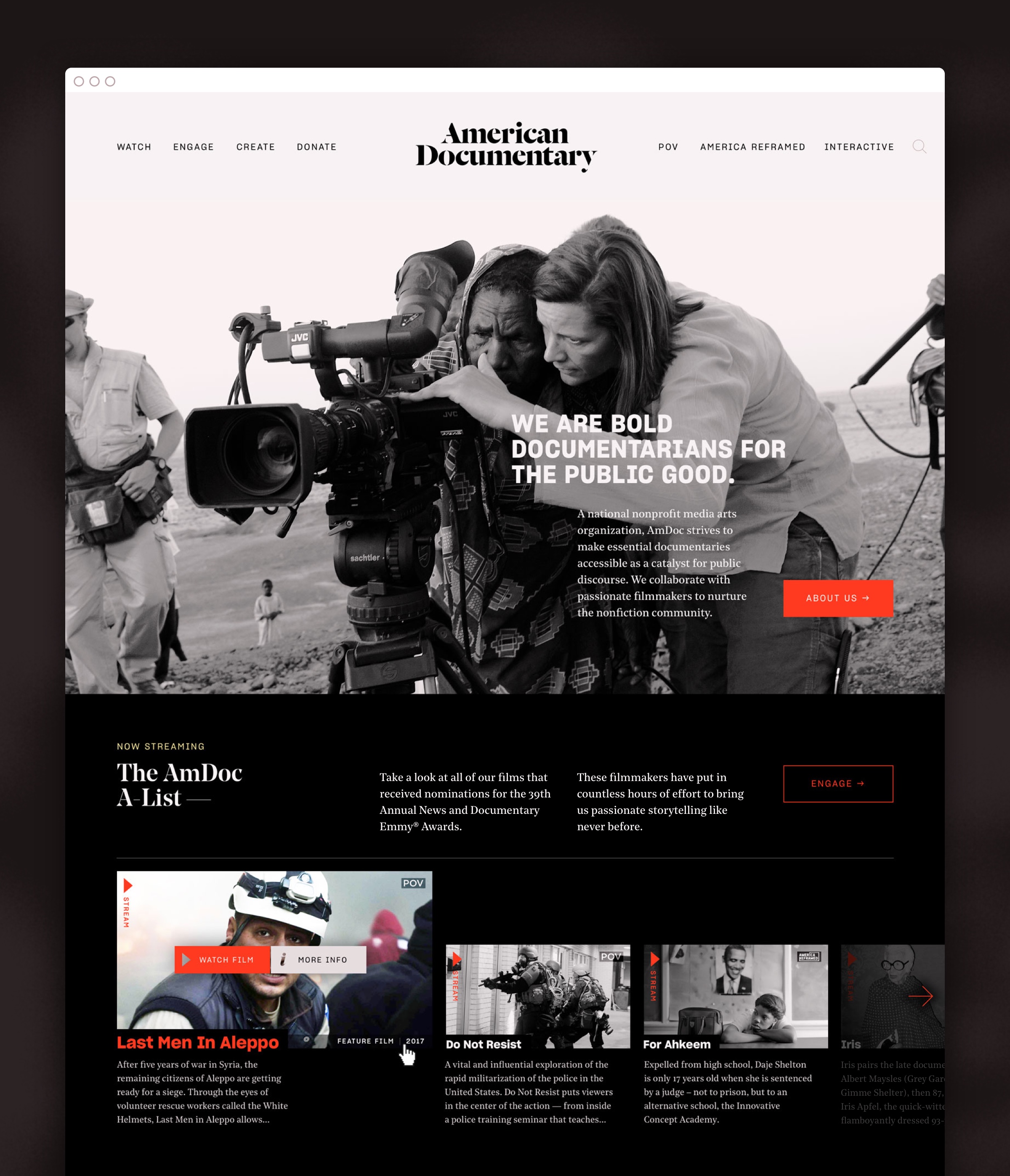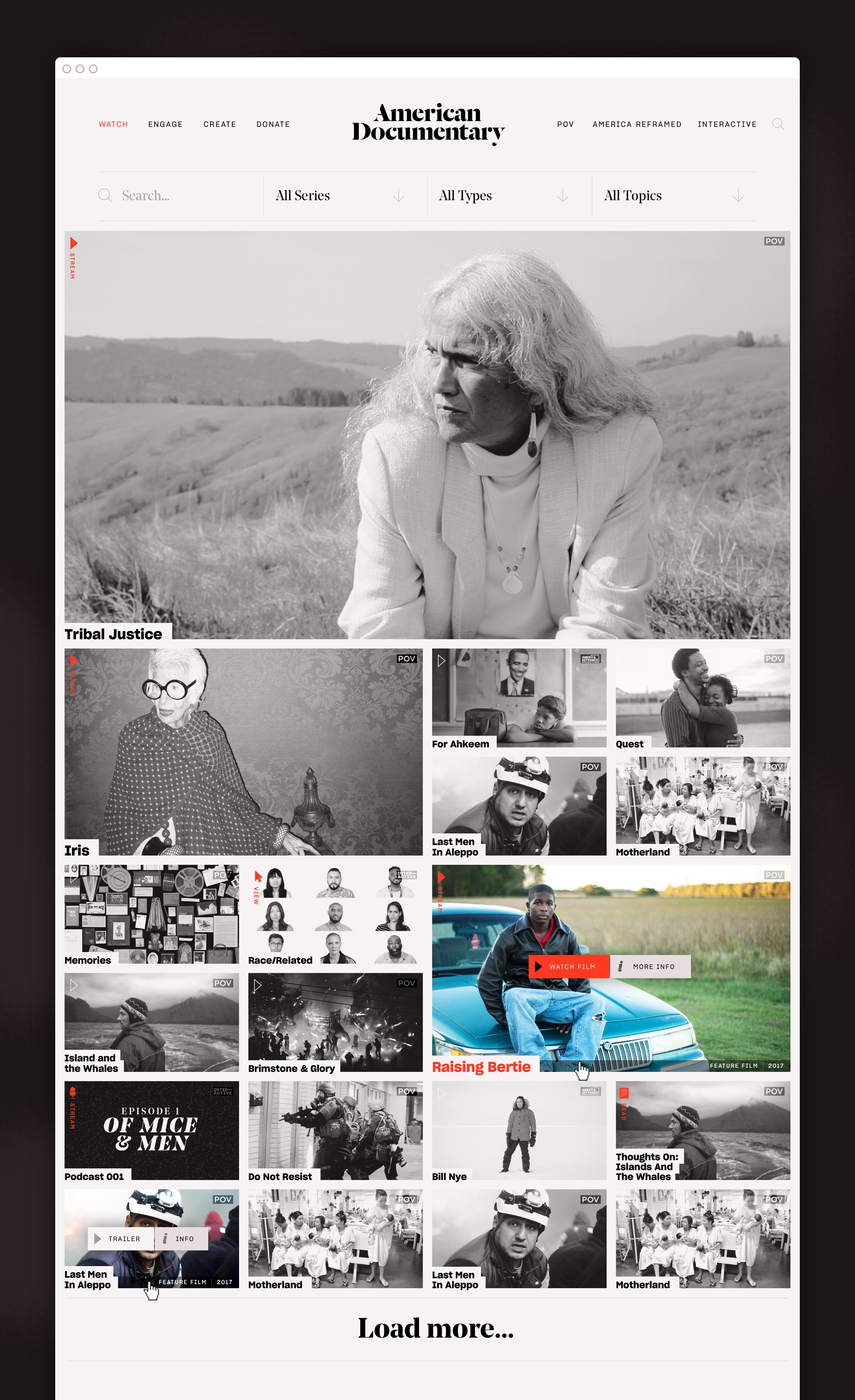 The new web platform strives to aggregate all of this content, and nests it under clear and actionable navigation items. The navigation prioritizes categories like “Watch” and “Engage” — allowing users to explore American Documentary’s full array of media, agnostic to its broadcast origin. The other half of the navigation scheme leverages American Documentary’s most recognizable series — POV and America Reframed — to give users direct access to media they may have seen over broadcast. Elevating series also allowed American Documentary to more overtly identify itself as the parent of POV — a series long thought to be its own, independent entity — and to introduce its Interactives division as a new series of content on par with POV and America Reframed.