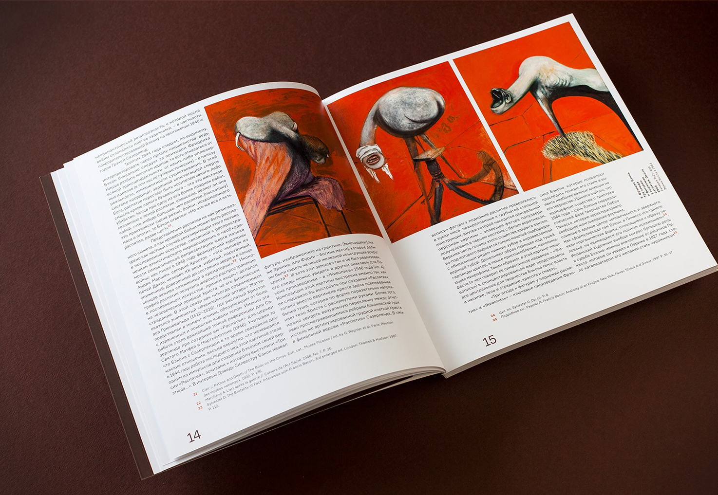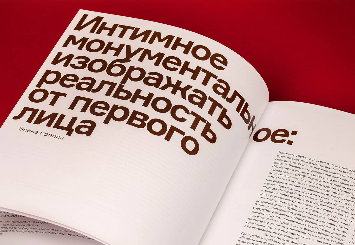 Formular in use in the catalogue that accompanies Francis Bacon, Lucian Freud, and the School of London, an exhibition in the Pushkin Museum of Art organised in collaboration with Tate Modern. The design of the catalogue is quite straightforward, but ABC Design found opportunities to play with type. Note the colored footnote markers and the rotated captions.