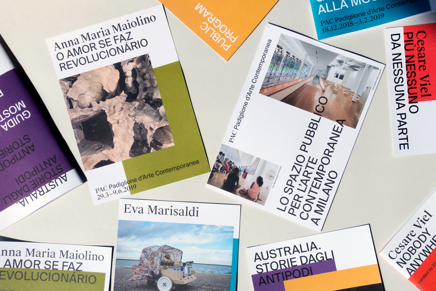 by providing the museum with a modular system based on movable layers of text, images and color. Each event is characterized by a distinctive color, running through posters, catalogues, exhibition guides, printed ephemera, museum signage and merchandising.