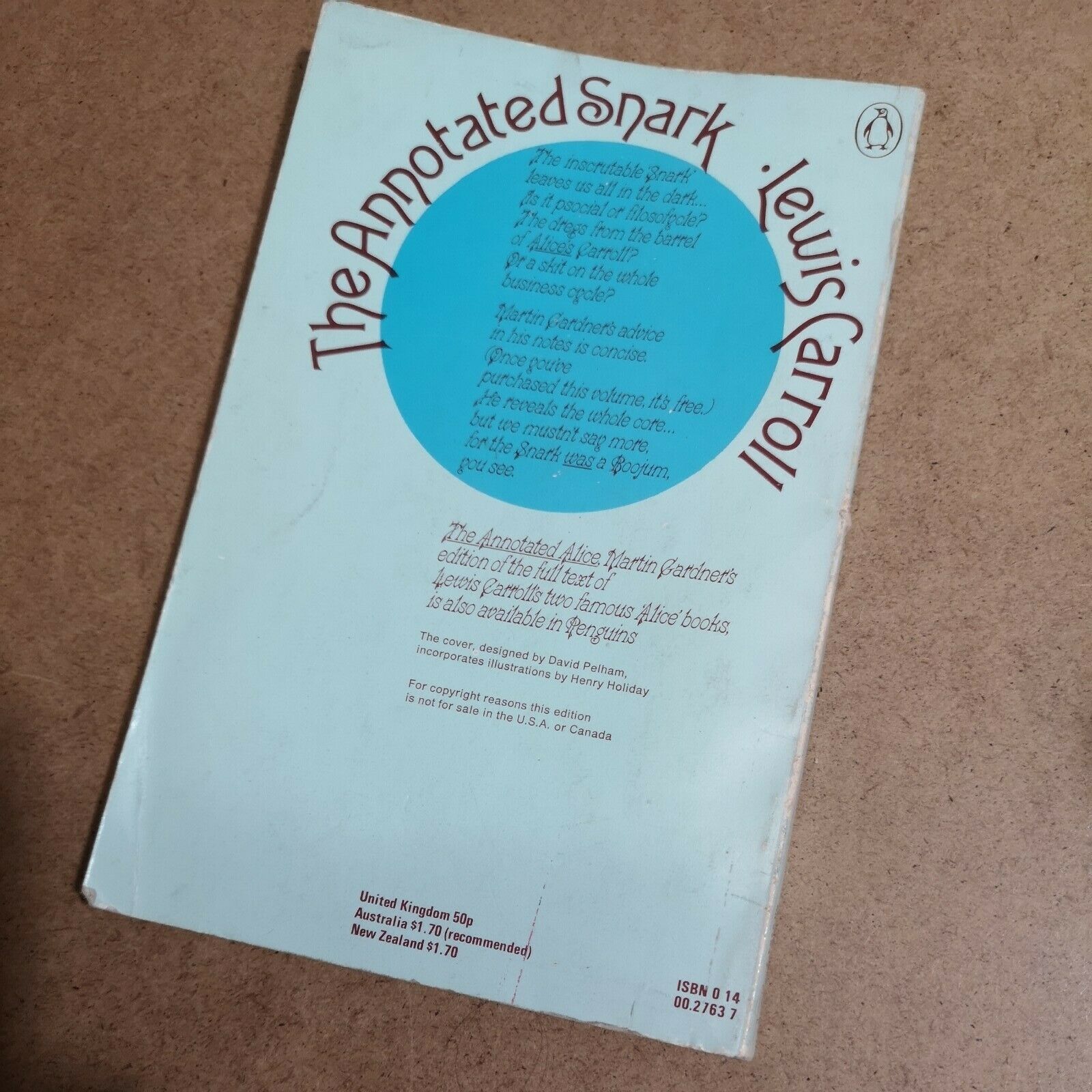 The Annotated Alice with Alice’s Adventures in Wonderland and the sequel Through the Looking Glass was first published by Bramhall House in 1960, and by Penguin in 1965; the depicted cover was used for the revised version from 1970 and later reprints. The Annotated Snark with the full text of The Hunting of the Snark was followed in 1967, with this cover being used from around 1973. Pelham’s cover designs incorporate the original illustrations by John Tenniel and Henry Holiday, respectively.