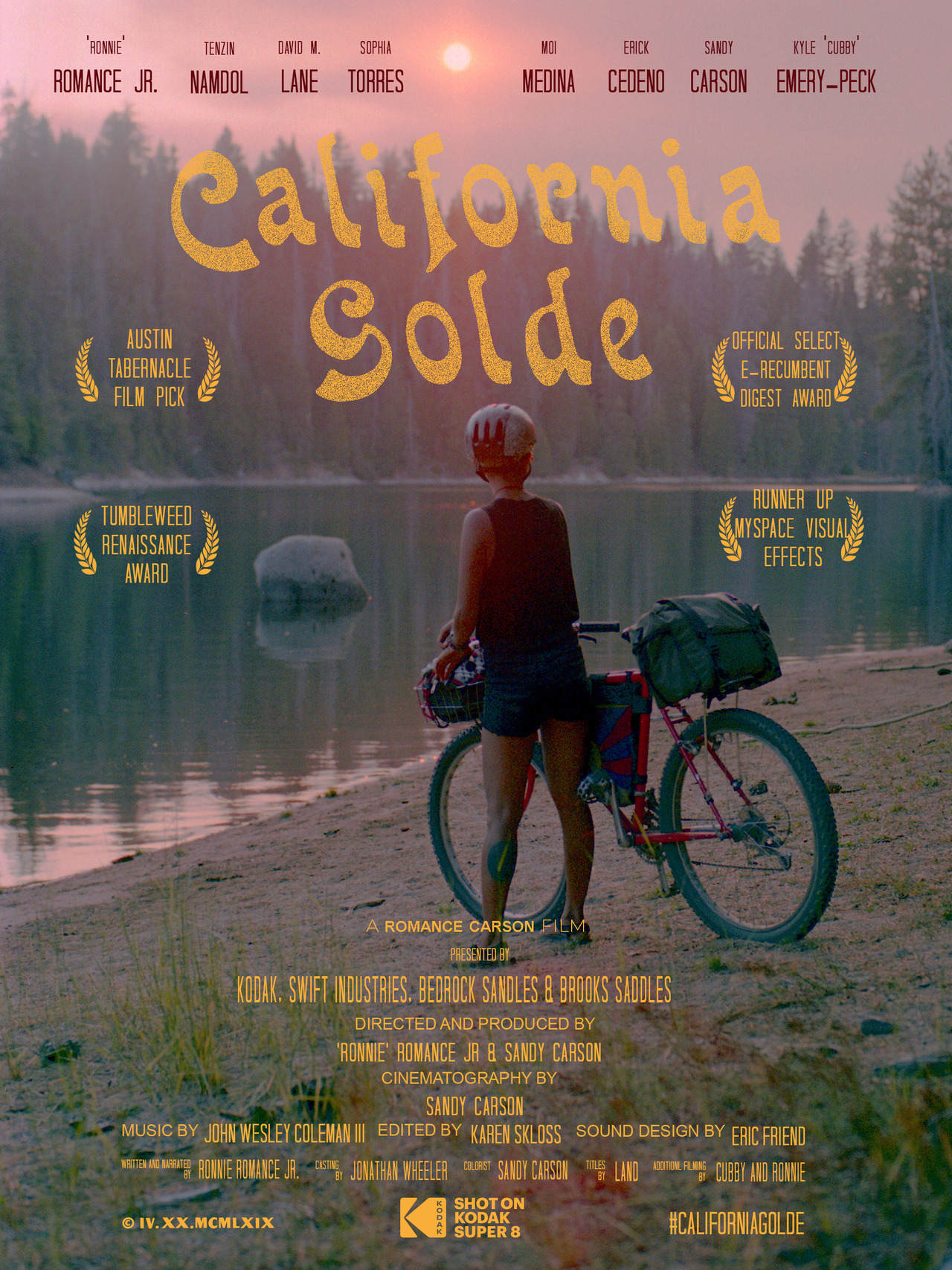 On his site, the movie’s filmer/director Sandy Carson refers to his movie as “California (G)Olde”, “California Gölde” and “California Golde”. The movie logo uses Reklame Kursiv, a late 1800s unconnected cursive typeface that, like this movie, lived under different names. The digitised version used here is named Patent Reclame and available from HiH.