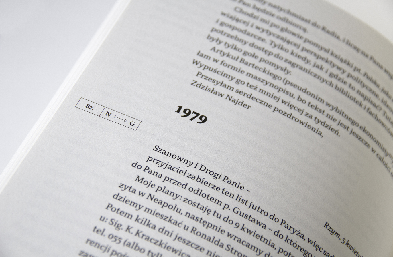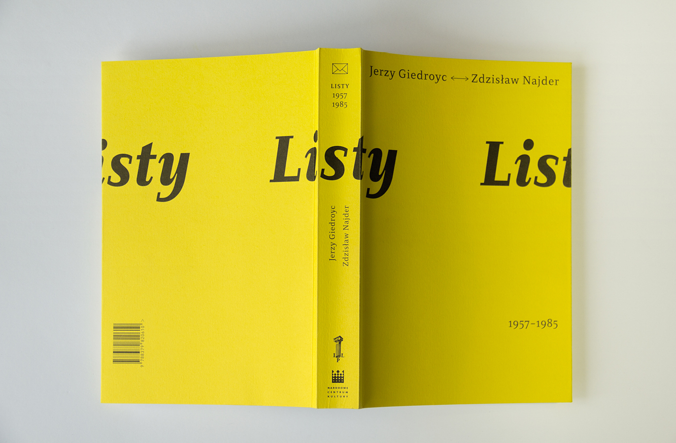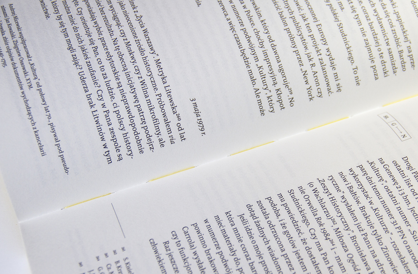 “Listy” means “letters” and refers to the long-term correspondence of Polish writers and activists Jerzy Giedroyc and Zdzisław Najder. The design of the book reflects how the relationship between the two men changed over time. Initally intense, it cooled down and then became conflicting. A characteristic motif of the layout of both the cover and the inserts is broken typography. The title of the cover is partly hidden. Navigating the letters is facilitated by numbering and marking them with the initials of the sender and recipient. The only decorative element, including a fairly minimalist design, is the repeating motif of delicate lines and rectangular boxes with letters of letters.