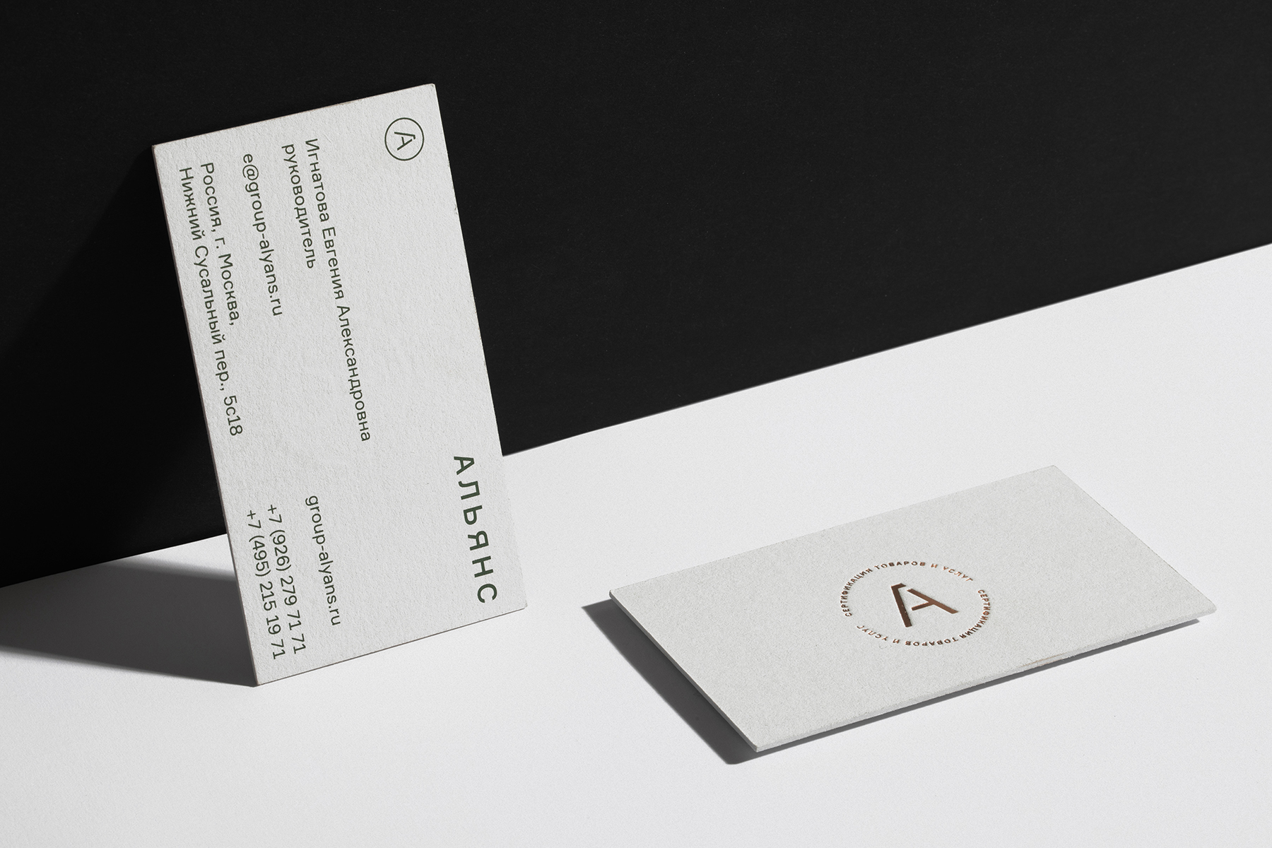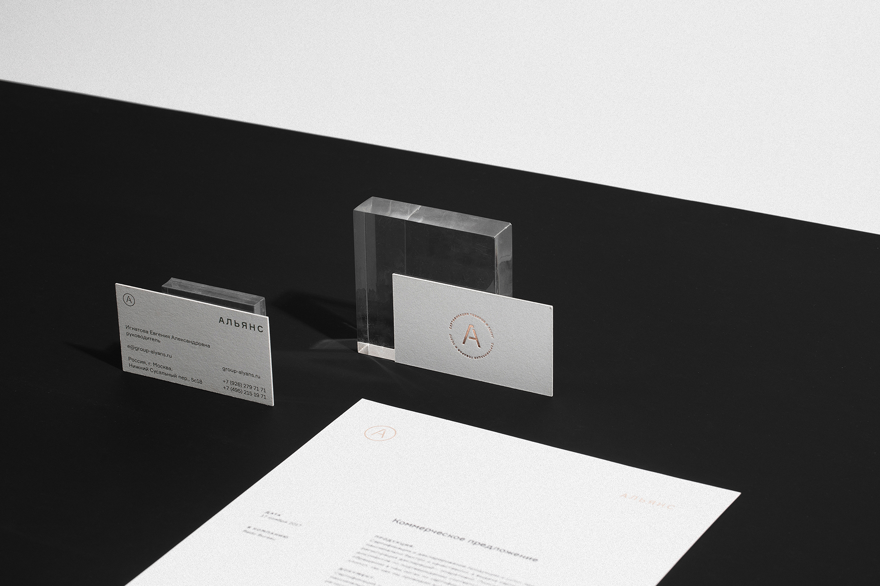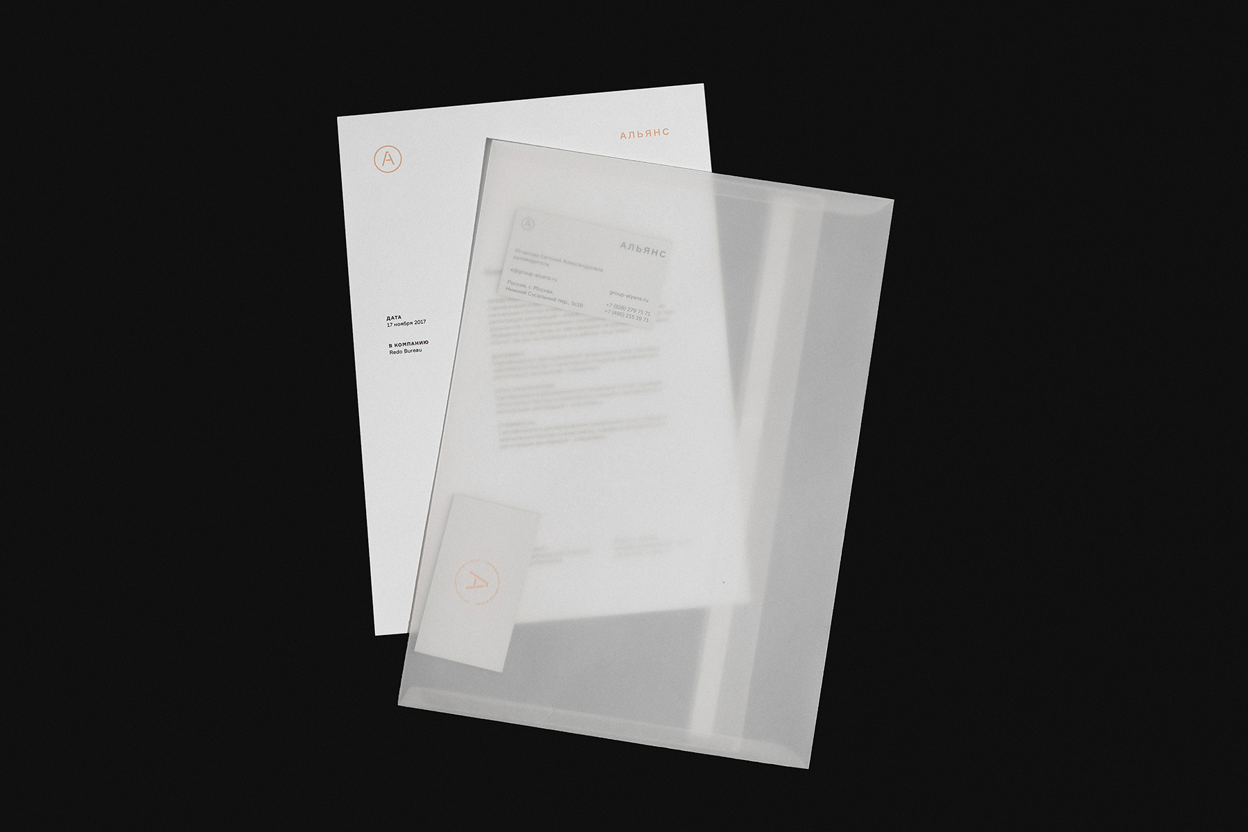We also designed and produced stationery for Alliance. The principle of transparency was implemented in the selection of the printed materials — we used transparent envelopes for invoices and letters, white or light grey paper for blanks and business cards, correlating them with the website’s imagery. In this case, transparency also means trust that is formed between the customers and the company.