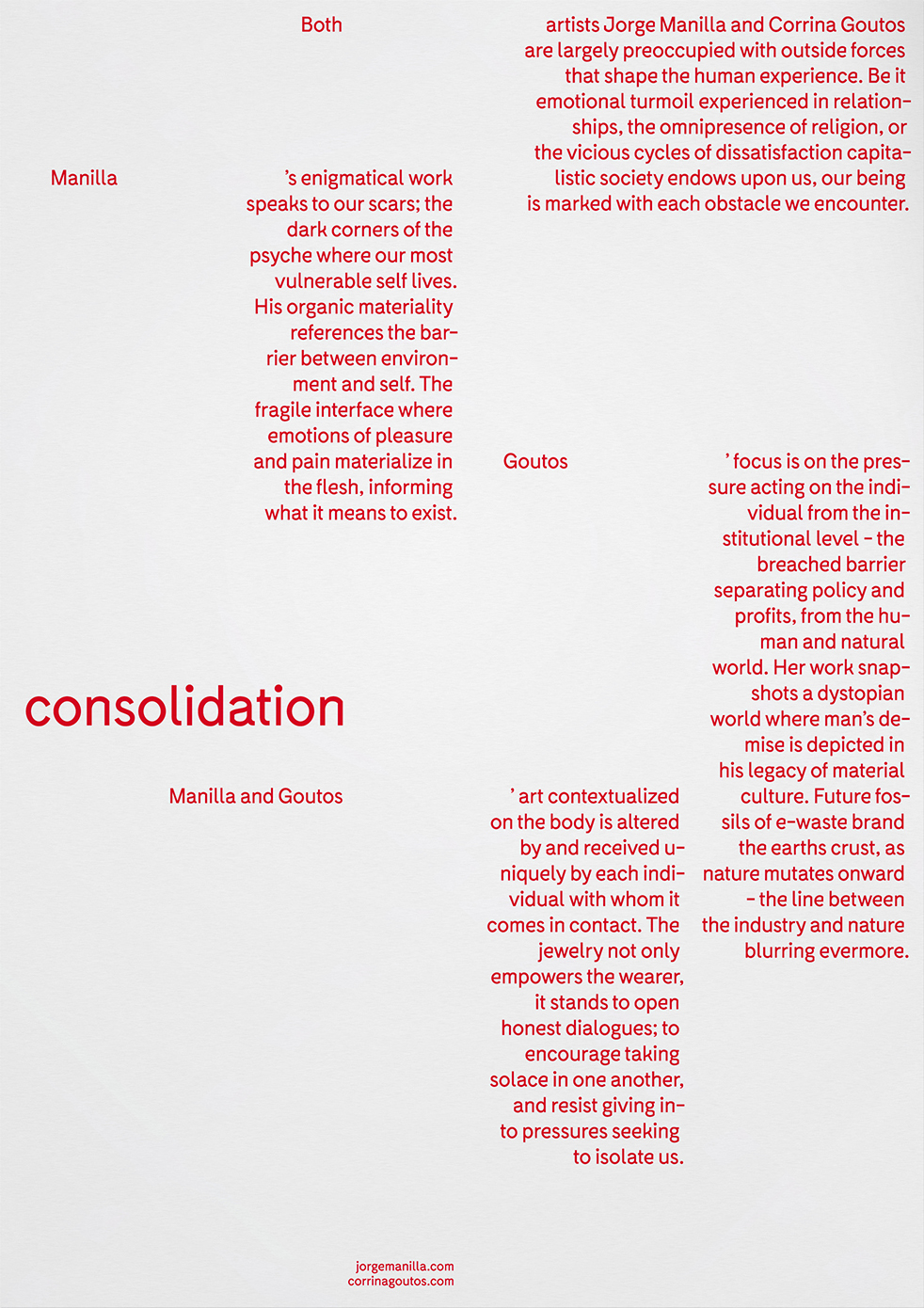 consolidation at 84GHz Contributed by nils poppe on Mar 31st, 2019. Artwork published in March 2019. Photo: nils poppe. License: All Rights Reserved. Outlined and solid Fabrik in use on the flyer for a contemporary jewelry exhibition with works by Jorge Manilla and Corrina Goutos, shown at 84GHz during the Munich Jewellery Week. Photo: nils poppe. License: All Rights Reserved. Photo: nils poppe. License: All Rights Reserved. Typefaces More about Fabrik Formats Posters/Flyers (5756) Topics Art (4684) Designers/Agencies Nils Poppe (23) Tagged withjewelry (86)scattered type (100)art exhibitions (864)outlined type (1256)one typeface (1753)right-aligned text (264)Jorge Manilla (1)Corrina Goutos (1)red (824)84GHz (1) Artwork location Germany (3869) München (291) Hamburg (297) In SetsCool (jack) (37)website (Lexie Fuell) (15)Favorite (CLEMENT LEPY) (57)cool (Karo Konieczna) (871)GD (Marie Adamová) (9)Sans (Anita Nguyen) (10)modern album art (J. Plymouth) (49) Post a comment Name Email – will not be published Website Your response Submit Comment More in Art Crossing magazinec. 2019Federico BardelliAlexis ZurflühLudwig HaslbergerContributed by Lucas Le Bihan Grand Palais A–Z. Ein ABC der Off Kultur2019Atelier PolContributed by Atelier Pol Staff Pick Adrift by Ricardo Brey2019Studio Luc DeryckeContributed by Adrien Menard Sponsor More in Posters/Flyers Speakeasy Catania2020John BlondContributed by John Blond Syracuse International Film & Media Festival 2016 posterc. 2016Gianni LatinoContributed by F37® Mini Maxi Print exhibition2019Oana MariesContributed by Oana Maries 5Berge Poster Series2013David GobberContributed by Florian Hardwig Staff Pick More Fonts In Use Borá movie posters2017Bárbara AbbêsContributed by Bárbara Abbês Staff Pick Le Bonbon Nuit nº93, April 20192019République StudioContributed by République Studio Staff Pick Helmut Lang perfume ad campaign2000Jenny HolzerMarc AtlanContributed by Stephen Coles Staff Pick Sacré – Matthieu Gafsou2012IDPURE éditionsThis is notRaphaël VeronaContributed by Altiplano Typefaces Staff Pick Rush – Rush album art1974Paul WeldonContributed by Florian Hardwig Staff Pick Fairway Market logosc. 2019unknownContributed by Florian Hardwig Blog Stamped2011Anthony CafaroContributed by Stephen Coles Staff Pick Casa Maria Bottero / Umberto Rivac. 2024zollContributed by Aeiou Tools Staff Pick