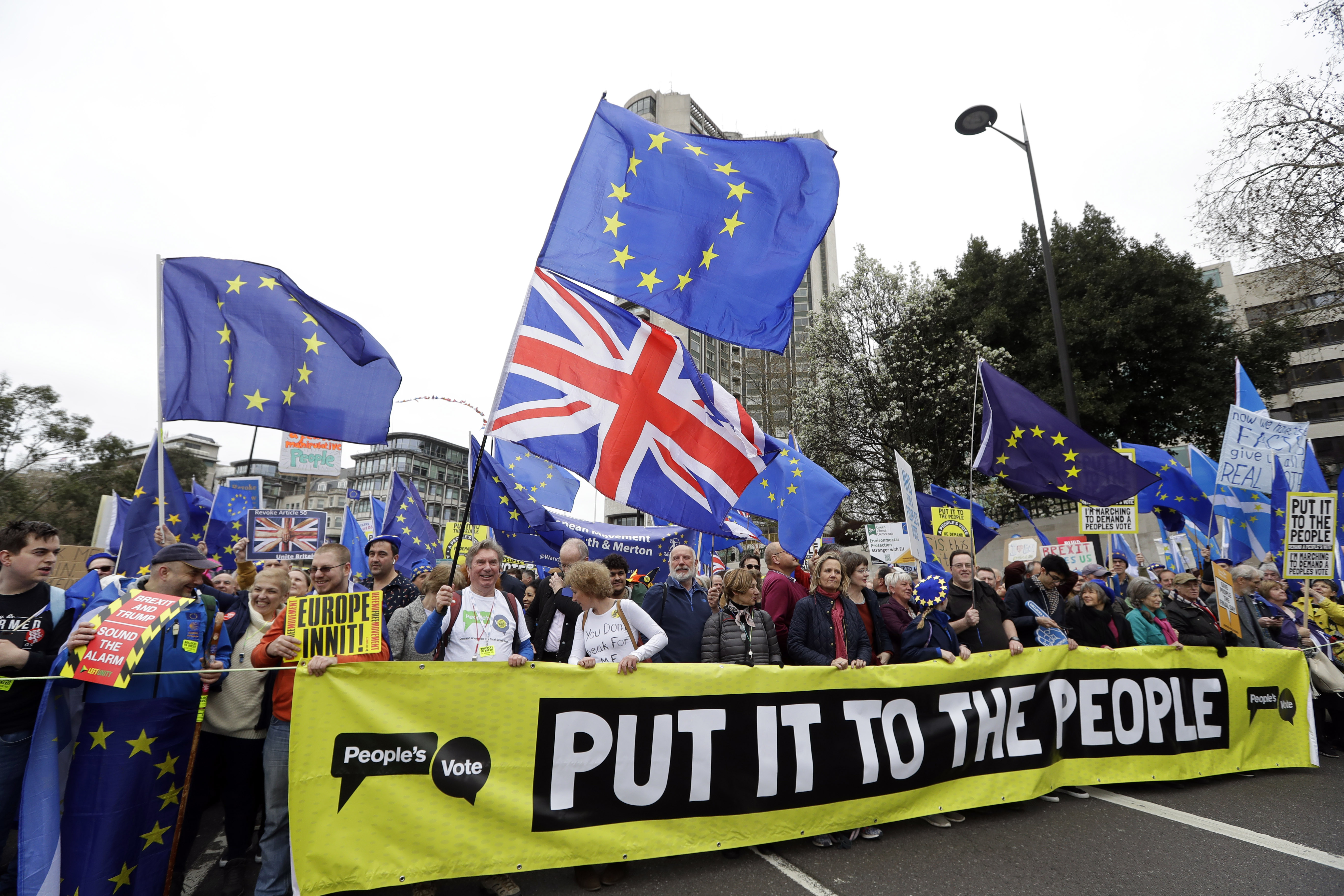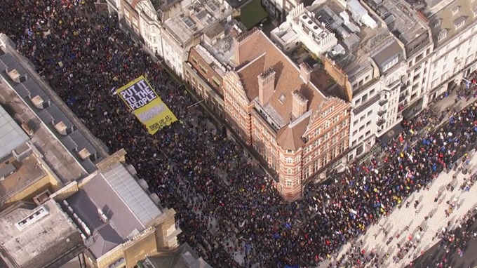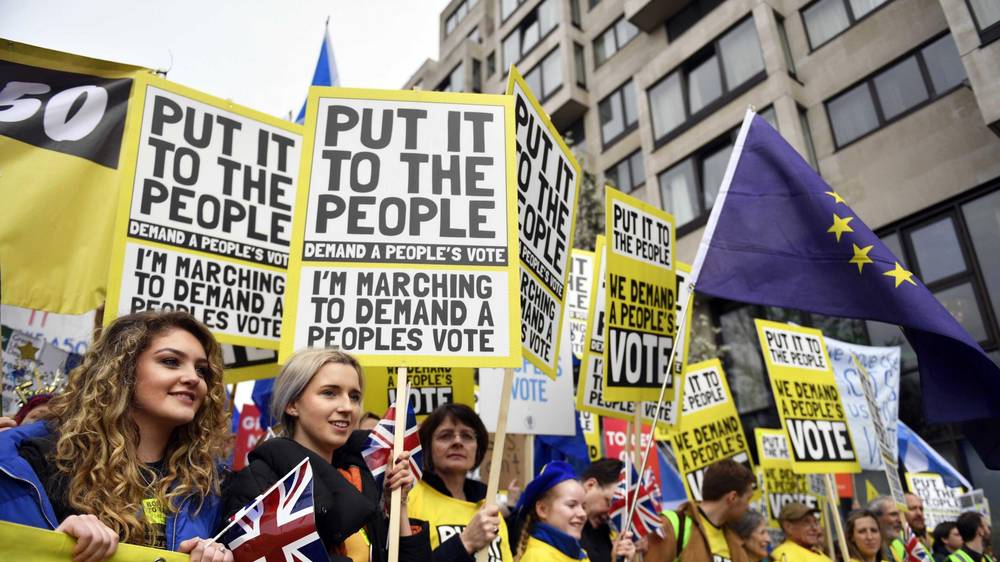 LONDON (AP) — Anti-Brexit protesters flooded into central London by the hundreds of thousands on Saturday, demanding that Britain’s Conservative-led government hold a new referendum on whether Britain should leave the European Union.