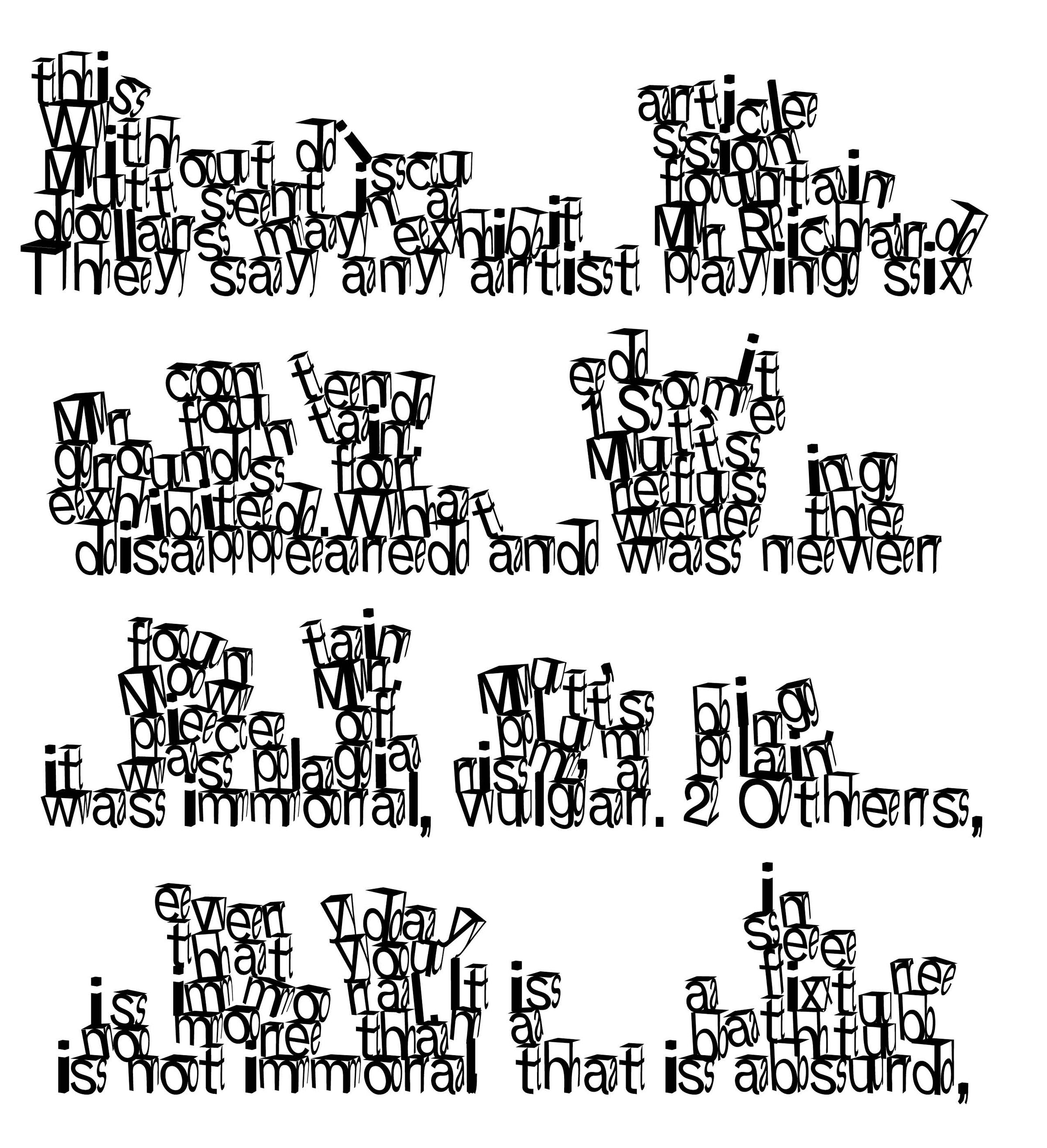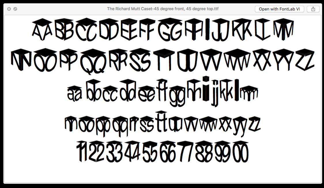 In reference to The Richard Mutt Case, I created type using boxes with letters from MT Grotesque printed on their sides. Photographs of these boxes from three different angles were used to produce three digital versions as a typeface, to be used as a bold, italic, and regular weight.