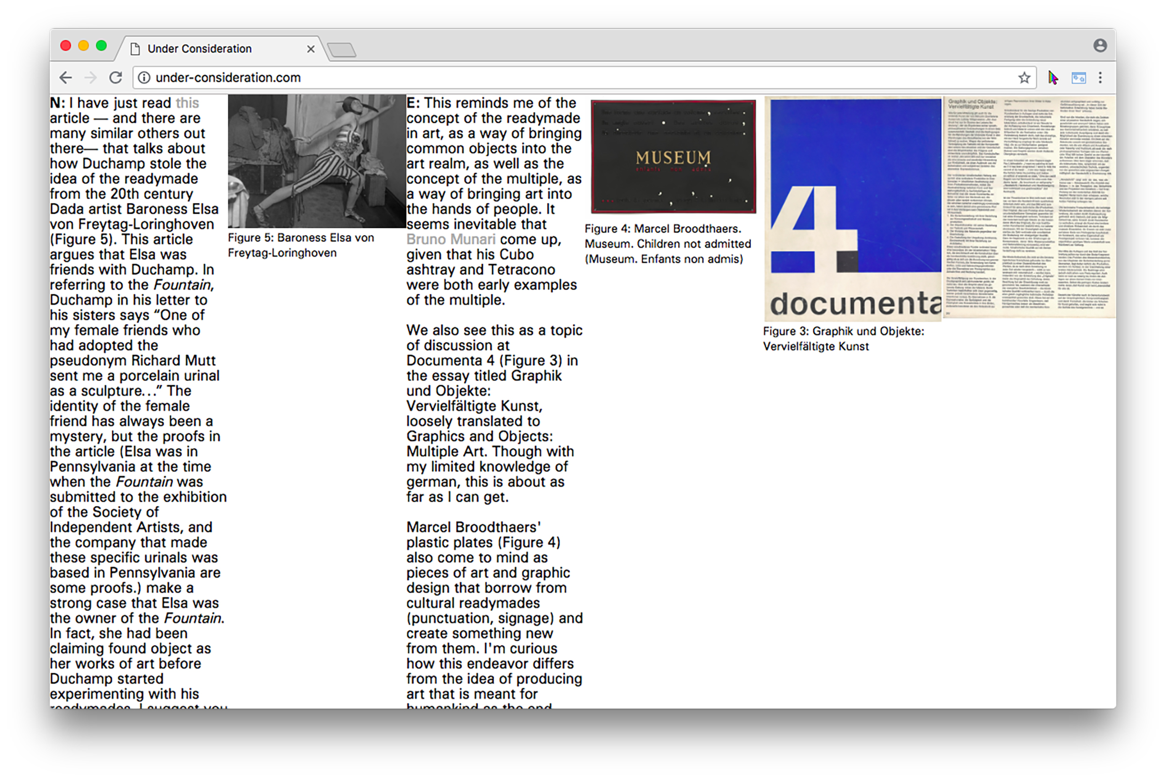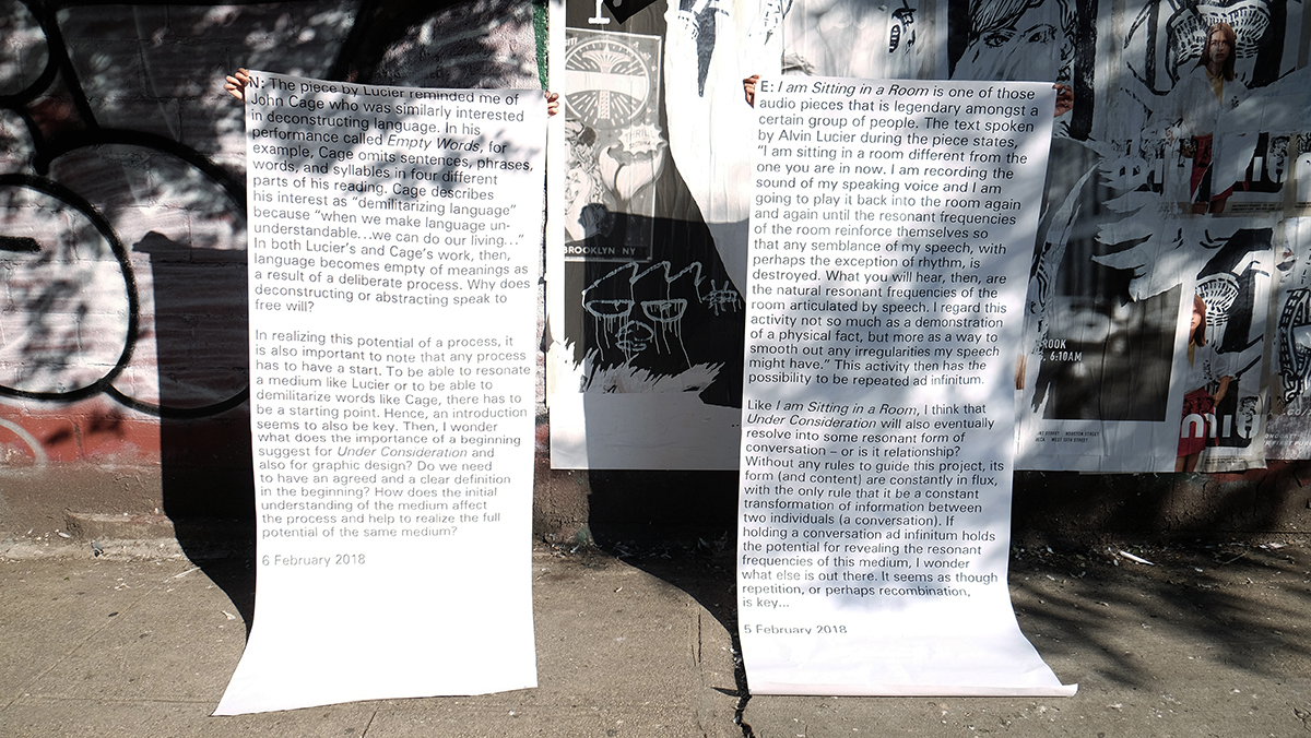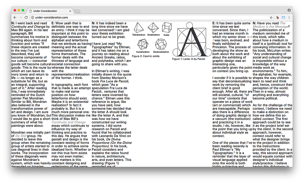 Under Consideration is a collaborative publishing effort by Nazli Ercan and Eric Li. It is a container for an exchange of ideas between the Ercan and Li. Each new entry on the website is a response to the previous entry by the other author; it is the next thought of a continuous conversation. In this regard, the entries themselves become the medium in this unending collaborative process.