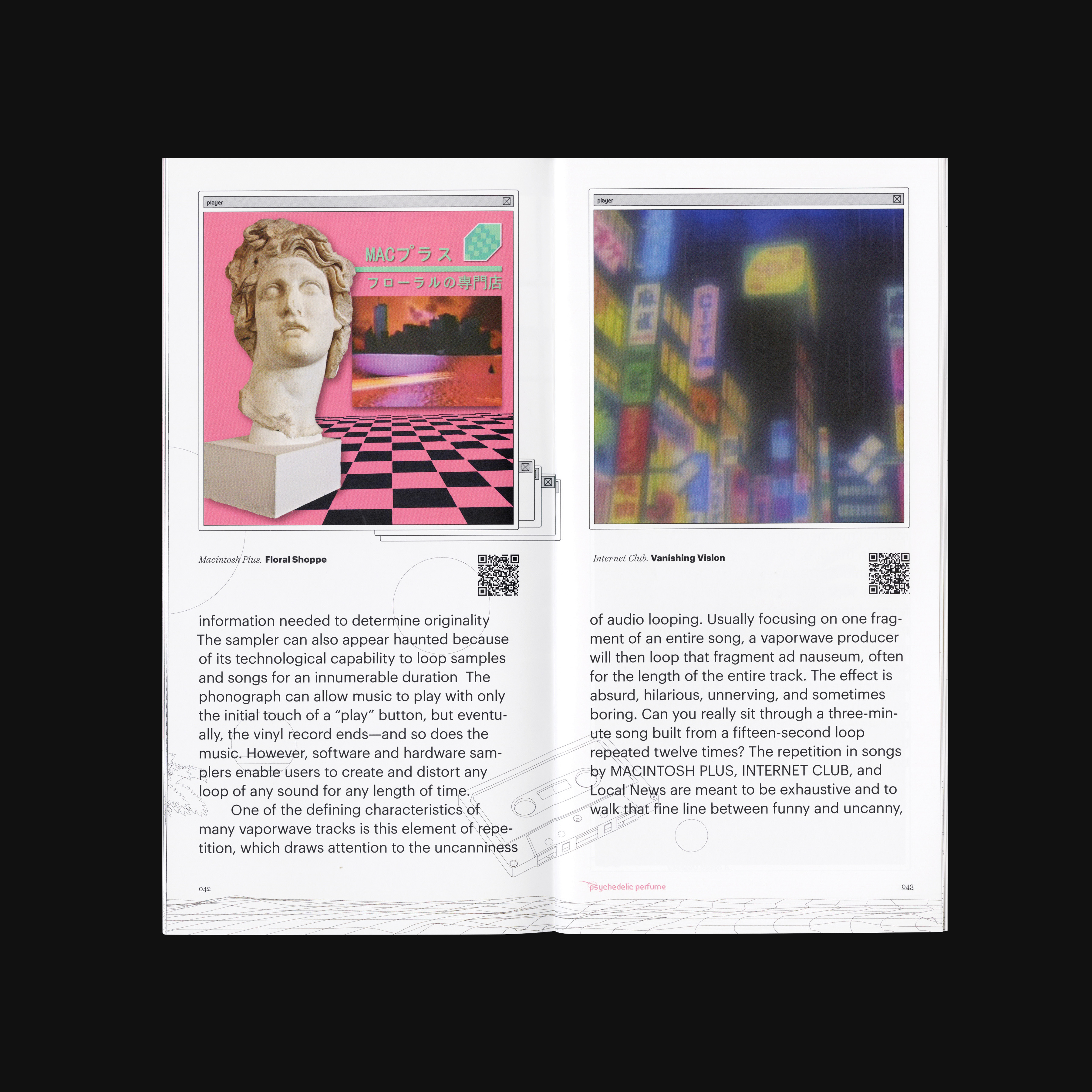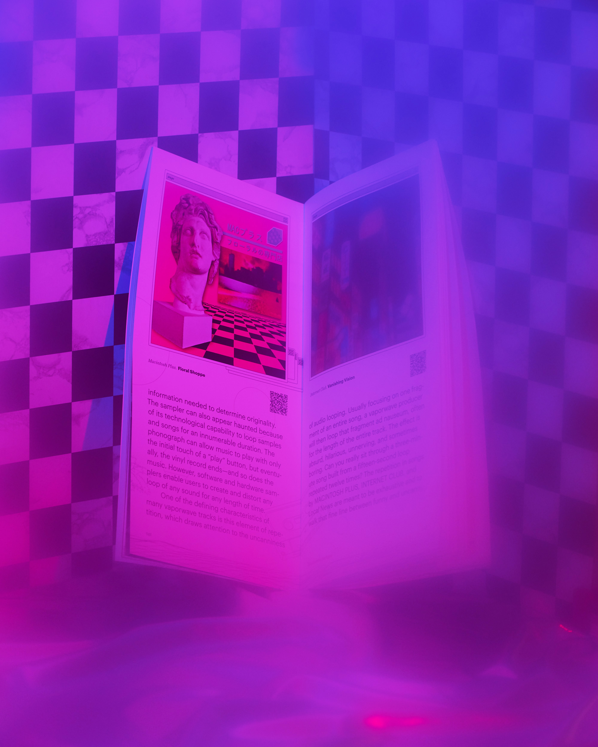 As the core item within this project, this exhibition catalogue demonstrates the context, history, fact, and anatomy of Vaporwave. The overall design inherits its core aesthetics, such as grid, Greek plaster, palm trees, Asian languages, and 90s computer interfaces. Typographical choices are intentionally made to match the uncanny, psychedelic, technological, and dreamy aspects of Vaporwave.
