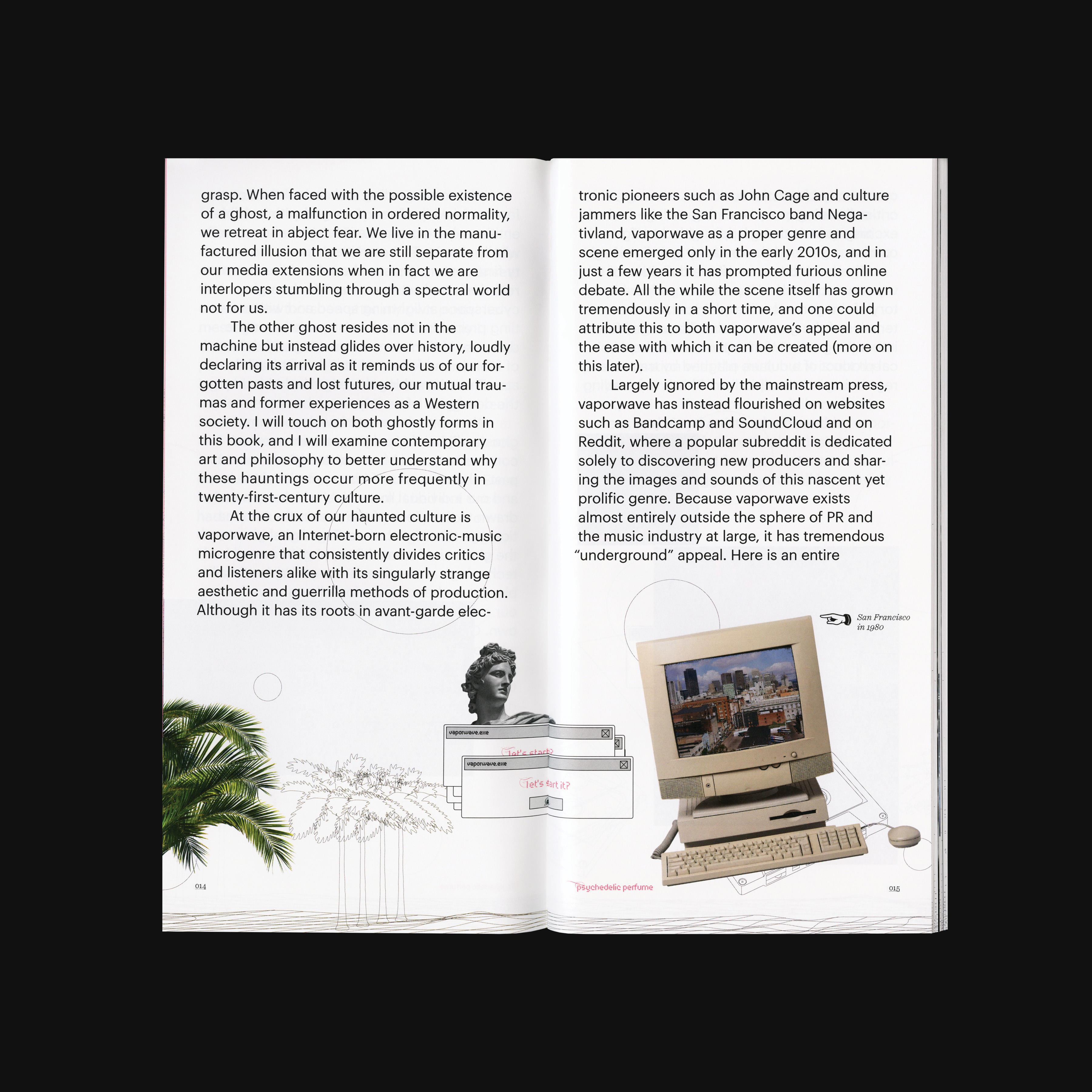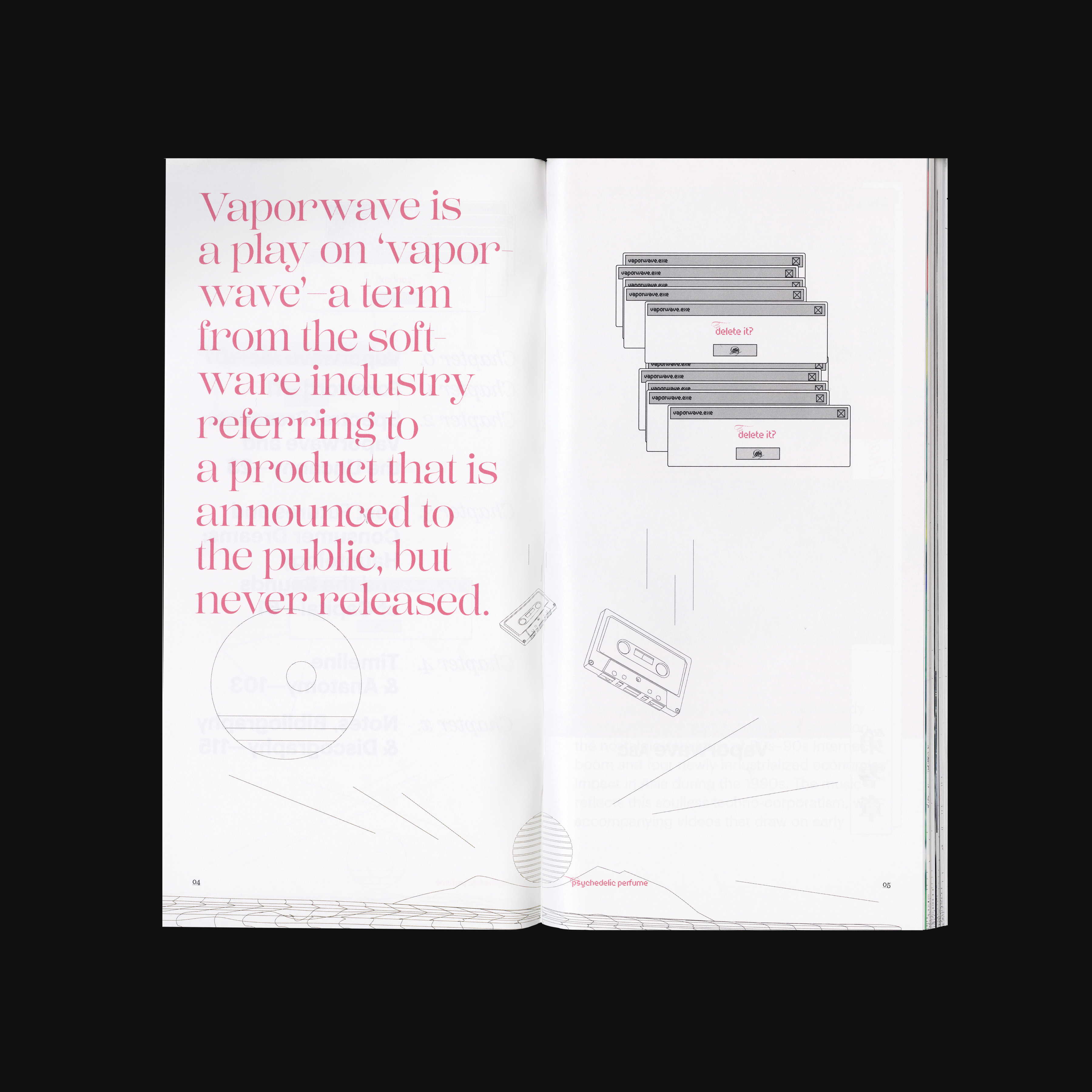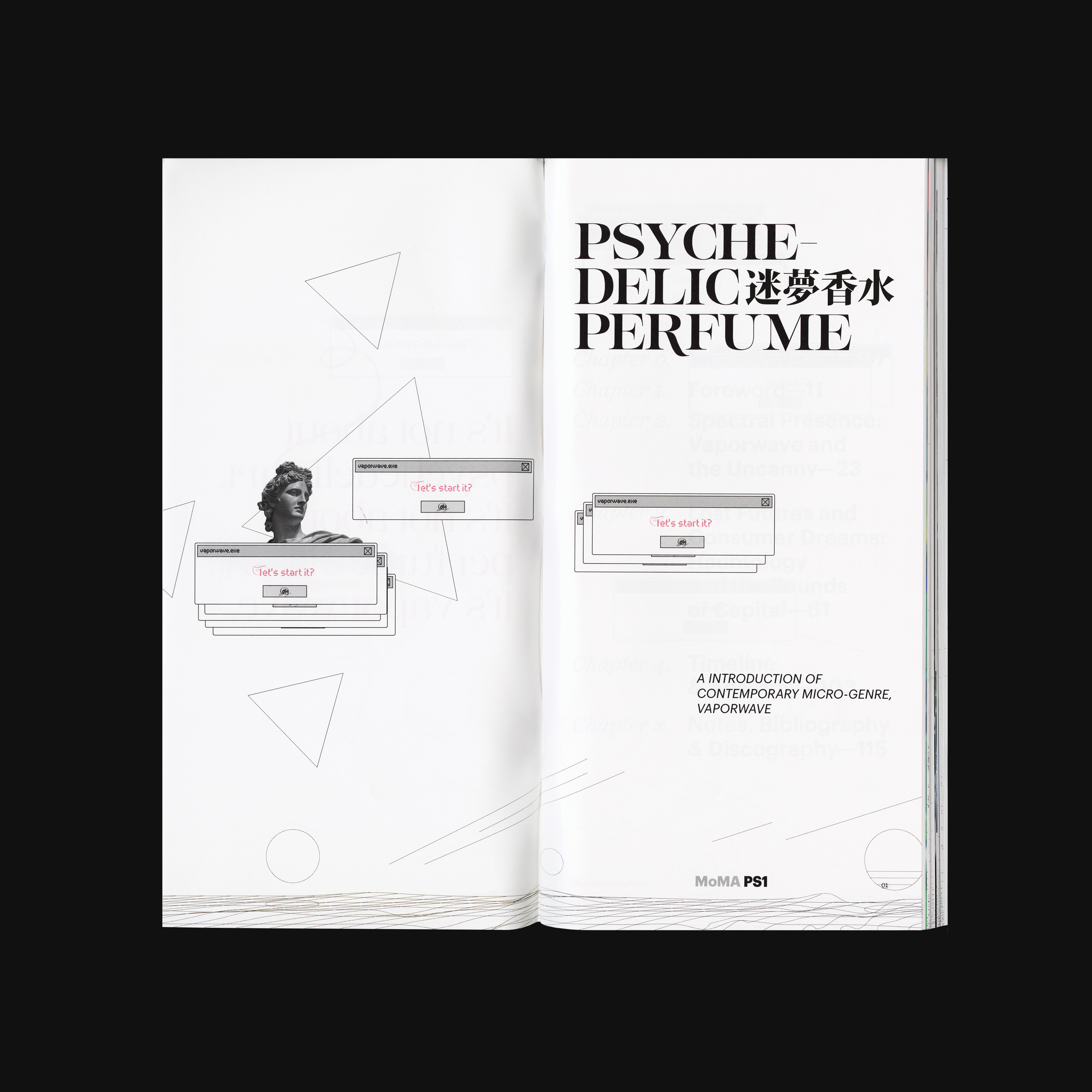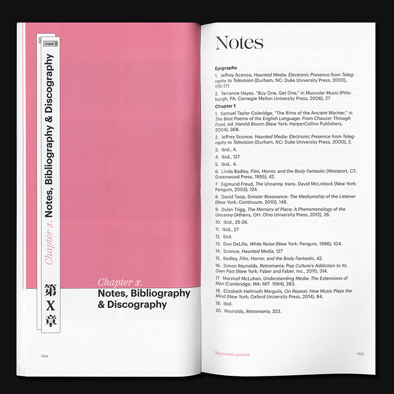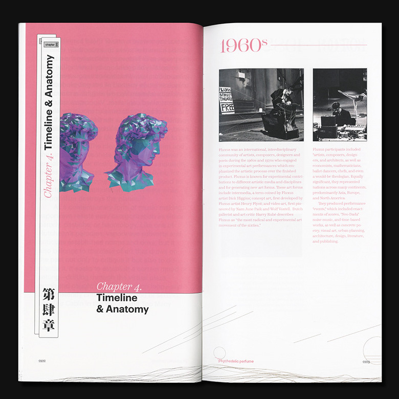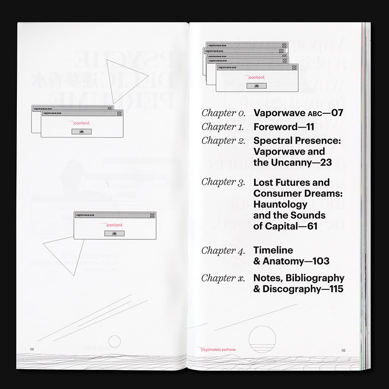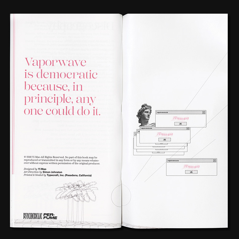 The duality of softness and sharpness present in Lust and its unique visual characteristic matches with Vaporwave’s overall impression. Kozuka Mincho was chosen as the Asian language typeface, to match the visual characteristics including the thick-and-thin contrast of Lust. While the use of Graphik is intentionally bringing out the neutral perspective from the designer, the choice of Scotch as the text typeface in this book aims to create a sense of scholarly and dated feeling to readers. Since 1990s computer interfaces are one of the major visual features in Vaporwave, Stoxina – which unites the essence of digital typefaces with distinguishing swashes – is a no-brainer choice for details. The one replacement of “Psychedelic Perfume” with Digestive and Druk Wide is only a personal twist for the topic, functioning as a small information indicator as well as a decorative element.