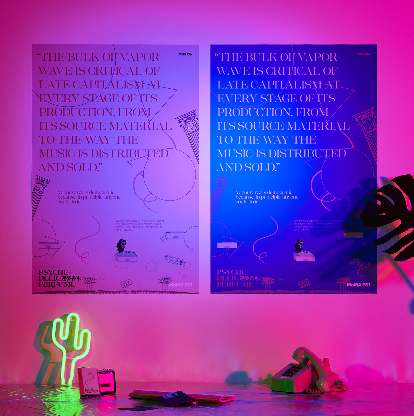 Psychedelic Perfume is the title of a hypothetical exhibition at MoMA PS1. It was conceived as a student project at ArtCenter College of Design, focusing on the editorial design associated with a Vaporwave-themed exhibition. It’s predicting that potentially this contemporary subculture, Vaporwave, and its related art, music, and design will be formally recognized by the broad masses – especially by the Millennial generation – in the future.