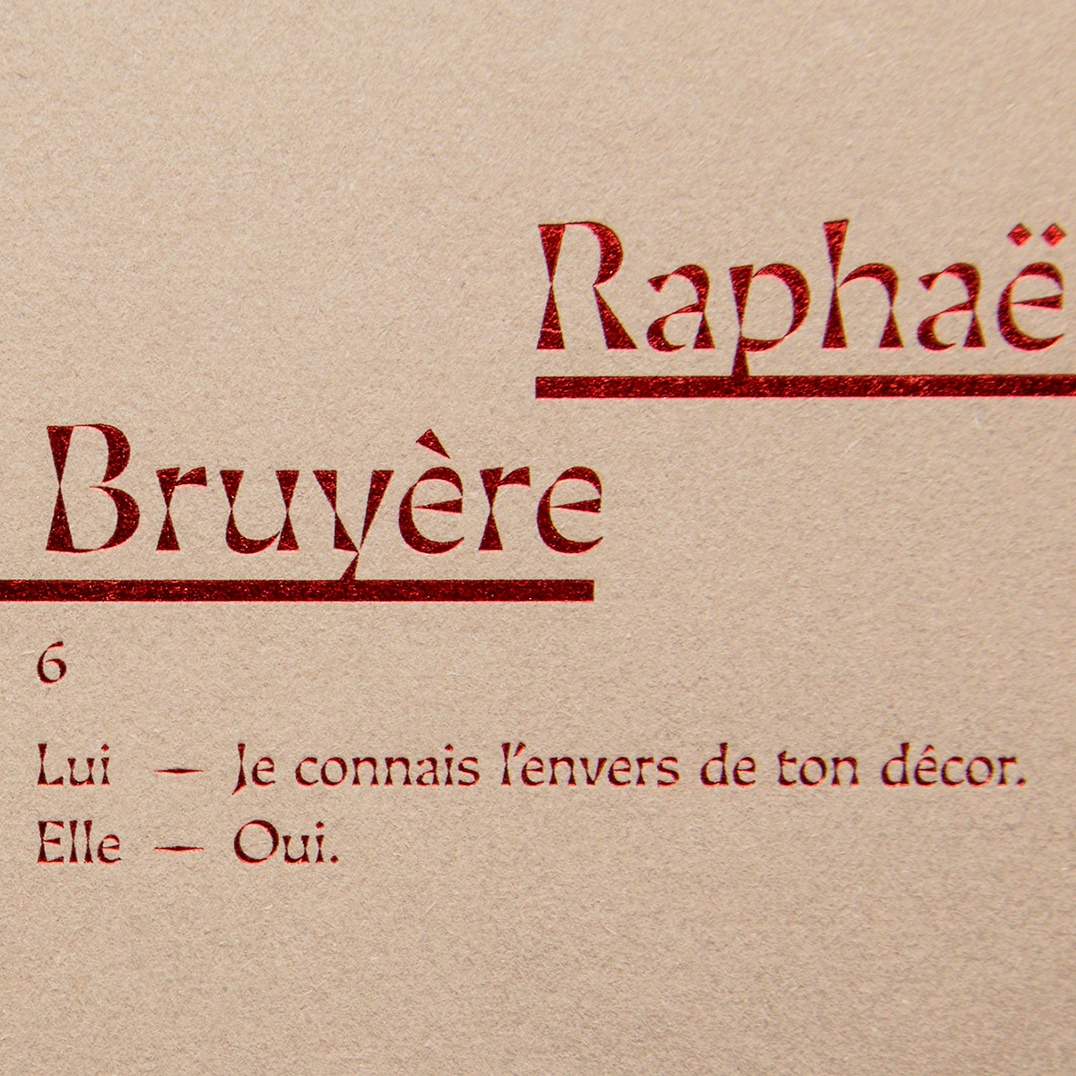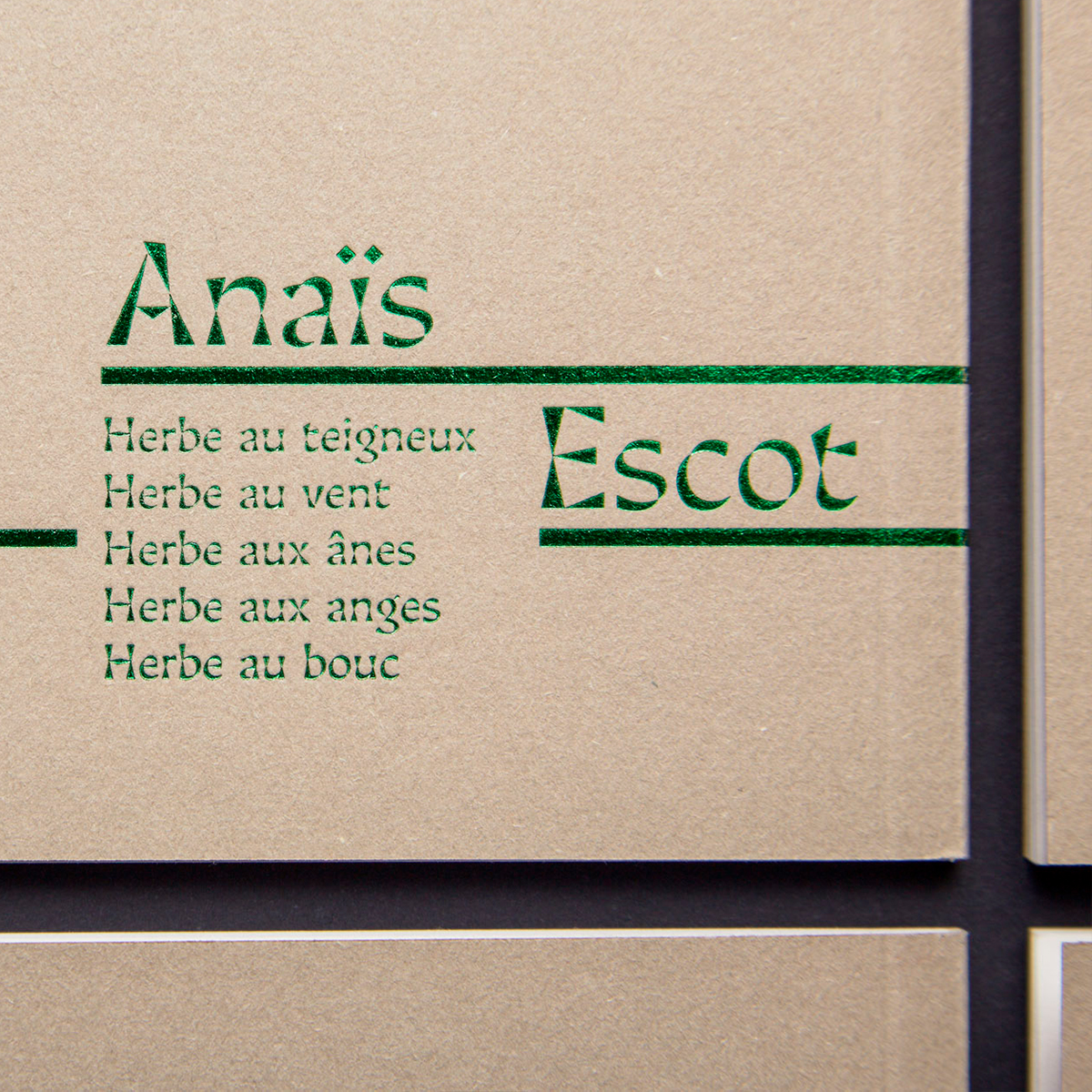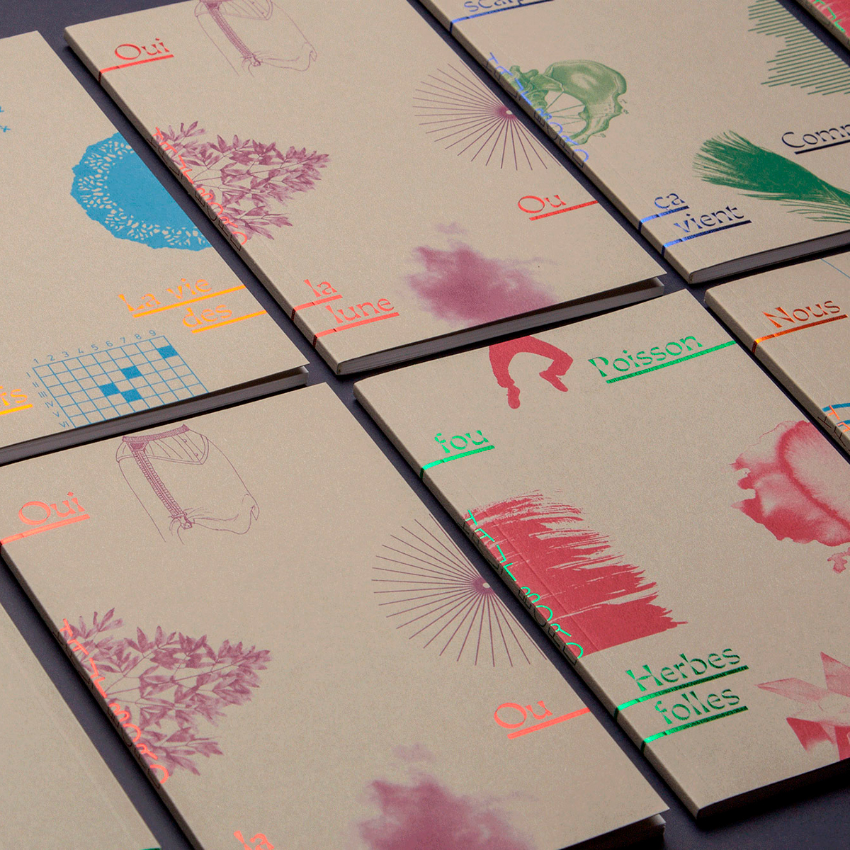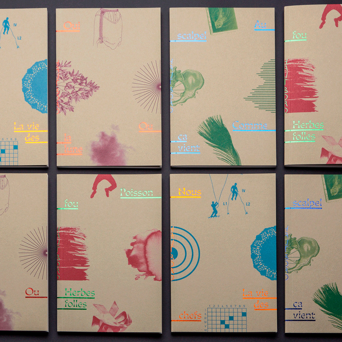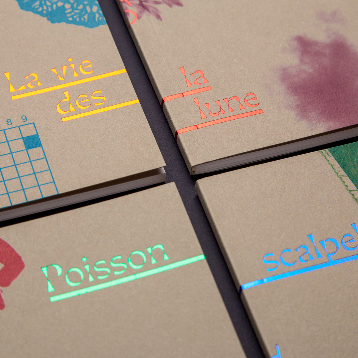 The graphic principle developed for the book covers offers truncated images on the four edges of the front cover. Each work thus constitutes a piece of the whole, like a puzzle. Only the story titles are placed on the cover, linked by line to the authors’ on the back cover. These small objects are simple by their formats and their papers, but precious by their finishes. Inside, each text gives its voice by a singular typographic choice. Thus, the reading can be done in simultaneous echoes, or separately for one of the two texts.