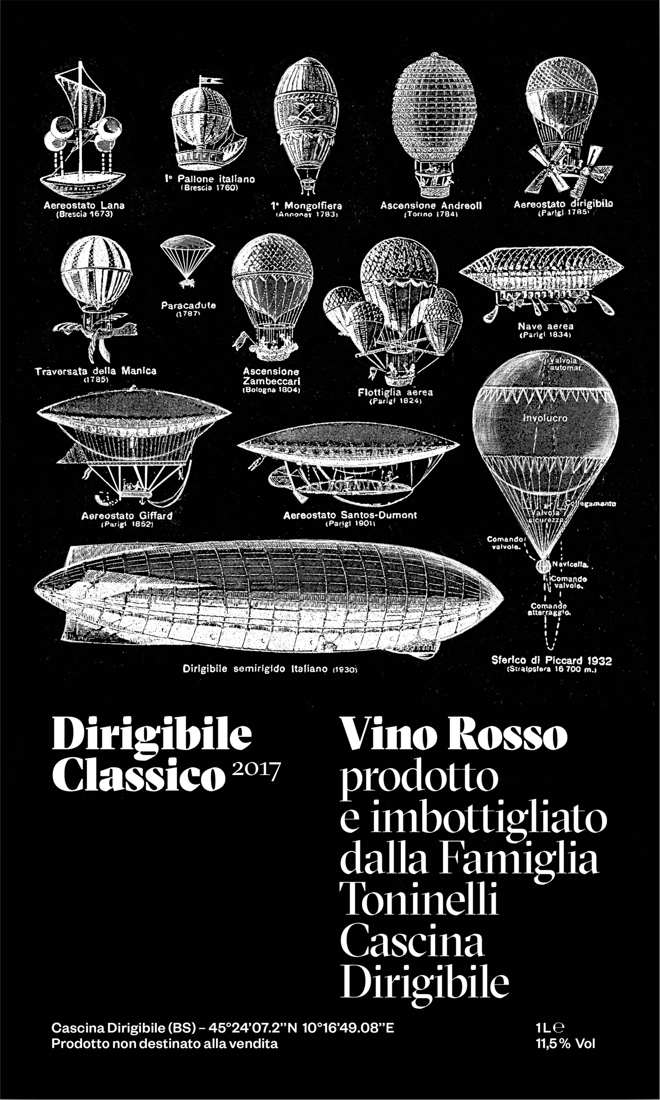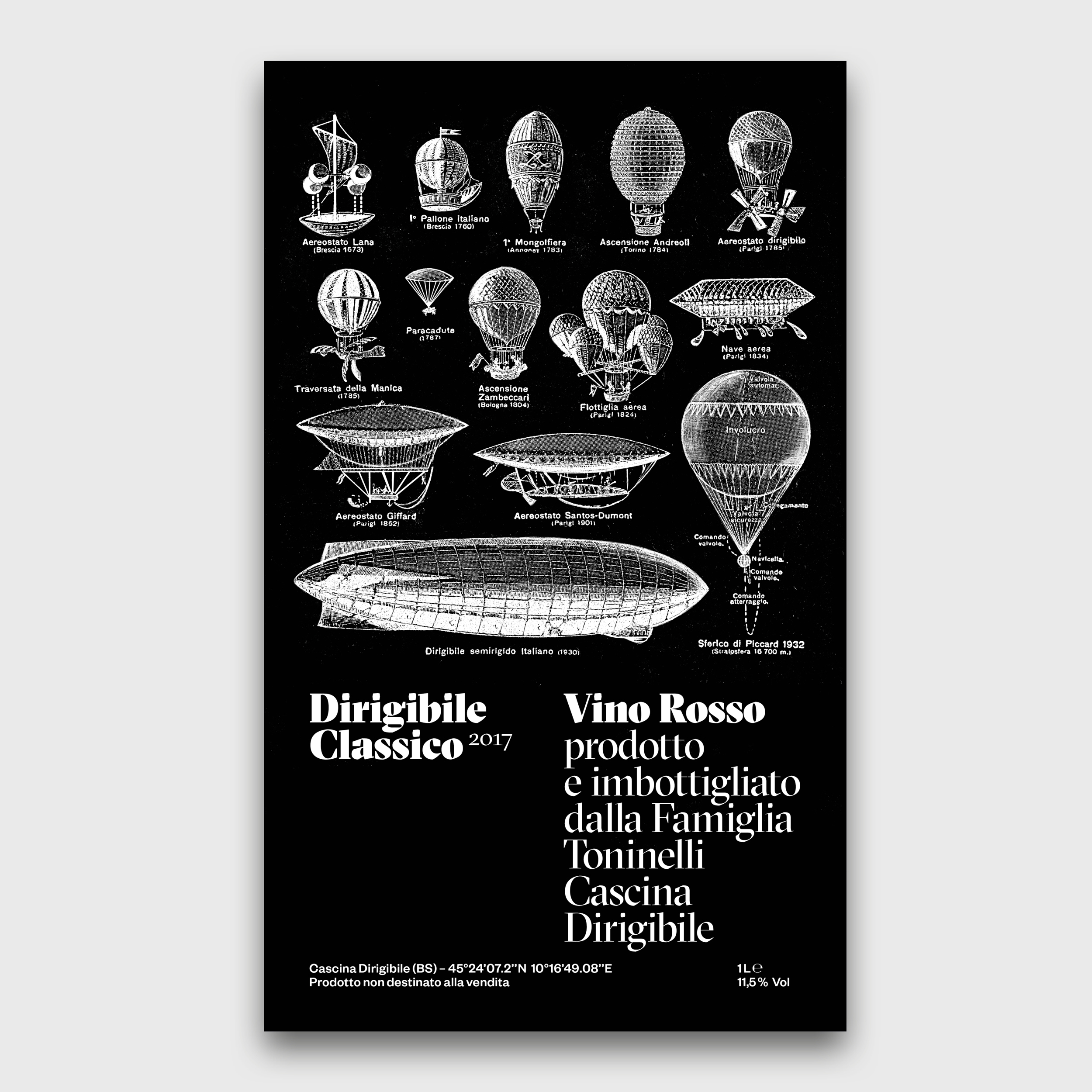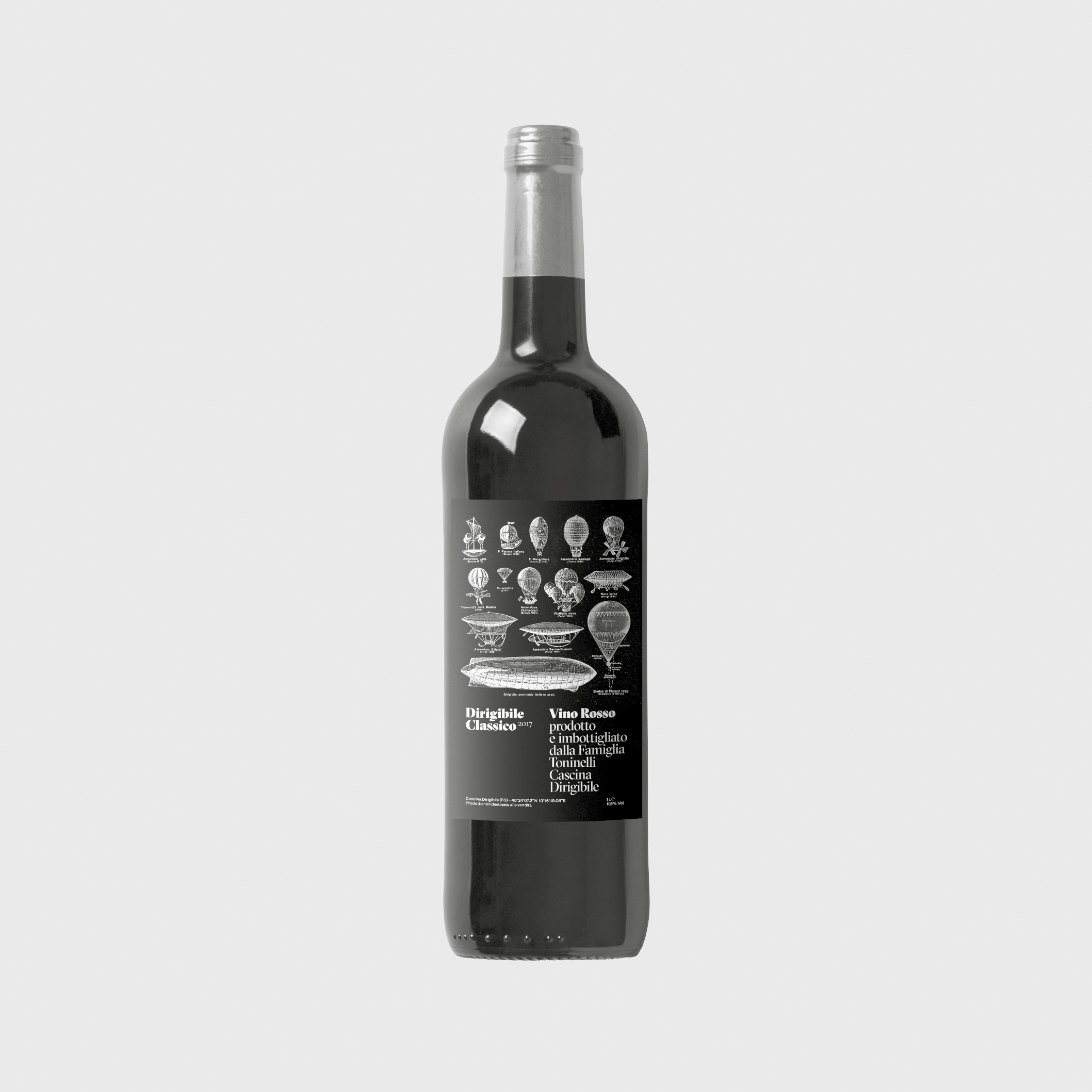Wine label design for Cascina Dirigibile, a winemaker based in Franciacorta area, near Brescia in the north of Italy. “Dirigibile” translates as “Airship”. Grilli Type’s GT Sectra Display and Klim Type Foundry’s Founders Grotesk are used for the typography.