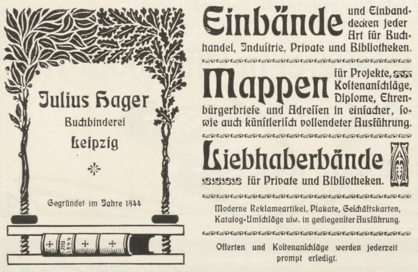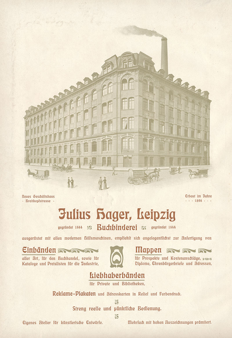 Julius Hager was a prominent, Leipzig-based book binder with a long history. Earlier ads from the company featured another typeface that was trending in the decade before Eckmann, Bradley.