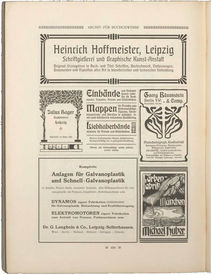 Full-page ad from the 1902 edition of Die Graphischen Künste der Gegenwart, a compilation of Jugendstil art and printing.