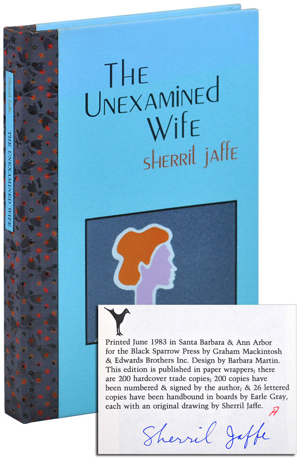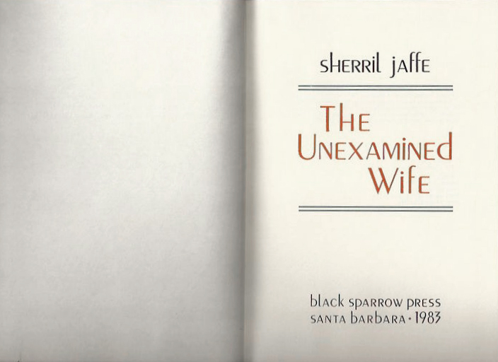 Sherril Jaffe (b. 1945) is an award-winning short story writer and novelist. Her book The Unexamined Wife is about Ann, who “breaks up with her first husband, Ben, and tries to start a new life, first on her own and then married to Abraham.” It was first published by Black Sparrow Press in 1983. For the cover design, Barbara Martin used Peignot, complete with its unusual hybrid lowercase. The interior (shown here is only the colophon) is set in Trump-Mediäval.