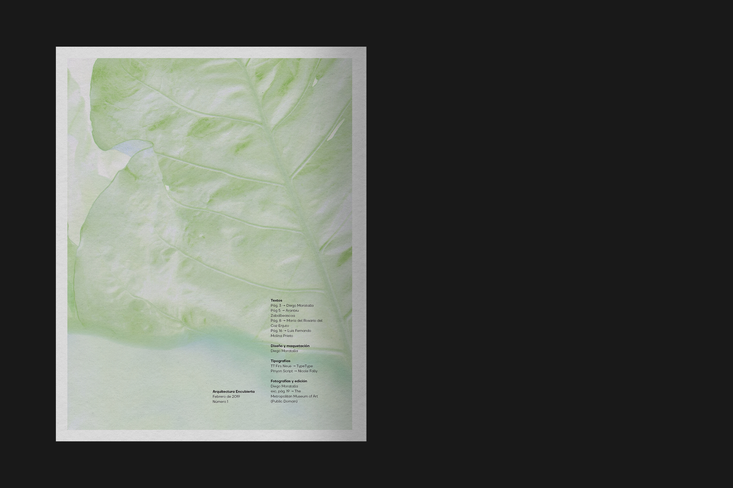 Inspired by the work of Fernando Higueras, all photos were taken by Diego Moratalla, showing how nature invades the visual space of human structures. This contrast is reflected in the typographic choices: While the geometric TT Firs Neue represents solid architecture, Pinyon Script is the organic path that overlaps it, as it usually happens in those spaces where plants and concrete coexist. The text on the angled sticker/barcode on the cover uses a mix of Founders Grotesk and Kennerley.