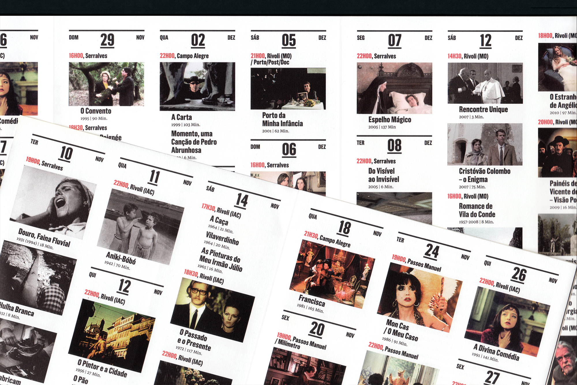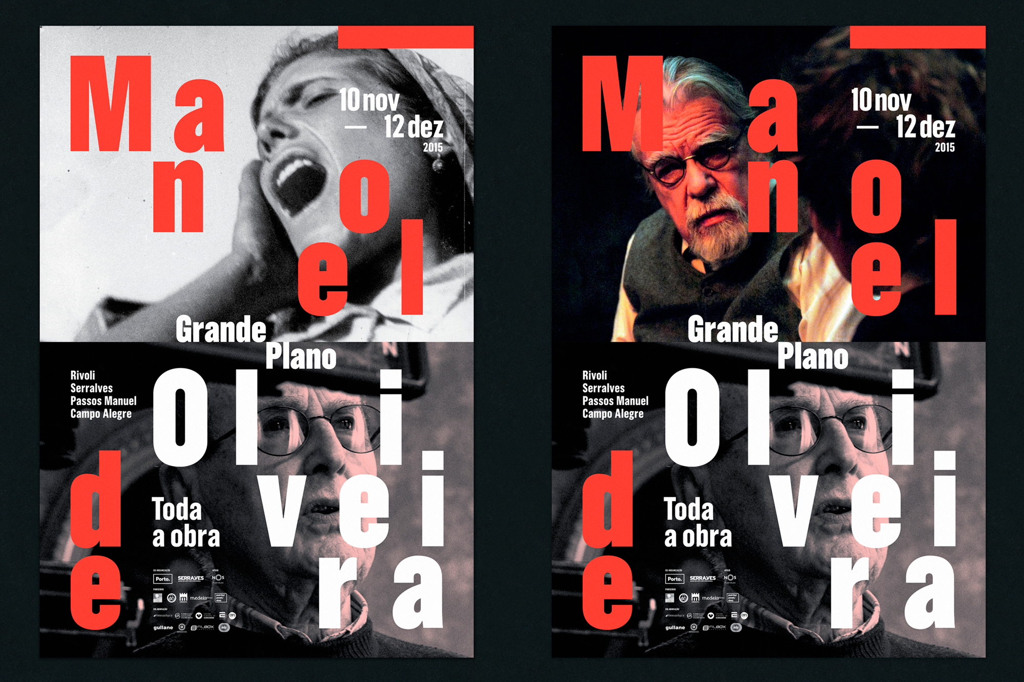 For the event, Porto based studio And Atelier created a whole set (20 different ones) of striking posters structured in two halves: the top half changes for each movie with the name “Manoel” reacting to the featured image; the bottom part, displays the director’s portrait with his last name “de Oliveira”, its letters positioned in the same way on each poster. The deconstructed typographic composition is set with a bold weight of Grotzec Condensed from Feliciano Type Foundry, just like all other information on the posters.