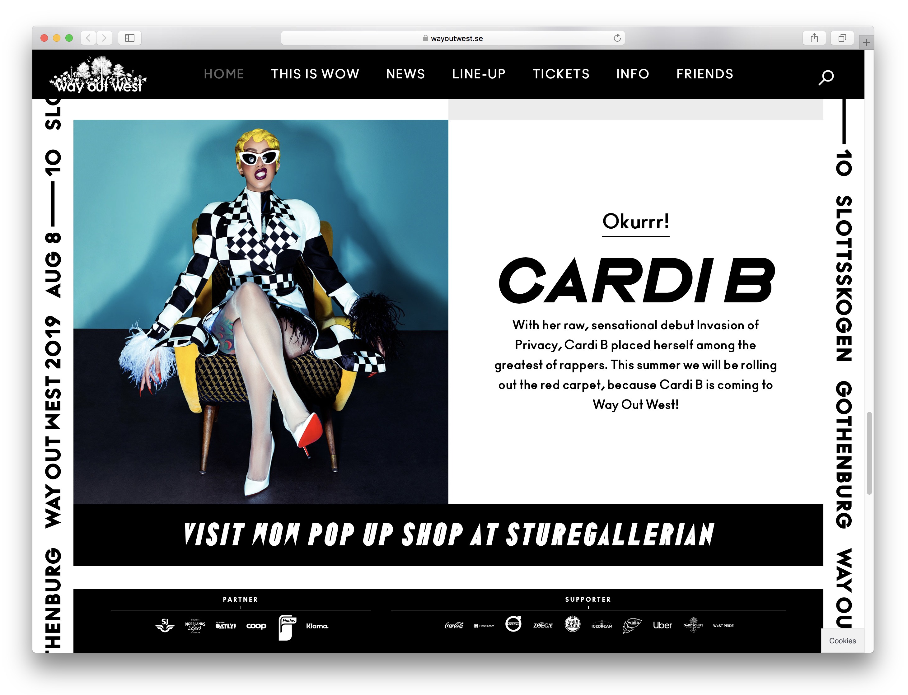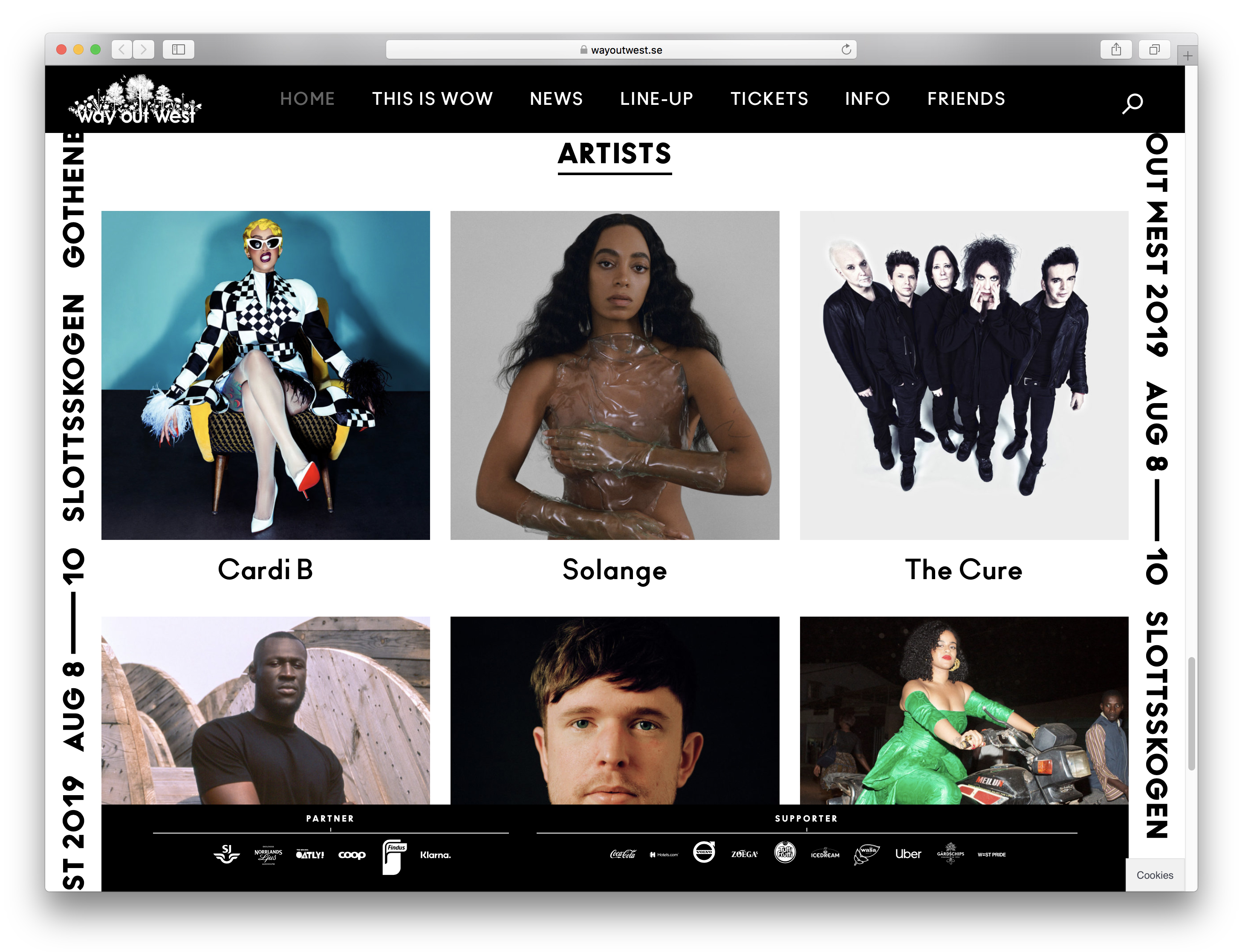 Way Out West is a three-day music festival held in Gothenburg, Sweden, during August that plays host to a variety of popular music artists mainly from the rock, electronic and hip-hop genres. The main festival is complimented with the club concept Stay Out West which features after-hours gigs at various venues around the city.